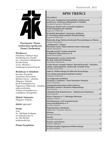 Październik 2011 SPIS TREŚCI Od redakcji ........................................................................................... 2 Z Ks. kan. Grzegorzem Szymańskim, proboszczem parafii p.w. Chrystusa Odkupiciela w Chełmie rozmawia Eugeniusz Wilkowski .............................................................. 2 Stanąć po stronie tych, co musieli nadpłacać Garść listopadowych refleksji Eugeniusz Wilkowski ............................................................................... 4 W służbie Kościołowi i ojczyźnie. Jubileusz O. Gwardiana Maksymiliana Wasilewskiego Eugeniusz Wilkowski .............................................................................. 5 Powinność. Pismo kulturalno-społeczne Ziemi Chełmskiej Wydawca: Parafialny Oddział Akcji Katolickiej przy Parafii pw. Chrystusa Odkupiciela 22-100 Chełm ul. Ks. Mrozka 2 [email protected] Redakcja w składzie: Jarosław Kopiński, Arkadiusz Kwieciński, Barbara Litwin – plastyk, Zbigniew Niderla, Jacek Pomiankiewicz, Eugeniusz Wilkowski - redaktor odpowiedzialny, Tomasz Pomiankiewicz – współpraca (fotografia). Skład i łamanie: Zbigniew Niderla ISSN: 2083-0017 Druk: Arte 21 - 500 Biała Podlaska ul. Dokudowska 1a tel. 502 218 563 [email protected] Pismo bezpłatne Żułowska droga Stefana Kardynała Wyszyńskiego na Ołtarze…. Andrzej Wawryniuk ................................................................................ 8 „Solidarność” i Wołyń Powstanie ruchu. Wprowadzenie stanu wojennego Oksana Samojlenko ................................................................................ 12 Początki parafii i budowa kościoła w Rejowcu Fabrycznym (cz. I) Janina Poturzyńska ................................................................................ 14 Wspomnienie o życiu i twórczości Ks. Kan. Edwarda Wolskiego Stanisława Wiśniewska . ........................................................................ 17 Verba docent, exempla trahunt. Edward Kawęcki – Dyrektor szkoły, samorządowiec, społecznik, świadek wiary Arkadiusz Kwieciński ............................................................................ 19 Adres E. Wilkowskiego do Edwarda Kawęckiego ....................... 22 Czy Chełm potrzebuje katolickiej szkoły? Arkadiusz Kwieciński ............................................................................ 23 Los tragicznie zawikłany Związani z Chełmem – Karol Stanisław Schubert Janusz Ziemiński . .................................................................................. 25 Ariergarda tradycyjnej rzeźby ludowej Stanisław Kosiarz z Kumowa Majorackiego Ilona Sawicka ......................................................................................... 26 Chełmski Park Krajobrazowy - odśmiecanie krajobrazu Paweł Łapiński ....................................................................................... 28 Wiara i Internet cz. 3. Mitologia Internetu Zbigniew Niderla ................................................................................... 29 Dezinformacja, czyli manipulowanie naszą świadomością cz. 4 Jarosław Kopiński ................................................................................... 31 Wspomnienie z Frankonii… Małgorzata i Mirosław Adamscy ........................................................... 33 Wiersze Klaudia Chomicka ................................................................................... 34 Fraszki Stanisław Koszewski............................................................................... 35 Fraszka powyborcza Tadeusz Haftaniuk ................................................................................. 35 Kolejna książka Eugeniusza Wilkowskiego Jarosław Kopiński ................................................................................... 36 Październik 2011 Powinność. Pismo kulturalno-społeczne Ziemi Chełmskiej Od redakcji P oprzedni numer w całości poświęcony został jubileuszowi pięćdziesięciolecia posługi kapłańskiej Ks. Infułata Kazimierza Bownika. Była to okoliczność wyjątkowa. Nie mogła zostać nie zauważona. Podjęcie jej stało się naszym obowiązkiem. W tym numerze staramy się powracać do pierwotnego układu pisma. W międzyczasie do redakcji skierowanych zostało tyle artykułów, że pojawiła się konieczność przesunięcia części ich do kolejnego numeru. Przepraszamy zatem tych autorów, którzy swoje teksty będą mogli czytać dopiero w wydaniu grudniowym. Nie będzie to duży przedział czasowy, niemniej oczekiwanie przedłuży się. Z tychże racji redakcja zrezygnowała także z zamieszczenia Kalendarium ważniejszych wydarzeń z życia parafii i Kroniki wydarzeń bieżących. Z satysfakcją odnotowujemy również fakt zainteresowania się naszym pismem nowych środowisk. W równiej mierze i wobec nich stajemy otwarci. Z Ks. Kan. Grzegorzem Szymańskim, proboszczem parafii p.w. Chrystusa Odkupiciela w Chełmie rozmawia Eugeniusz Wilkowski E.W. Spośród parafii chełmskich nasza należy do młodych. Zgodę na jej utworzenie, ze strony władz komunistycznych, Ks. Abp B. Pylak otrzymał w stanie wojennym. Parafianie musieli podołać olbrzymiemu wysiłkowi budowy świątyni. Dzisiaj pulsuje dynamicznym życiem. Na ile przedsięwzięcia podejmowane przy tej parafii mają szerszy kontekst, środowiskowy, miejski, regionalny? Ks. Proboszcz. Nasza parafia jest jedną z największych na terenie Chełma. Posiada znakomity potencjał ludzki, w tym intelektualny. 2|Strona Jest on wykorzystywany nie tylko w ramach przedsięwzięć parafialnych, ale i szerszych. Na organizowane spotkania w kościele z ciekawymi ludźmi przychodzą mieszkańcy z terenu całego miasta, a nawet spoza. Podobnie dzieje się, gdy występują chóry, zespoły śpiewacze z terenu Ukrainy i Białorusi, czy liturgiczne spotkania z przedstawicielami Kościołów katolickich z Wołynia, w tym z Ks. Bp Marcjanem Trofimiakiem, Ordynar