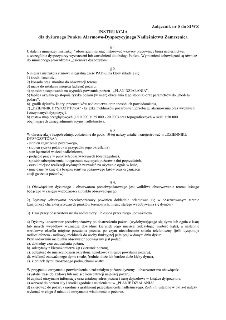 Załącznik nr 5 do SIWZ INSTRUKCJA dla dyżurnego Punktu Alarmowo-Dyspozycyjnego Nadleśnictwa Zamrzenica § 1. Ustalenia niniejszej „instrukcji" obowiązani są znać i stosować wszyscy pracownicy biura nadleśnictwa, a szczególnie dyspozytorzy wyznaczeni lub zatrudnieni do obsługi Punktu. Wymienieni zobowiązani są również do sumiennego prowadzenia „dziennika dyspozytora". § 2. Niniejsza instrukcja stanowi integralną część PAD-u, na który składają się: 1) środki łączności, 2) konsola oraz monitor do obserwacji terenu 3) mapa do ustalania miejsca (adresu) pożaru, 4) sposób postępowania na wypadek powstania pożaru - „PLAN DZIAŁANIA", 5) tablica aktualnego stopnia ryzyka pożaru (w miarę określania tego stopnia) oraz parametrów do „modelu pożaru", 6) grafik dyżurów kadry, pracowników nadleśnictwa oraz sposób ich powiadamiania, 7) „DZIENNIK DYSPOZYTORA" - książka meldunków pożarowych, przebiegu alarmowania oraz wydanych i otrzymanych dyspozycji, 8) zestaw map przeglądowych (1:10 000,1: 25 000 - 20 000) oraz topograficznych w skali 1:50 000 obejmujących zasięg administracyjny nadleśnictwa, § 3. W okresie akcji bezpośredniej, codziennie do godz. 10-tej należy ustalić i zarejestrować w „DZIENNIKU DYSPOZYTORA": - stopień zagrożenia pożarowego, - stopień ryzyka pożaru (w przypadku jego określania), - stan łączności w sieci nadleśnictwa, - podjęcie pracy w punktach obserwacyjnych (dostrzegalnie), - sposób zabezpieczenia i dogaszania czynnych pożarów z dni poprzednich, - czas i miejsce realizacji wydanych zezwoleń na używanie ognia w lesie, - inne dane (ważne dla bezpieczeństwa pożarowego lasów oraz organizacji akcji gaszenia pożarów). § 4. 1) Obowiązkiem dyżurnego - obserwatora przeciwpożarowego jest wnikliwe obserwowanie terenu leśnego będącego w zasięgu widoczności z punktu obserwacyjnego. 2) Dyżurny -obserwator przeciwpożarowy powinien dokładnie orientować się w obserwowanym terenie (znajomość charakterystycznych punktów terenowych, miejsc stałego wydobywania się dymów). 3) Czas pracy obserwatora ustala nadleśniczy lub osoba przez niego upoważniona. 4) Dyżurny -obserwator przeciwpożarowy po dostrzeżeniu pożaru (wydobywającego się dymu lub ognia z lasu) lub innych wypadków wyznacza dokładnie kierunek jego miejsca (odczytując wartość kąta), a następnie wzrokowo określa miejsce powstania pożaru, po czym niezwłocznie składa telefoniczny (jeśli dysponuje radiotelefonem - radiowy) meldunek do osoby funkcyjnej pełniącej w danym dniu dyżur. Przy nadawaniu meldunku obserwator obowiązany jest podać: a). dokładny czas zauważenia pożaru, b). odczytany z kierunkomierza kąt (kierunek pożaru), c). odległość do miejsca pożaru określona wzrokowo (miejsce powstania pożaru), d). wielkość zauważonego dymu (małe, średnie, duże lub bardzo duże kłęby dymu), e). kierunek dymu znoszonego podmuchami wiatru. W przypadku otrzymania potwierdzenia o zaistniałym pożarze dyżurny – obserwator ma obowiązek: a) ustalić trasę dojazdową lub miejsce koncentracji najbliżej pożaru, b) zapisać otrzymane informacje oraz ustalony adres pożaru i trasę dojazdową w książce dyspozytora, c) wezwać do pożaru siły i środki zgodnie z ustaleniami w „PLANIE DZIAŁANIA", d) skierować do pożaru (zgodnie z grafikiem) przedstawiciela nadleśniczego. Zadania ustalone w pkt a-d należy wykonać w ciągu 5 minut od otrzymania wiadomości o pożarze. W dalszej kolejności należy: - zgłosić pożar do właściwego rejonowego stanowiska kierowania PSP, - zawiadomić o zaistniałym pożarze nadleśniczego, leśniczego, policje oraz rdLP, - zorganizować łączność z miejscem prowadzonych działań ratowniczo-gaśniczych, - wykonywać polecenia przedstawiciela nadleśniczego oraz kierującego działaniem ratowniczym. Każdą otrzymaną wiadomość o pogorszeniu się sytuacji przy pożarze natychmiast przekazać: - rejonowemu stanowisku kierowania PSP, - nadleśniczemu, - rd LP. 5) Dalszym obowiązkiem obserwatora jest ciągłe obserwowanie zauważonego wypadku, zgłaszanie zmian osobie funkcyjnej oraz ich zapisywanie. 6) W wypadku awarii posiadanych środków łączności obserwator po zauważeniu dymu postępuje zgodnie z zasadami podanymi w pkt 5 i 6, udaje się natychmiast najkrótszą drogą do telefonu, składa meldunek, po czym powraca na punkt obserwacyjny. 7) Dyżurnemu - obserwatorowi nie wolno: a). przystępować do pracy będąc pod wpływem alkoholu lub innych środków o podobnym działaniu, b). pić napojów alkoholowych w czasie pełnienia dyżuru, c). spać w czasie służby, d). samowolnie opuszczać posterunku. 8) W wypadku wystąpienia bardzo burz z wyładowaniami atmosferycznymi – dyżurny -obserwator zgłasza zaistniałe zjawiska osobie funkcyjnej i postępuje według otrzymanych poleceń. POSTANOWIENIA KARNE W wypadku stwierdzenia niesumiennego wywiązywania się z powierzonych obowiązków, w stosunku do obserwatora zostaną zastosowane następujące sankcje: 1). dyscyplinarne zwolnienie z pracy, 2). skierowanie sprawy na drogę postępowania karnego.