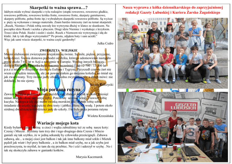 Skarpetki to ważna sprawa…? Jakbym miała wybrać skarpetki z tylu rodzajów (stopki rowerowe, rowerowe gładkie, rowerowe półfrotte, rowerowe krótka frotte, rowerowe frotte, skarpety garniturowe, skarpety półfrotte, pełna frotte itp.) wybrałabym skarpetki rowerowe półfrotte. Są wyższe a pięty są wykonane z innego materiału. Znam bardzo śmieszny żart na temat skarpetek: ,,Rusek, Niemiec i Polak robią zawody kto wytrzyma dłużej w klatce ze skunksem. Na początku idzie Rusek i ucieka z płaczem. Drugi idzie Niemiec i wyskakuje z krzykiem. Trzeci idzie Polak .Siedzi i siedzi i siedzi. Rusek z Niemcem nie wytrzymują i idą do klatki. Jak ty tak długo wytrzymałeś?'' Po prostu, zdjąłem buty i sam uciekł.'' Więc jak sami wiecie skarpetki, to ważna część garderoby! Julka Cedro ZWIERZĘTA WIEJSKIE Moimi ulubionymi zwierzętami wiejskimi są świnie. Są miłe, piękne, przyjazne, lubią dzieci. Świnia domowa pochodzi od dzika, którego udomowienie nastąpiło przed około 7 tys lat w Azji a następnie w Europie. Według innych badaczy domestykacja tego gatunku była znacznie wcześniej – już 12 700 - 13 000 lat p.n.e a miało to miejsce w dorzeczu Eufratu i Tygrysu. Przyszedł czas na żart nie wiem czy będzie śmieszny, ale jak powiedziałem go mojemu koledze, to śmiał się jak zwariowany. Trzy świnie jadły obiad. Jedna zwymiotowała, a druga mówi: nie dokładaj, bo nie zjemy. Wojtek Kulczycki Moja poranna rutyna Zawsze wstaję o godzinie szóstej pięćdziesiąt, dlatego żebym w około dziesięć minut zdążyła ubrać się, umyć zęby. Potem idę uczesać włosy i zawsze robię kucyka. Następnie idę dać moim świnką morskim jeść. Potem robię sobie śniadanie do szkoły, najczęściej dwa tosty i jabłko. Biorę też wodę. I potem około siódmej dwadzieścia-trzydzieści jadę do szkoły. I to była moja poranna rutyna Wioleta Krzesińska Wariacje mojego kota Kiedy byłam z całą rodziną u cioci i wujka zabraliśmy też ze sobą nasze koty: Czesię i Miecia . Byliśmy tam trzy dni i tego drugiego dnia Czesia i Miecio ganiali się tak szybko, że w jedną sekundę by człowieka prześcignęli. Zabawa zabawą, ale... u mojej cioci jest balkon i tak jak inne balkony miał szkło i Mietek pędził jak wiatr i był przy balkonie , a że balkon miał szybę, no a jak szyba jest przeźroczysta, to myślał, że tam da się przebiec. No i cóż i uderzył w szybę . No i tak się skończyła zabawa w ganianki kotków. Marysia Kaczmarek Nasza wyprawa z kółka dziennikarskiego do zaprzyjaźnionej redakcji Gazety Lubuskiej i Kuriera Żarsko Żagańskiego