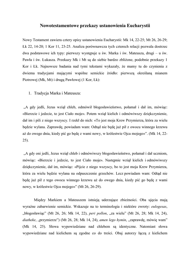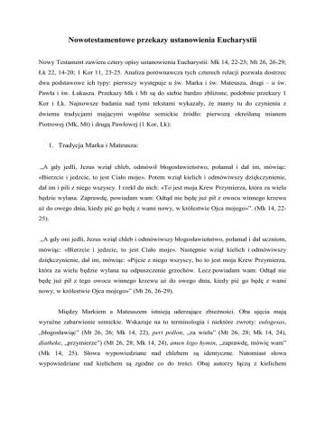 Nowotestamentowe przekazy ustanowienia Eucharystii Nowy Testament zawiera cztery opisy ustanowienia Eucharystii: Mk 14, 22-25; Mt 26, 26-29; Łk 22, 14-20; 1 Kor 11, 23-25. Analiza porównawcza tych czterech relacji pozwala dostrzec dwa podstawowe ich typy: pierwszy występuje u św. Marka i św. Mateusza, drugi – u św. Pawła i św. Łukasza. Przekazy Mk i Mt są do siebie bardzo zbliżone, podobnie przekazy 1 Kor i Łk. Najnowsze badania nad tymi tekstami wykazały, że mamy tu do czynienia z dwiema tradycjami mającymi wspólne semickie źródło: pierwszą określaną mianem Piotrowej (Mk, Mt) i drugą Pawłowej (1 Kor, Łk): 1. Tradycja Marka i Mateusza: „A gdy jedli, Jezus wziął chleb, odmówił błogosławieństwo, połamał i dał im, mówiąc: «Bierzcie i jedzcie, to jest Ciało moje». Potem wziął kielich i odmówiwszy dziękczynienie, dał im i pili z niego wszyscy. I rzekł do nich: «To jest moja Krew Przymierza, która za wielu będzie wylana. Zaprawdę, powiadam wam: Odtąd nie będę już pił z owocu winnego krzewu aż do owego dnia, kiedy pić go będę z wami nowy, w królestwie Ojca mojego»”. (Mk 14, 2225). „A gdy oni jedli, Jezus wziął chleb i odmówiwszy błogosławieństwo, połamał i dał uczniom, mówiąc: «Bierzcie i jedzcie, to jest Ciało moje». Następnie wziął kielich i odmówiwszy dziękczynienie, dał im, mówiąc: «Pijcie z niego wszyscy, bo to jest moja Krew Przymierza, która za wielu będzie wylana na odpuszczenie grzechów. Lecz powiadam wam: Odtąd nie będę już pił z tego owocu winnego krzewu aż do owego dnia, kiedy pić go będę z wami nowy, w królestwie Ojca mojego»” (Mt 26, 26-29). Między Markiem a Mateuszem istnieją uderzające zbieżności. Oba ujęcia mają wyraźne zabarwienie semickie. Wskazuje na to terminologia i niektóre zwroty: eulogesas, „błogosławiąc” (Mt 26, 26; Mk 14, 22), peri pollon, „za wielu” (Mt 26, 28; Mk 14, 24), diatheke, „przymierze”) (Mt 26, 28; Mk 14, 24), amen lego hymin, „zaprawdę, mówię wam” (Mk 14, 25). Słowa wypowiedziane nad chlebem są identyczne. Natomiast słowa wypowiedziane nad kielichem są zgodne co do treści. Obaj autorzy łączą z kielichem ofiarniczy zwrot hyper peri, „za wielu”. Ewangelista Mateusz rozbudowuje go nieco, dodając: „na odpuszczenie grzechów”. Relacja Mateusza jest zależna od relacji Marka. Widać w niej pracę teologiczną i stylistyczną pierwszego Ewangelisty. Zabarwienie semickie obu tych ujęć, widoczne szczególnie u św. Marka, może świadczyć o tym, że Marek swoją relację o Eucharystii zaczerpnął najprawdopodobniej z tradycji jerozolimskiej, pochodzącej ze środowisk judeochrześcijańskich. 2. Tradycja Pawła i Łukasza: „Ja bowiem otrzymałem od Pana to, co wam przekazałem, że Pan Jezus tej nocy, kiedy został wydany, wziął chleb i dzięki uczyniwszy, połamał i rzekł: «To jest Ciało moje za was [wydane]. Czyńcie to na moją pamiątkę!». Podobnie, skończywszy wieczerzę, wziął kielich, mówiąc: «Ten kielich jest Nowym Przymierzem we Krwi mojej. Czyńcie to, ile razy pić będziecie, na moją pamiątkę!»” (1 Kor 11, 23-25). „A gdy nadeszła pora, zajął miejsce u stołu i Apostołowie razem z Nim. Wtedy rzekł do nich: «Gorąco pragnąłem spożyć tę Paschę z wami, zanim będę cierpiał. Albowiem powiadam wam: Już jej spożywać nie będę, aż się spełni w królestwie Bożym». Potem wziął kielich i odmówiwszy dziękczynienie, rzekł: «Weźcie go i podzielcie między siebie; albowiem powiadam wam: odtąd nie będę już pił z owocu winnego krzewu, aż przyjdzie królestwo Boże». Następnie wziął chleb, odmówiwszy dziękczynienie połamał go i podał, mówiąc: «To jest Ciało moje, które za was będzie wydane: to czyńcie na moją pamiątkę!». Tak samo i kielich po wieczerzy, mówiąc: «Ten kielich to Nowe Przymierze we Krwi mojej, która za was będzie wylana »” (Łk 22, 14-20). W ujęciu Pawła i Łukasza także mamy szereg zbieżności. Jezus wziął chleb i odmówił „dziękczynienie” (eucharistesas), a nie „błogosławieństwo” (eulogeses), jak w tradycji Marka i Mateusza. W swej treści bardzo zbliżone są słowa wypowiedziane nad chlebem i kielichem. U św. Łukasza pełniejsza jest formuła ofiarnicza: „które za was będzie wydane”; św. Paweł wyraża to krócej: „za was”. Występujący w obu formułach zwrot „za was”, który ma sens ofiarniczy, wskazuje na identyczność treści. Przy słowach nad kielichem jedynie Łukasz dodaje: „która za was będzie wylana”. Nakaz Jezusa: „To czyńcie na moją pamiątkę” znajduje się tylko u św. Łukasza (jeden raz) i u św. Pawła (dwa razy). Jedna z istotnych różnic pomiędzy wspomnianymi przekazami polega na tym, że Jezus – według Apostoła Pawła – mówi wprost o spożywaniu krwi. Praktyki tej natomiast surowo zakazywało Prawo żydowskie (Rdz 9, 3n; Kpł 17, 10-14; Dz 15, 29). W formule Pawła i Łukasza ustanowienie Eucharystii nastąpiło „po wieczerzy” i łączyło się wyraźnie ze śmiercią Jezusa. Ze zbieżności tych wynika, że relacje te są od siebie zależne i że obydwie pochodzą z tego samego źródła albo z tego samego kręgu tradycji. Jeśli formuły te pochodzą z tej samej tradycji, to musiały być sformułowane wiele lat przed powstaniem Pierwszego Listu do Koryntian. Najprawdopodobniej tradycja ta pochodzi ze środowiska nawróconych na chrześcijaństwo pogan z Antiochii Syryjskiej. Wszystkie te cztery relacje za środowisko życiowe (Sitz im Leben) zdają się mieć potrzeby liturgiczne Kościoła, odtwarzają tzw. tradycję liturgiczną albo kultyczną. Kontekst relacji Pawła mówi wyraźnie o sprawowaniu liturgii (1 Kor 11, 2-34). Natomiast do znamion stylu liturgicznego u synoptyków należą: symetria (jeść – pić, ciało – krew) oraz styl hieratyczny całej relacji. Porównanie ze sobą obu tradycji pozwala wyodrębnić s