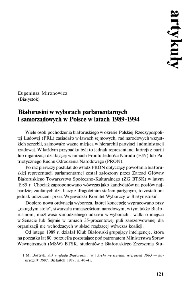 Eugeniusz Mironowicz (Białystok) Białorusini w wyborach parlamentarnych i samorządowych w Polsce w latach 1989-1994 Wiele osób pochodzenia białoruskiego w okresie Polskiej Rzeczypospoli tej Ludowej (PRL) zasiadało w ławach sejmowych, rad narodowych wszyst kich szczebli, zajmowało ważne miejsca w hierarchii partyjnej i administracji rządowej. W każdym przypadku byli to jednak reprezentanci którejś z partii lub organizacji działającej w ramach Frontu Jedności Narodu (FJN) lub Pa triotycznego Ruchu Odrodzenia Narodowego (PRON). Po raz pierwszy postulat do władz PRON dotyczący powołania białoru skiej reprezentacji parlamentarnej został zgłoszony przez Zarząd Główny Białoruskiego Towarzystwa Społeczno-Kulturalnego (ZG BTSK) w lutym 1985 r. Chociaż zaproponowano wówczas jako kandydatów na posłów naj bardziej zaufanych działaczy z długoletnim stażem partyjnym, to zostali oni 1 jednak odrzuceni przez Wojewódzki Komitet Wyborczy w Białymstoku . Dopiero nowa ordynacja wyborcza, której koncepcję wypracowano przy „okrągłym stole", stwarzała mniejszościom narodowym, w tym także Biało rusinom, możliwość samodzielnego udziału w wyborach i walki o miejsca w Senacie lub Sejmie w ramach 35-procentowej puli zarezerwowanej dla organizacji nie wchodzących w skład rządzącej wówczas koalicji. Od lutego 1989 r. działał Klub Białoruski grupujący inteligencję, która na początku lat 80. porzuciła pozostające pod patronatem Ministerstwa Spraw Wewnętrznych (MSW) BTSK, studentów z Białoruskiego Zrzeszenia Stu1 M. Bołtryk, Jak wygląda Białorusin, [w:] Archi ny sszytak, wierasień 1983 — kastrycznik 1987, Biełastok 1987, s. 40-41. 121 Plakat Białoruskiego Komitetu Wyborczego Fot. z archiwum „Niwy" dentów (BZS) oraz osoby nie należące do żadnej organizacji. Klub był jedno cześnie ośrodkiem myśli politycznej Białorusinów mieszkających w Polsce. W kwietniu 1989 r. jego działacze zdecydowali się wystawić własnych kan dydatów do Sejmu i Senatu w zbliżających się wyborach parlamentarnych. Swoich kandydatów na liście koalicji rządowej próbowało umieścić BTSK, lecz i tym razem zostali oni odrzuceni przez polskich towarzyszy. Nie powiodły się również próby porozumienia między Klubem Białoru skim a „Solidarnością". Nalegania przedstawicieli Krajowego Komitetu Oby watelskiego (KO), Grzegorza Kostrzewy-Zorbasa i Michała Klingera, by w jednym z okręgów na Białostocczyźnie nie wystawiać własnych kandyda tów i w ten sposób umożliwić Białorusinom zdobycie mandatu, zostały zi gnorowane przez białostocką „Solidarność". Kandydaci KO nie stanowili jednak konkurencji dla Białorusinów, którzy mogli jedynie liczyć na własny elektorat. Ten z kolei z ogromną nieufnością przyjmował wszystko, co związane było z „Solidarnością". Nie oznacza to, że kandydaci Komitetu Białoruskiego pozostali bez konkurencji w środowi sku białoruskim. W kwietniu 1989 r. powstał Prawosławny Komitet Wybor czy (PKW) wspierany przez Cerkiew prawosławną oraz wchodzącą w skład rządowej koalicji Unię Chrześcijańsko-Społeczną. Kandydatem PKW był dzia łacz ukraiński z Warszawy Bohdan Martyniuk, lecz jego przynależność na rodowa nie była eksponowana w toku kampanii wyborczej. Głównym atu tem było wyznanie i rekomendacja władz cerkiewnych. Do rywalizacji o mandat z 35-procentowej puli przystąpiła również Pol ska Zjednoczona Partia Robotnicza (PZPR). Komitet Wojewódzki udzielił poparcia „niezależnemu" Mirosławowi Surowcowi. Białoruski Komitet Wyborczy (BKW) prowadził kampanię pod hasłem: „O swoich sprawach chcemy mówić sami". Sugerowano w ten sposób społe czeństwu, że udział Białorusinów w wyborach na listach innych partii jest 122 Mityng wyborczy w Bielsku Podlaskim 28 maja 1989 r. Od lewej: Jan Mordań, Boh dan Hryniewiecki, Sokrat Janowicz, Włodzimierz Cimoszewicz, Eugeniusz Mironowicz Fot. z archiwum „Niwy" kontynuacją tego, co było przez cały okres PRL. Działacze Klubu Białoru skiego wychodzili z założenia, że tak samo jak oni zmian pragnie całe społe czeństwo białoruskie. W programie BKW dopiero na czwartym miejscu stawiano troskę o za chowanie języka i kultury narodowej. Pierwsze trzy punkty dotyczyły gospo darki, ekologii i przywrócenia szacunku dla jednostki ludzkiej. Najważniej szym celem, który starano się zresztą później realizować, było dążenie do wydźwignięcia wschodniej Białostocczyzny z zapaści gospodarczej i cywili zacyjnej, doprowadzenie do wyrównania poziomu ekonomicznego z resztą kraju2. Elementem wyróżniającym propagandę kandydatów BKW było posługi wanie się przez nich językiem narodowym. Wywoływało to niekiedy konster nację wśród słuchających, bowiem do tej pory rzadko posługiwano się języ kiem białoruskim w miejscach publicznych. W tych wyborach białostocki Białorusin po raz pierwszy musiał decydo wać czy opowiedzieć się za opcją narodową, reprezentowaną przez BKW, czy za religijną reprezentowaną przez PKW, czy też za „niezależnym" popie ranym przez ówczesną nomenklaturę. Wynik głosowania określał sympatie elektoratu, „niezależny"otrzymał 18 200 głosów, Białorusin— 14 400, „pra wosławny" — i 1 000. W obwodzie bielskim, gdzie zaistniała ta konfronta cja, dzięki głosom polskiej większości wygrał kandydat Komitetu Obywatel skiego Ziemi Białostockiej Jan Beszta-Borowski, uzyskując poparcie 82 000 wyborców. Spośród 14 osób ubiegających się o mandat senatora, kandydat BKW, Sokrat Janowicz, zajął trzecie miejsce, plasując się za kandydatami „Solidar ności" i koalicji rządowej. Uzyskał poparcie 22 500 wyborców (8,5 proc.)3. 2 Z treści ulotki Białoruskiego Komitetu Wyborczego. 3 „Biełaruskija Nawiny. Biuleteń Biełaruskaha Demakratycznaha Abjadnannia", maj 1990, nr 1. 123 Wynik wyborów, chociaż nie dał Białorusinom miejsca ani w Sejmie, ani w Se