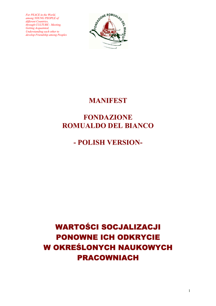 For PEACE in the World, among YOUNG PEOPLE of different Countries, through CULTURE - Meeting, Getting Acquainted, Understanding each other to develop Friendship among Peoples MANIFEST FONDAZIONE ROMUALDO DEL BIANCO - POLISH VERSION- WARTOŚCI SOCJALIZACJI PONOWNE ICH ODKRYCIE W OKREŚLONYCH NAUKOWYCH PRACOWNIACH 1 For PEACE in the World, among YOUNG PEOPLE of different Countries, through CULTURE - Meeting, Getting Acquainted, Understanding each other to develop Friendship among Peoples 1 – WPROWADZENIE POSŁANNICTWO FUNDACJI ROMUALDO DEL BIANCO Przyczyniać się do integracji międzynarodowej; nasza Fundacja organizuje we Florencji, spotkania, inicjatywy międzynarodowe dzięki którym, młodzi z różnych krajów i o różnych kulturach mogą spotykać się i poznawać, zawierać przyjaźnie, zatem przyczyniać się do pokoju na świecie. 2 – ZAŁOŻENIA 2.1. - ŻYCIE JAKO ZAANGAŻOWANIE SPOŁECZNE Życie jest stałym zaangażowaniem w stosunkach ludzkich. Zaangażowaniem naszej Fundacji jest przyczynianie się do rozwoju międzynarodowej sieci zrozumienia prawdziwej przyjaźni, szczególnie w tym historycznym momencie, charakteryzującym się ruchami migracyjnymi, spowodowanymi otwarciem granic z Krajami poprzednio izolowanymi. 2.2. – WOLNOŚĆ I WARTOŚCI Myślimy o tych, którzy po długim okresie czasu przeżytym w reżimie „nie demokratycznym”, przeżywają wolność, wolność myślenia, prawo głosu, wyznania; mówiąc inaczej, mogą działać swobodnie. Wszystko to przyczynia się do podniesienia poziomu bytu, do nabycia wiary we własne siły i możliwości. Wszystko to bardzo pozytywne. Co jednak można stracić posiadając wszystko ? 2.3. – EGOIZM I KONSUMPCYJNOŚĆ Możliwym jest strata zdolności szacowania spontaniczności jak również entuzjazmu z małych rzeczy otrzymanych dzięki szczeremu uczuciu. Tego rodzaju strata nie jest pozytywną, doprowadza bowiem do „zużyj i wyrzuć”. Kultura ta doprowadzić może do pobudzenia egoizmu wraz ze swoimi burzącymi efektami w stosunkach społecznych, a niekiedy wewnątrz rodziny, która stanowi fundament społeczeństwa. 2.4. – TECHNOLOGIA I PRZEKAZYWANIE INFORMACJI – INDYWIDUALIZM I SAMOTNOŚĆ Również wzrost technologii – który przyczynia do wzrostu komunikacji (przekazywania informacji) związany jest z ryzykiem wzrostu indywidualizmu, zatem z samotnością. 2.5. – WARTOŚCI LUDZKIE Istnieje ryzyko utraty podstawowych wartości ludzkich. Czujemy się nieraz być owładnięci błędnym entuzjazmem. Do czego zmierzamy? Gdzie jest postęp kulturalny i społeczny? Rozprzestrzenia się niepotrzebna i ślepa rozrzutność zasobów naturalnych, nie biorąc pod uwagę jakie może być ich uzasadnione przeznaczenie. 2 For PEACE in the World, among YOUNG PEOPLE of different Countries, through CULTURE - Meeting, Getting Acquainted, Understanding each other to develop Friendship among Peoples W krajach gdzie istniał reżym totalitarny jednostki często zamykały się w sobie, broniąc w ten sposób własnej osobowości i swoich wartości. Zachodzi pytanie, czy brak demokracji mógł spowodować w tych krajach chwilowe zamrożenie dawnych wartości ? Jeśli tak, to nasuwa się następne pytanie, Kraje które przez długi okres cierpiały z powodu braku demokracji, mogą teraz powrócić do dawnych wartości i tym samym pomóc innym Krajom w rozkwicie i wspólnym zbliżeniu. 3 – DZIEDZICTWO HISTORYCZNE I INTEGRACJA MIĘDZYNARODOWA Dziedzictwo kulturalne powinno stać się motorem spotkań, zatem wymiany prowadzącej do spotkań się między osobami, do zrozumienia i przyjaźni; zatem turystyka powinna być tym mocnym strategicznym elementem głoszącym pokój. Tradycjonalna turystyka jest głównie związana z turystką dla potrzeb indywidualnych, zatem rodzajem własnej egoistycznej turystyki. Turyści w zasadzie nie integrują się ze społecznością Kraju którego są wizytatorami. Tradycjonalna turystyka, w zrozumieniu szybkiej turystyki, w drugiej połowie 20-go wieku, wpływa na rozwój jednostek kraju z którego pochodzi. Miasto historii, które przyciąga turystę nie rzadko przybiera szatę która oferuje turyście aspekt z punktu widzenia bisnessu zapominając o stosunkach przyjacielskich z ludźmi miasta w którym znajduje się zwiedzający. Wymiana która może mieć miejsce (słowa, spojrzenia itd.) stanowi wymianę techniczną i z punktu widzenia bisnessu (aby sprzedać czy kupić) jest wynikiem, jak by powiedział Włoch emulsja oliwy z winem, integracja nie może tu zaistnieć. Poza tym, miasto które przyjmuje turystów pracuje w kierunku usług; jest to moment największej pracy, skierowanej na interesy, na działalność handlową. Nie tylko. Miasto zaniedbuje nieraz tak ważną kwestię jaką jest planowanie turystyki, co powoduje negatywne efekty. Planowanie turystyki powinno rozważać momenty napływu i ustalać limit turystów, stwarzając tym samym warunki przepływu do zniesienia, ponieważ mieszkańcy miasta nie są w stanie ponosić ciężar stałego wzrostu napływu zwiedzających i oceniają zjawisko jako negatywne. W interesie mieszkańców, zwiedzających i dbając o przyszłość naszych historycznych miast, musimy określić przeznaczenie i misję każdego ośrodka, jego możliwości rozwoju, po to aby miasto pomału nie stało się dużym muzeum dla turysty, zamiast miastem jego mieszkańców, a tym samym miastem. W dokumencie podczas Konferencji w Krakowie 26-go października 2000, pod hasłem Management , mówi się jasno o ryzyku jakie płynie z nieplanowanej turystyki. Zatem do pracy. 3 For PEACE in the World, among YOUNG PEOPLE of different Countries, through CULTURE - Meeting, Getting Acquainted, Understanding each other to develop Friendship among Peoples 4 - PROPOZYCJA: WARSZTATY DLA INTERGRACJI dla ZACHOWANIA I PONOWNEGO ODKRYCIA DAWNYCH WARTOŚCI SOCJALIZACJI 4.1. W POSZUKIWANIU WARSZTATÓW DLA INTEGRACJI MIĘDZYNARODOWEJ Uważamy, że istnieje możliwość spotka