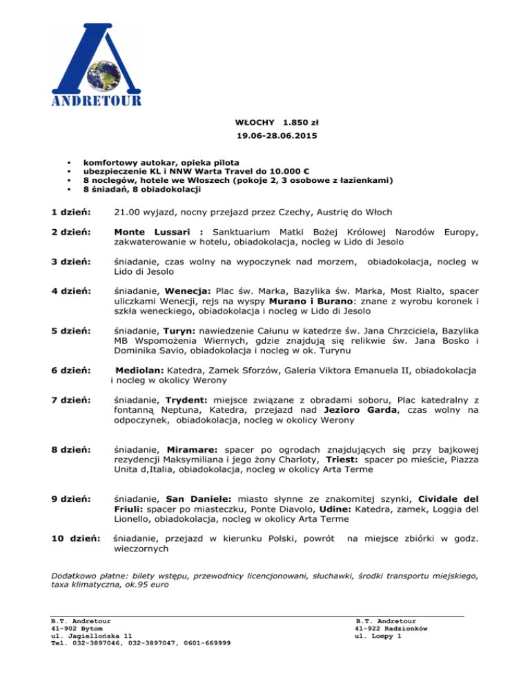 WŁOCHY 1.850 zł 19.06-28.06.2015 komfortowy autokar, opieka pilota ubezpieczenie KL i NNW Warta Travel do 10.000 € 8 noclegów, hotele we Włoszech (pokoje 2, 3 osobowe z łazienkami) 8 śniadań, 8 obiadokolacji 1 dzień: 21.00 wyjazd, nocny przejazd przez Czechy, Austrię do Włoch 2 dzień: Monte Lussari : Sanktuarium Matki Bożej Królowej Narodów zakwaterowanie w hotelu, obiadokolacja, nocleg w Lido di Jesolo 3 dzień: śniadanie, czas wolny na wypoczynek nad morzem, Lido di Jesolo 4 dzień: śniadanie, Wenecja: Plac św. Marka, Bazylika św. Marka, Most Rialto, spacer uliczkami Wenecji, rejs na wyspy Murano i Burano: znane z wyrobu koronek i szkła weneckiego, obiadokolacja i nocleg w Lido di Jesolo 5 dzień: śniadanie, Turyn: nawiedzenie Całunu w katedrze św. Jana Chrzciciela, Bazylika MB Wspomożenia Wiernych, gdzie znajdują się relikwie św. Jana Bosko i Dominika Savio, obiadokolacja i nocleg w ok. Turynu 6 dzień: Mediolan: Katedra, Zamek Sforzów, Galeria Viktora Emanuela II, obiadokolacja i nocleg w okolicy Werony 7 dzień: śniadanie, Trydent: miejsce związane z obradami soboru, Plac katedralny z fontanną Neptuna, Katedra, przejazd nad Jezioro Garda, czas wolny na odpoczynek, obiadokolacja, nocleg w okolicy Werony 8 dzień: śniadanie, Miramare: spacer po ogrodach znajdujących się przy bajkowej rezydencji Maksymiliana i jego żony Charloty, Triest: spacer po mieście, Piazza Unita d,Italia, obiadokolacja, nocleg w okolicy Arta Terme 9 dzień: śniadanie, San Daniele: miasto słynne ze znakomitej szynki, Cividale del Friuli: spacer po miasteczku, Ponte Diavolo, Udine: Katedra, zamek, Loggia del Lionello, obiadokolacja, nocleg w okolicy Arta Terme 10 dzień: śniadanie, przejazd w kierunku Polski, powrót wieczornych Europy, obiadokolacja, nocleg w na miejsce zbiórki w godz. Dodatkowo płatne: bilety wstępu, przewodnicy licencjonowani, słuchawki, środki transportu miejskiego, taxa klimatyczna, ok.95 euro B.T. Andretour 41-902 Bytom ul. Jagiellońska 11 Tel. 032-3897046, 032-3897047, 0601-669999 B.T. Andretour 41-922 Radzionków ul. Lompy 1