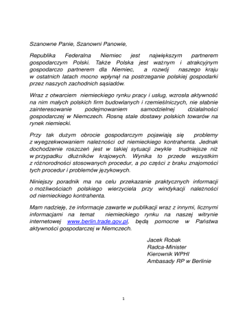 Szanowne Panie, Szanowni Panowie, Republika Federalna Niemiec jest największym partnerem gospodarczym Polski. Także Polska jest ważnym i atrakcyjnym gospodarczo partnerem dla Niemiec, a rozwój naszego kraju w ostatnich latach mocno wpłynął na postrzeganie polskiej gospodarki przez naszych zachodnich sąsiadów. Wraz z otwarciem niemieckiego rynku pracy i usług, wzrosła aktywność na nim małych polskich firm budowlanych i rzemieślniczych, nie słabnie zainteresowanie podejmowaniem samodzielnej działalności gospodarczej w Niemczech. Rosną stale dostawy polskich towarów na rynek niemiecki. Przy tak dużym obrocie gospodarczym pojawiają się problemy z wyegzekwowaniem należności od niemieckiego kontrahenta. Jednak dochodzenie roszczeń jest w takiej sytuacji zwykle trudniejsze niż w przypadku dłużników krajowych. Wynika to przede wszystkim z różnorodności stosowanych procedur, a po części z braku znajomości tych procedur i problemów językowych. Niniejszy poradnik ma na celu przekazanie praktycznych informacji o możliwościach polskiego wierzyciela przy windykacji należności od niemieckiego kontrahenta. Mam nadzieję, że informacje zawarte w publikacji wraz z innymi, licznymi informacjami na temat niemieckiego rynku na naszej witrynie internetowej www.berlin.trade.gov.pl, będą pomocne w Państwa aktywności gospodarczej w Niemczech. Jacek Robak Radca-Minister Kierownik WPHI Ambasady RP w Berlinie 1 Spis treści Wprowadzenie ........................................................................................ 5 1. Pozasądowe działania wierzyciela przy windykacji wierzytelności .. 5 1.1. Konstruowanie umowy na etapie nawiązywania stosunków gospodarczych jako działanie zabezpieczające ......................... 5 1.2. Wymagalność roszczenia: upomnienie i zwłoka ........................ 8 1.3. Zwłoka....................................................................................... 8 1.4. Szkoda wskutek zwłoki i odsetki za zwłokę ............................... 9 1.4.1. Odsetki za zwłokę ................................................................ 9 1.4.2. Szkoda za zwłokę .............................................................. 10 1.4.3. Przypadek specjalny GmbH (sp. z o.o.) i innych spółek kapitałowych ..................................................................... 11 1.5. Ponaglenie .............................................................................. 13 1.6. Ponaglenie przez adwokata .................................................... 15 2. Postępowanie sądowe wobec dłużnika ......................................... 16 2.1. Konieczność upomnienia sądowego ....................................... 16 2.2. Charakterystyka postępowania upominawczego (Mahnverfahren) ...................................................................... 16 2.2.1. Przeprowadzenie postępowania upominawczego.............. 17 2.2.2. Właściwy miejscowo sąd rejonowy .................................... 18 2.2.3. Sprzeciw wobec nakazu zapłaty ........................................ 21 2.2.4. Tytuł egzekucyjny .............................................................. 22 2.2.5. Niewniesienie sprzeciwu wobec nakazu zapłaty lub niewniesienie zażalenia na tytuł egzekucyjny ................... 22 2.2.6. Ogólne wskazówki odnośnie sądowego postępowania upominawczego ......................................... 23 2.3. Postępowanie skargowe ......................................................... 24 2.4. Postępowanie egzekucyjne ..................................................... 24 2 2.5. Windykacja należności z pomocą adwokatów ......................... 25 3. Postępowanie prawno-karne przeciwko dłużnikowi ...................... 30 4. Informacje o dłużniku .................................................................... 31 5. Egzekucja polskich orzeczeń ........................................................ 32 5.1. Egzekucja polskiego wyroku w Niemczech ............................. 32 5.2. Europejski tytuł egzekucyjny dla roszczeń bezspornych ......... 33 6. Inne możliwości wsparcia windykacji ............................................ 34 6.1. Zwolnienie z kosztów procesowych ......................................... 34 6.2. Sfinansowanie procesu ........................................................... 34 6.3. Ubezpieczenie ochrony prawnej .............................................. 35 6.4. Ubezpieczenie kredytu ............................................................ 35 7. Zakończenie ................................................................................. 36 Ambasada Rzeczypospolitej Polskiej w Berlinie Wydział Promocji Handlu i Inwestycji .................................................... 37 Autor: Radosław Niecko ........................................................................ 38 ECDDP Rechtsanwalts GmbH .............................................................. 39 3 4 Wprowadzenie Rosnąca rola Polski jako najważniejszego partnera handlowego Niemiec w Europie Środkowo-Wschodniej, widoczna aktywność usługowa i inwestycyjna polskich przedsiębiorstw na niemieckim rynku to ewidentne korzyści dla polskiej gospodarki i bezsporne efekty członkostwa Polski w UE. Bilateralna wymiana handlowa przekraczająca w 2013 r. 70 mld EUR, polskie inwestycje Niemczech wynoszące już ponad 1 mld EUR czy wartość usług rzędu 3-4 mld EUR, niosą ze sobą różnorodne problemy, szczególnie wtedy, gdy niemieckie przedsiębiorstwo nie płaci swoim polskim kontrahentom. Wiele polskich przedsiębiorstw skarży się na ciągłe, niewłaściwe zachowania płatnicze swoich klientów. Zaległe wierzytelności mają wpływ na płynność przedsiębiorstwa. Prowadzą do utraty odsetek i generują koszty. Istnieje ponadto ryzyko nieściągalności wierzytelności. Dlatego też dla każdego polskiego przedsiębiorcy bardzo ważne jest, aby zaległe wierzytelności został