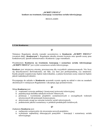 „SCRIPT FIESTA” konkurs na treatment, koncepcję i scenariusz serialu telewizyjnego. REGULAMIN I. Cele Konkursu: §1 Niniejszy Regulamin określa warunki uczestnictwa w Konkursie „SCRIPT FIESTA” (zwanym dalej „Konkursem”). Regulamin określa również kryteria oraz sposób oceny prac konkursowych, sposób informowania o Konkursie i jego warunkach. Przedmiotem Konkursu na treatment, koncepcję i scenariusz serialu telewizyjnego „SCRIPT FIESTA” jest wybór scenariusza serialu telewizyjnego. Konkurs jest inicjatywą otwartą, przeznaczoną dla wszystkich zainteresowanych. Nie liczy się dotychczasowe doświadczenie, ani fakt, czy ktoś jest profesjonalistą, czy amatorem. Każdy projekt rozpatrywany będzie indywidualnie, a jedyne kryterium oceny stanowić będzie jakość nadesłanych tekstów. Przystępując do udziału w Konkursie uczestnik wyraża zgodę na udział w nim na zasadach określonych w niniejszym Regulaminie i akceptuje jego postanowienia. §2 Misją Konkursu jest: a) wspieranie rozwoju ambitnej i kreatywnej twórczości telewizyjnej; b) popularyzacja dorobku młodych twórców filmowych; c) promocja i wyróżnienie projektów scenariuszowych o szczególnych walorach artystycznych lub potencjale komercyjnym; d) skierowanie uwagi na warsztat twórców seriali telewizyjnych; e) podniesienie jakości scenariuszy w polskich produkcjach serialowych. §3 Zadaniem Konkursu jest: a) zachęcenie scenarzystów do stworzenia nowych projektów; b) wyłonienie najbardziej obiecujących pomysłów - koncepcji i scenariuszy serialu telewizyjnego. 1 II. Formuła Konkursu: §4 Organizatorami Konkursu są: a) PAISA FILMS Sp. z o.o. z siedzibą w Warszawie przy ulicy Złotej 77 lok. 30, 00-819 Warszawa, zarejestrowaną w Sądzie Rejonowym dla m.st. Warszawy, XIII Wydział Gospodarczy Krajowego Rejestru Sądowego pod numerem: KRS 0000240797; REGON 140215137; NIP 123-106-29-58, b) Warszawska Szkoła Filmowa - Uczelnia, z siedzibą przy ul. Generała Zajączka, 7, 01-518 Warszawa, NIP: 525-251-78-28, REGON: 145821227, c) Fundacja Edukacji i Sztuki Filmowej Macieja Ślesickiego i Bogusława Lindy LATERNA MAGICA z siedzibą: 01-518 Warszawa, ul. Generała Zajączka 7, wpisana do Krajowego Rejestru Sądowego przez Sąd Rejonowy dla m. st. Warszawy, XIII Wydział Gospodarczy Krajowego Rejestru Sądowego pod numerem KRS 0000196575, numer NIP: 123-101-3888, REGON: 015678489. zwani dalej, na potrzeby niniejszego regulaminu, Organizatorami. Konkurs organizowany jest na obszarze Rzeczypospolitej Polskiej, w okresie od dnia 10 lutego 2012 roku do dnia 31 maja 2012 roku. §5 Wszelkie autorskie prawa majątkowe do formuły i koncepcji artystycznej Konkursu posiadają Organizatorzy. §6 Za całość spraw związanych z przygotowaniem i przebiegiem Konkursu odpowiedzialny jest Koordynator Organizacyjny, powoływany przez Organizatorów, posiadający decydujący głos w kwestiach spornych, nie objętych regulaminem lub wymagających dodatkowych interpretacji. §7 Organizatorzy mogą zaprosić do współudziału w organizacji Konkursu inne jednostki państwowe, społeczne i prywatne, które zamierzają wnieść swój rzeczowy lub finansowy wkład w przygotowanie i realizację Konkursu. §8 W kwestiach nieuregulowanych niniejszym Regulaminem zastosowanie będą miały przepisy kodeksu cywilnego, ustawy o prawie autorskim i prawach pokrewnych oraz inne powszechnie obowiązujące przepisy prawa. III. Zasady uczestnictwa - wstęp §9 Konkurs podzielony jest na 2 etapy: ogólny i finałowy: 1. W I etapie Konkursu każdy Uczestnik może nadesłać dowolną liczbę koncepcji serialu telewizyjnego. 2. Do II etapu Konkursu zostaną zaproszeni wyłącznie zwycięzcy I etapu („Finaliści”) w liczbie od 3 do 10 osób. 2 §10 Poprzez koncepcję serialu telewizyjnego rozumie się dokument liczący od 5 do 10 stron, sporządzony na przygotowanym przez Organizatorów szablonie, zawierający: 1. tytuł serialu; 2. ogólne założenia serialu telewizyjnego (gatunek, długość odcinka, ilość odcinków w sezonie, zakładana grupa docelowa); 3. opis pomysłu na serial telewizyjny; 4. zarys głównych postaci; 5. treatment pierwszego odcinka; 6. zarys fabularny pierwszego sezonu; 7. trzy kompletne sceny dialogowe z odcinka pilotowego §11 Koncepcje serialu telewizyjnego do udziału w Konkursie mogą zgłaszać wyłącznie osoby fizyczne (zwane dalej Uczestnikiem), które w dniu przystąpienia do Konkursu posiadają pełną zdolność do czynności prawnych oraz pełne prawo do dysponowania zgłaszanym tekstem. W Konkursie mogą wziąć udział również zespoły osób, dokonujące zgłoszenia jako jeden uczestnik (zbiorowy). W takim przypadku osoby te traktowane będą jako współtwórcy zgłoszonych do udziału w Konkursie tekstów. §12 Zasady udziału w Konkursie określa wyłącznie niniejszy Regulamin. Wszelkie materiały promocyjno - reklamowe mają jedynie charakter informacyjny. §13 Organizatorzy nie ponoszą odpowiedzialności za koncepcje seriali telewizyjnych, które nie dotarły do nich, lub dotarły z opóźnieniem, na skutek przyczyn niezależnych (np. opóźnienie ze strony firm, które realizowały wysyłkę). §14 Udział w Konkursie jest całkowicie bezpłatny. §15 Do Konkursu mogą być zgłaszane wyłącznie oryginalne (własne) koncepcje seriali telewizyjnych. Adaptacje oraz inne formy filmowe nie będą brane pod uwagę. Przez oryginalne koncepcje seriali telewizyjnych rozumie się prace spełniające wymogi art. 1 ust. 1 ustawy o prawie autorskich i prawach pokrewnych. §16 Prawa autorskie koncepcji seriali telewizyjnych zgłaszanych do udziału w Konkursie nie mogą być w żaden sposób ograniczone ani naruszać praw autorskich i dóbr osobistych osób trzecich. §17 Organizatorzy działają w dobrej wierze i nie ponoszą odpowiedzialności za naruszenie praw osób trzecich przez Uczestników powstałe w związku z udziałem w Konkursie. W szczególności Organizatorzy nie odpowiadaj