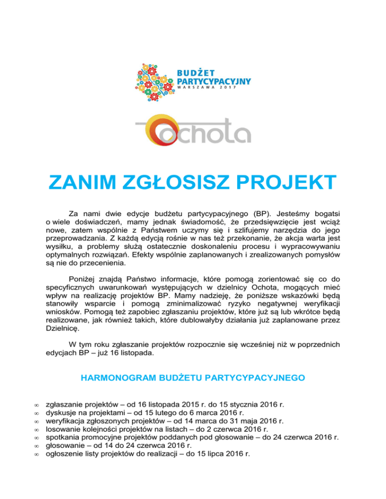 ZANIM ZGŁOSISZ PROJEKT Za nami dwie edycje budżetu bud etu partycypacyjnego (BP). Jesteśmy Jeste bogatsi o wiele doświadczeń,, mamy jednak świadomość, że przedsięwzię ęwzięcie jest wciąż nowe, zatem wspólnie z Państwem Pa uczymy się i szlifujemy narzędzia narzę do jego przeprowadzania. Z każdą ż ą edycją edycj rośnie w nas też przekonanie, że akcja warta jest wysiłku, a problemy służą żą ostatecznie doskonaleniu aleniu procesu i wypracowywaniu optymalnych rozwiązań. Efekty wspólnie zaplanowanych i zrealizowanych pomysłów są nie do przecenienia. Poniżej znajdą ą Państwo informacje, które pomogą pomogą zorientować zorientowa się co do specyficznych uwarunkowań występujących w dzielnicy cy Ochota, mogących mog mieć wpływ na realizację ę projektów BP. Mamy nadzieję, że poniższe ższe wskazówki będą stanowiły wsparcie i pomogą pomog zminimalizować ryzyko negatywnej weryfikacji wniosków. Pomogą ą teżż zapobiec zgłaszaniu projektów, które jużż są ą lub wkrótce będą b realizowane, jak równieżż takich, które dublowałyby działania już już zaplanowane przez Dzielnicę. W tym roku zgłaszanie projektów rozpocznie się si wcześniej śniej niż w poprzednich edycjach BP – już 16 listopada. HARMONOGRAM BUDŻETU BUD ETU PARTYCYPACYJNEGO • • • • • • • zgłaszanie projektów – od 16 listopada 2015 r. do 15 stycznia 2016 r. dyskusje na projektami – od 15 lutego do 6 marca 2016 r. weryfikacja zgłoszonych projektów – od 14 marca do 31 maja 2016 r. losowanie kolejności ci projektów na listach – do 2 czerwca 2016 r. spotkania a promocyjne projektów poddanych pod głosowanie – do 24 czerwca 2016 r. głosowanie – od 14 do 24 czerwca 2016 r. ogłoszenie listy projektów do realizacji – do 15 lipca 2016 r. ŻELAZNE ZASADY – O CZYM PAMIĘTAĆ PRZYGOTOWUJĄC PROJEKT • • • • • • • • Projekty muszą spełniać warunek ogólnodostępności. To znaczy, że z efektów będzie mogła korzystać jak najszersza grupa odbiorców. Projekty zakładające realizację zadań np. w określonej placówce, na zamkniętym podwórku itp., do których dostęp ma ściśle określona grupa odbiorców, mogą zostać zweryfikowane negatywnie; o tym, czy projekt jest ogólnodostępny, będzie decydował Zespół ds. BP; Projekty muszą mieścić się w zakresie zadań własnych m.st. Warszawy przypisanych do realizacji dzielnicom lub jednostkom; Czas realizacji projektu nie może przekroczyć jednego roku budżetowego; zadanie musi zostać zrealizowane między styczniem a grudniem 2017 roku (w 2016 roku dopuszczalne są wyłącznie prace przygotowawcze do zadania); Zadania realizowane w ramach BP mogą być zlokalizowane na terenach należących do m.st. Warszawy, przy czym Zarząd Dzielnicy Ochota m.st. Warszawy dopuścił również możliwość zgłaszania projektów zlokalizowanych na terenach niebędących własnością m.st Warszawy lub na terenach stanowiących własność m.st. Warszawy obciążoną na rzecz osób trzecich, pod warunkiem, że projekty te mają charakter inny niż inwestycyjny, a do formularza zgłoszeniowego dołączona będzie zgoda dysponenta terenu na nieodpłatne wykorzystanie tego terenu do w celu realizacji projektu; W ramach BP nie mogą być zgłaszane projekty, które: o zakładają wykonanie wyłącznie dokumentacji projektowej; o zakładają wykonanie jednego z elementów (etapów) realizacji zadania, które w latach kolejnych będzie wymagało wykonania dalszych jego elementów (etapów); o są sprzeczne z przyjętymi strategiami i programami m.st. Warszawy. Projekty, które zawierają treści uznawane powszechnie za naganne, obsceniczne, obraźliwe, wulgarne lub które mogą być odebrane jako społecznie naganne nie będą weryfikowane, a informacje o nich nie będą publikowane. Każdy mieszkaniec może zgłosić i poprzeć więcej niż jeden projekt; Jeden projekt może zostać zgłoszony przez maksymalnie trzech mieszkańców. Szczegółowe zasady przebiegu warszawskiego BP na rok 2017 znajdują się w Regulaminie stanowiącym załącznik do Zarządzenia Nr 1400/2015 Prezydenta m.st. Warszawy z dnia 8 października 2015 roku w sprawie w sprawie konsultacji społecznych z mieszkańcami m.st. Warszawy w zakresie budżetu partycypacyjnego na rok 2017. Znajdą go Państwo pod adresem: http://bip.warszawa.pl/NR/exeres/CB62FF6F-E70A-4700-AD6FEC81931EE358,frameless.htm 2 CO JUŻ ROBIMY W RAMACH BUDŻETU PARTYCYPACYJNEGO Przed opracowaniem projektu warto sprawdzić, czy ktoś rok czy dwa przed nami nie wpadł już na podobny pomysł. Zdarzyło się niejednokrotnie w historii naszej planety, że podobne odkrycia zostały dokonane w podobnym czasie przez różnych ludzi ☺ W nawiasach podany jest rok realizacji ochockich projektów BP. Park Szczęśliwicki: • „Karmniki w parku Szczęśliwickim”– ustawienie karmników i tablic informacyjnych o dokarmianiu ptaków (2015) • „Oświetlenie ścieżki rowerowej i chodnika w Parku Szczęśliwickim” – we wschodniej części parku (2015) • „Trampoliny w parku Szczęśliwickim” – trampoliny do skakania dla dzieci (2015) • „Plac do kalisteniki (mega trzepak)” – plac do ćwiczeń gimnastycznych opartych ma sile mięśni (2015) • „Boisko do siatkówki” – boisko do siatkówki 6-osobowej (2015) • „Uzupełnienie chodnika przy ul. Włodarzewskiej”- budowa chodnika wzdłuż ul. Włodarzewskiej na wysokości działek Włodarzewska 39 i Włodarzewska 43 (2015) • „Jaśniej w parku: montaż dodatkowych latarni” - montaż pięciu latarni w parku przy nieoświetlonym fragmencie zachodniej alei (w okolicach ulicy Przy Parku) (2016) • „Kino plenerowe na Szczęśliwicach” - cykl 4 projekcji filmowych na świeżym powietrzu (2016) • „Wrześniowe potańcówki na Szczęśliwicach” - potańcówki w pierwsze dwie soboty września (2016) Park Zachodni: • „Budowa parku Zachodniego