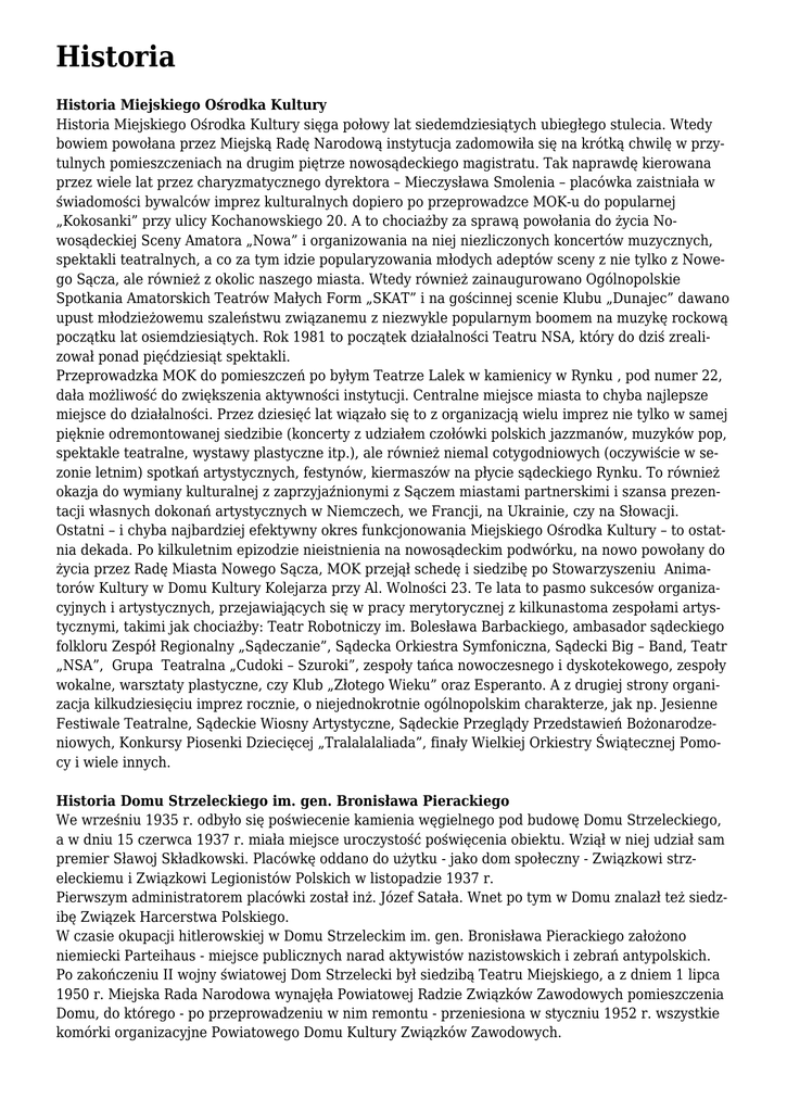 Historia Historia Miejskiego Ośrodka Kultury Historia Miejskiego Ośrodka Kultury sięga połowy lat siedemdziesiątych ubiegłego stulecia. Wtedy bowiem powołana przez Miejską Radę Narodową instytucja zadomowiła się na krótką chwilę w przytulnych pomieszczeniach na drugim piętrze nowosądeckiego magistratu. Tak naprawdę kierowana przez wiele lat przez charyzmatycznego dyrektora – Mieczysława Smolenia – placówka zaistniała w świadomości bywalców imprez kulturalnych dopiero po przeprowadzce MOK-u do popularnej „Kokosanki” przy ulicy Kochanowskiego 20. A to chociażby za sprawą powołania do życia Nowosądeckiej Sceny Amatora „Nowa” i organizowania na niej niezliczonych koncertów muzycznych, spektakli teatralnych, a co za tym idzie popularyzowania młodych adeptów sceny z nie tylko z Nowego Sącza, ale również z okolic naszego miasta. Wtedy również zainaugurowano Ogólnopolskie Spotkania Amatorskich Teatrów Małych Form „SKAT” i na gościnnej scenie Klubu „Dunajec” dawano upust młodzieżowemu szaleństwu związanemu z niezwykle popularnym boomem na muzykę rockową początku lat osiemdziesiątych. Rok 1981 to początek działalności Teatru NSA, który do dziś zrealizował ponad pięćdziesiąt spektakli. Przeprowadzka MOK do pomieszczeń po byłym Teatrze Lalek w kamienicy w Rynku , pod numer 22, dała możliwość do zwiększenia aktywności instytucji. Centralne miejsce miasta to chyba najlepsze miejsce do działalności. Przez dziesięć lat wiązało się to z organizacją wielu imprez nie tylko w samej pięknie odremontowanej siedzibie (koncerty z udziałem czołówki polskich jazzmanów, muzyków pop, spektakle teatralne, wystawy plastyczne itp.), ale również niemal cotygodniowych (oczywiście w sezonie letnim) spotkań artystycznych, festynów, kiermaszów na płycie sądeckiego Rynku. To również okazja do wymiany kulturalnej z zaprzyjaźnionymi z Sączem miastami partnerskimi i szansa prezentacji własnych dokonań artystycznych w Niemczech, we Francji, na Ukrainie, czy na Słowacji. Ostatni – i chyba najbardziej efektywny okres funkcjonowania Miejskiego Ośrodka Kultury – to ostatnia dekada. Po kilkuletnim epizodzie nieistnienia na nowosądeckim podwórku, na nowo powołany do życia przez Radę Miasta Nowego Sącza, MOK przejął schedę i siedzibę po Stowarzyszeniu Animatorów Kultury w Domu Kultury Kolejarza przy Al. Wolności 23. Te lata to pasmo sukcesów organizacyjnych i artystycznych, przejawiających się w pracy merytorycznej z kilkunastoma zespołami artystycznymi, takimi jak chociażby: Teatr Robotniczy im. Bolesława Barbackiego, ambasador sądeckiego folkloru Zespół Regionalny „Sądeczanie”, Sądecka Orkiestra Symfoniczna, Sądecki Big – Band, Teatr „NSA”, Grupa Teatralna „Cudoki – Szuroki”, zespoły tańca nowoczesnego i dyskotekowego, zespoły wokalne, warsztaty plastyczne, czy Klub „Złotego Wieku” oraz Esperanto. A z drugiej strony organizacja kilkudziesięciu imprez rocznie, o niejednokrotnie ogólnopolskim charakterze, jak np. Jesienne Festiwale Teatralne, Sądeckie Wiosny Artystyczne, Sądeckie Przeglądy Przedstawień Bożonarodzeniowych, Konkursy Piosenki Dziecięcej „Tralalalaliada”, finały Wielkiej Orkiestry Świątecznej Pomocy i wiele innych. Historia Domu Strzeleckiego im. gen. Bronisława Pierackiego We wrześniu 1935 r. odbyło się poświecenie kamienia węgielnego pod budowę Domu Strzeleckiego, a w dniu 15 czerwca 1937 r. miała miejsce uroczystość poświęcenia obiektu. Wziął w niej udział sam premier Sławoj Składkowski. Placówkę oddano do użytku - jako dom społeczny - Związkowi strzeleckiemu i Związkowi Legionistów Polskich w listopadzie 1937 r. Pierwszym administratorem placówki został inż. Józef Satała. Wnet po tym w Domu znalazł też siedzibę Związek Harcerstwa Polskiego. W czasie okupacji hitlerowskiej w Domu Strzeleckim im. gen. Bronisława Pierackiego założono niemiecki Parteihaus - miejsce publicznych narad aktywistów nazistowskich i zebrań antypolskich. Po zakończeniu II wojny światowej Dom Strzelecki był siedzibą Teatru Miejskiego, a z dniem 1 lipca 1950 r. Miejska Rada Narodowa wynajęła Powiatowej Radzie Związków Zawodowych pomieszczenia Domu, do którego - po przeprowadzeniu w nim remontu - przeniesiona w styczniu 1952 r. wszystkie komórki organizacyjne Powiatowego Domu Kultury Związków Zawodowych. Wkrótce, przy okazji reorganizacji struktury związków zawodowych w kraju, został zlikwidowany PDKZZ, a budynek przekazano Związkowi Zawodowemu Kolejarzy. Od tej chwili nazwa niegdysiejszego Domu Strzeleckiego brzmiała: Dom Kultury Związku Zawodowego Kolejarzy. Jego uroczyste otwarcie miało miejsce w dniu 22 lipca 1953 r. Pierwszym kierownikiem Domu Kultury Kolejarza (tak się ustaliła jego nazwa) został pracownik Zakładów Naprawczych Taboru Kolejowego - Stanisław Pycha. Po nim, w latach 1954-1956, funkcję tę pełnił Ryszard Górczyk, a następnie Leon Barbacki, syn znanego inspektora szkolnego (Leona) w Nowym Sączu z czasów austriackich, brat Bolesława i Witolda, znany wcześniej aktor i reżyser Teatru Robotniczego. DKK rozwinął swoją działalność, mnożąc i różnicując formy pracy kulturalno-oświatowej. Już w 1954 r. prowadził 2 zespoły teatralne, 2 taneczne, 2 rewelersów, 60-osobowy chór, 2 zespoły plastyków amatorów, bibliotekę, czytelnię czasopism, salę gier stolikowych. Organizował odczyty, wycieczki w ramach wczasów niedzielnych do Rytra. W 1958 r. uruchomił we współpracy z TWP Uniwersytet Powszechny dla Kolejarzy, utworzono kółka zainteresowań, odbywały się popisy zespołów, wystawy prac, spotkania z literatami, artystami, wieczory artystyczne, przedstawienia i występy teatrów, a także prawie wszystkie miejscowe akademie. W latach 60-tych i 70-tych DKK utrzymywał zespoły artystyczne (Teatr Robotniczy, Tańca Ludowego "Sądeczanie", muzyczno-wokalny, amatorów