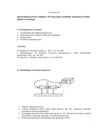 Ćwiczenie 45 Sprawdzanie prawa Malusa. Wyznaczanie rozkładu natężenia światła spolaryzowanego I. Wymagania do ćwiczenia 1. 2. 3. 4. Światło jako fala elektromagnetyczna. Polaryzacja przez odbicie i podwójne załamanie. Polaryzatory. Wielkości fotometryczne. Literatura: D. Halliday, R. Resnick, Fizyka t.2 , 1967, str. 672-698. J. Halaunbrenner, M. Kmiecik, Ćwiczenia laboratoryjne z fizyki Politechnika Krakowska 1990, str. 244-248. B. Jaworski, A. Dietław, Kurs Fizyki t.3, str. 202-220. II. Metodologia wykonania pomiarów 1 2 3 5 4 1. Włączyć układ pomiarowy. 2. Ustawić analizator (przez obrót skalą kątową) tak, aby wskazanie miernika oświetlenia było jak najmniejsze. 3. Zmieniając kąt ustawienia skali kątowej np. co 10º odczytywać kolejne wartości oświetlenia w luksach, wpisując je do tabeli pomiarowej. 4. Pomiary przeprowadzić dla pełnego kąta płaskiego ( 360 ). 1 [ º] E [ lx ] u(E) [ lx ] u( max ) [º] Eobl [ lx ] III. Obliczenia 1. Sporządzić wykresy E ( ) w biegunowym układzie współrzędnych. Na tym samym wykresie nanieść punkty Eobl obliczone z prawa Malusa. 2. Niepewności pomiarowe u(E), u(α) określić jako niepewności standardowe typu B. 3. Sformułować wnioski wynikające z otrzymanych wyników. 2 Ćwiczenie 44 Sprawdzanie prawa Malusa. Wyznaczanie rozkładu natężenia światła spolaryzowanego I. Wymagania do ćwiczenia. 1.Światło jako fala elektromagnetyczna. 2.Polaryzacja fali przez odbicie i podwójne załamanie. 3.Polaryzatory. 4.Wielkości fotometryczne. Literatura: D. Halliday, R. Resnick, Fizyka t.2 , 1967, str. 672-698. J. Halaunbrenner, M. Kmiecik, Ćwiczenia laboratoryjne z fizyki Politechnika Krakowska 1990, str. 244-248. B. Jaworski, A. Dietław, Kurs Fizyki t.3, str. 202-220. II. Metodologia wykonania ćwiczenia. 1 2 3 5 4 Rys. 3. Układ pomiarowy do sprawdzania prawa Malusa W skład układu do eksperymentalnego sprawdzania prawa Malusa (rys.3) wchodzą: zintegrowane stanowisko pomiarowe składające się z ławy optycznej 4, źródła światła wraz z polaryzatorem 1, skala kątowa wraz z analizatorem 2, układ optyczny detektora 3, zasilacz i elektroniczny miernik oświetlenia z wyświetlaczem cyfrowym 5. 1.Włączyć układ pomiarowy. 2.Ustawić analizator (przez obrót skalą kątową) tak, aby wskazanie miernika oświetlenia było jak najmniejsze. 3 3.Zmieniając kąt ustawienia skali kątowej co 15º odczytywać kolejne wartości oświetlenia w luksach, wpisując je do tabeli pomiarowej. 4.Pomiary przeprowadzić dla pełnego kąta płaskiego ( 3600 ). 5.Powtórzyć ponownie pomiary dla kątów od 0 do 3600 zapisując kolejne wartości I spr w celu oszacowania niepewności I . [ ] I I spr [ ] [ ] I [ ] max I obl [ ] [ ] 5. Oszacować niepewność odczytu kąta . III. Obliczenia. a) Sporządzić wykresy I ( ) oraz I spr w biegunowym układzie współrzędnych. Na tym samym wykresie nanieść punkty I obl obliczone z prawa Malusa. b) Niepewności pomiarowe ΔI, Δα określić jako niepewności standardowe typu B. c) Sformułować wnioski wynikające z otrzymanych wyników. 4