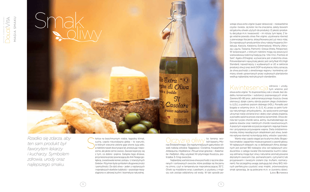 wstaje oliwa extra virgine (super dziewicza) – nieskazitelnie czysta i świeża. Jej kolor nie ma znaczenia, zależy bowiem od gatunku oliwek użytych do produkcji. O jakości produktu decyduje m.in. kwasowość – im niższa, tym lepiej. Z tego właśnie powodu oliwa fine virgine, uzyskiwana również z pierwszego tłoczenia, sklasyfikowana jest już nieco niżej. Do największych producentów oliwy należą Hiszpania (Andaluzja, Kastylia, Katalonia, Estremadura), Włochy (Abruzja, Liguria, Toskania, Piemont) i Grecja (Kreta, Peloponez). W korporacjach, z których niektóre mogą się poszczycić wielowiekową rodzinną tradycją (np. Villa Vinci, Frantoio di Sant' Agata d'Oneglia), wytwarzana jest znakomita oliwa. Potwierdzeniem najwyższej jakości jest certyfikat HS (High Standard, najważniejszy z wydawanych w UE w sektorze produkcji oliwy) oraz skrót DOP na etykiecie, który oznacza, że oliwa pochodzi z określonego regionu i konkretnej odmiany oliwek uprawnianych przez wybranych plantatorów według najbardziej restrykcyjnych standardów. Fot.: Stock Food m ag i a s m aku DolceVita w y b o r u d o b r e g o s z t u k a Smak S Rzadko się zdarza, aby ten sam produkt był faworytem lekarzy i kucharzy. Symbolem zdrowia, urody oraz najlepszego smaku. łońce na bezchmurnym niebie, łagodny klimat, sucha, często nieurodzajna gleba – to warunki, w których wiecznie zielone gaje oliwne żyją setki, a niektóre nawet dwa tysiące lat, produkując niepozorne, ale jakże cenne owoce. Zawsze kojarzyły się z tym, co dobre i piękne. Gałązka tego drzewa, przyniesiona przez powracającą do Arki Noego gołębicę, zwiastowała koniec potopu. U starożytnych Greków i Rzymian była symbolem długowieczności i pomyślności. Do dziś oliwa – jeden z najstarszych i największych skarbów ludzkości – pozostaje nieząstąpiona w zdrowej kuchni i kosmetyce naturalnej. 18 Kwintesencja Ojczyzna oliwy to tereny wokół basenu Morza Śródziemnego. Do najsłynniejszych gatunków oliwek należą włoskie Taggiasca i Coratina, hiszpańskie Arbequina, Hojiblanca i Picual oraz greckie – Kalamata i Nafplion. Aby uzyskać litr płynnego tłuszczu, potrzeba 3–5 kg owoców. Najbardziej wartościowa oliwa pochodzi z ręcznie zbieranych i sortowanych owoców, które poddaje się tłoczeniu na zimno, czyli w temperaturze nieprzekraczającej 35˚C. Oliwki są miażdżone wraz z pestkami, a uzyskany z miąższu sok zostaje oddzielony od wody. W taki sposób po- 19 zdrowia i urody, tym właśnie jest oliwa extra virgine. To stuprocentowy sok z oliwek, bez dodatku konserwantów i substancji poprawiających smak. Zawiera 60–80 proc. jednonienasyconego tłuszczu (kwas oleinowy), dzięki czemu obniża poziom złego cholesterolu (LDL), a podnosi poziom dobrego (HDL). Ponadto jest bogata w witaminy (m.in. A, D, E, K), przez co pełni funkcję naturalnego antyoksydantu. Jej spożywanie pomaga utrzymać niskie ciśnienie krwi i dobry stan układu krążenia, a ponadto opóźnia proces starzenia się komórek. Oliwa obniża też ryzyko chorób serca, astmy, reumatoidalnego zapalenia stawów oraz niektórych chorób nowotworowych. A poza tym wspaniale oczyszcza organizm, reguluje trawienie i przyspiesza przyswajanie wapna. Dieta śródziemnomorska, której nieodłącznym składnikiem jest oliwa, świetnie wpływa również na kondycję skóry, włosów i paznokci. Warto więc często sięgać po to płynne złoto. Bogactwo smaków i zapachów może przyprawić o zawrót głowy. W najlepszych sklepach, np. w delikatesach Alma, dostępnych jest ponad 180 rodzajów oliw od najlepszych producentów z całego świata! Dla koneserów kuchni ciekawą odmianą mogą być oliwy naturalnie aromatyzowane dojrzałymi owocami (np. pomarańczami, cytrynami) lub przyprawami i świeżymi ziołami (np. truflami, rozmarynem). Na szczególną uwagę zasługują też oliwy BIO, których perfekcyjna czystość oraz miękki, zrównoważony smak sprawiają, że są polecane m.in. w żywieniu dzieci. L i d i a B u to w s k a
