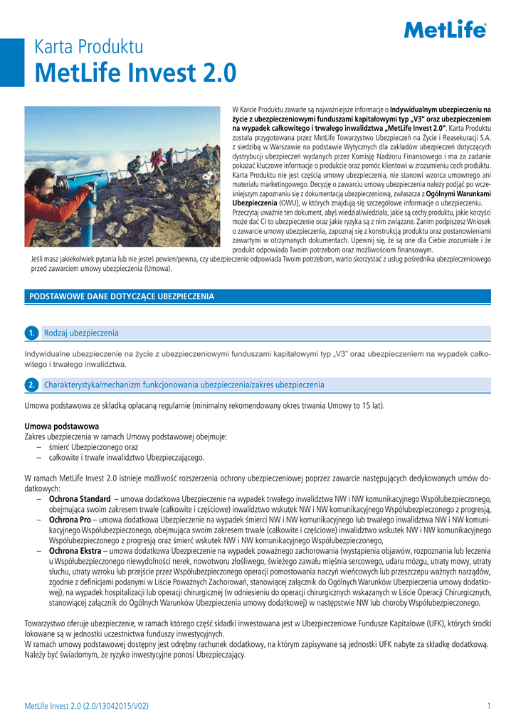 Karta Produktu MetLife Invest 2.0 W Karcie Produktu zawarte są najważniejsze informacje o Indywidualnym ubezpieczeniu na życie z ubezpieczeniowymi funduszami kapitałowymi typ „V3” oraz ubezpieczeniem na wypadek całkowitego i trwałego inwalidztwa „MetLife Invest 2.0”. Karta Produktu została przygotowana przez MetLife Towarzystwo Ubezpieczeń na Życie i Reasekuracji S.A. z siedzibą w Warszawie na podstawie Wytycznych dla zakładów ubezpieczeń dotyczących dystrybucji ubezpieczeń wydanych przez Komisję Nadzoru Finansowego i ma za zadanie pokazać kluczowe informacje o produkcie oraz pomóc klientowi w zrozumieniu cech produktu. Karta Produktu nie jest częścią umowy ubezpieczenia, nie stanowi wzorca umownego ani materiału marketingowego. Decyzję o zawarciu umowy ubezpieczenia należy podjąć po wcześniejszym zapoznaniu się z dokumentacją ubezpieczeniową, zwłaszcza z Ogólnymi Warunkami Ubezpieczenia (OWU), w których znajdują się szczegółowe informacje o ubezpieczeniu. Przeczytaj uważnie ten dokument, abyś wiedział/wiedziała, jakie są cechy produktu, jakie korzyści może dać Ci to ubezpieczenie oraz jakie ryzyka są z nim związane. Zanim podpiszesz Wniosek o zawarcie umowy ubezpieczenia, zapoznaj się z konstrukcją produktu oraz postanowieniami zawartymi w otrzymanych dokumentach. Upewnij się, że są one dla Ciebie zrozumiałe i że produkt odpowiada Twoim potrzebom oraz możliwościom finansowym. Jeśli masz jakiekolwiek pytania lub nie jesteś pewien/pewna, czy ubezpieczenie odpowiada Twoim potrzebom, warto skorzystać z usług pośrednika ubezpieczeniowego przed zawarciem umowy ubezpieczenia (Umowa). PODSTAWOWE DANE DOTYCZĄCE UBEZPIECZENIA 1. Rodzaj ubezpieczenia Indywidualne ubezpieczenie na życie z ubezpieczeniowymi funduszami kapitałowymi typ „V3” oraz ubezpieczeniem na wypadek całkowitego i trwałego inwalidztwa. 2. Charakterystyka/mechanizm funkcjonowania ubezpieczenia/zakres ubezpieczenia Umowa podstawowa ze składką opłacaną regularnie (minimalny rekomendowany okres trwania Umowy to 15 lat). Umowa podstawowa Zakres ubezpieczenia w ramach Umowy podstawowej obejmuje: –– śmierć Ubezpieczonego oraz –– całkowite i trwałe inwalidztwo Ubezpieczającego. W ramach MetLife Invest 2.0 istnieje możliwość rozszerzenia ochrony ubezpieczeniowej poprzez zawarcie następujących dedykowanych umów dodatkowych: –– Ochrona Standard – umowa dodatkowa Ubezpieczenie na wypadek trwałego inwalidztwa NW i NW komunikacyjnego Współubezpieczonego, obejmująca swoim zakresem trwałe (całkowite i częściowe) inwalidztwo wskutek NW i NW komunikacyjnego Współubezpieczonego z progresją, –– Ochrona Pro – umowa dodatkowa Ubezpieczenie na wypadek śmierci NW i NW komunikacyjnego lub trwałego inwalidztwa NW i NW komunikacyjnego Współubezpieczonego, obejmująca swoim zakresem trwałe (całkowite i częściowe) inwalidztwo wskutek NW i NW komunikacyjnego Współubezpieczonego z progresją oraz śmierć wskutek NW i NW komunikacyjnego Współubezpieczonego, –– Ochrona Ekstra – umowa dodatkowa Ubezpieczenie na wypadek poważnego zachorowania (wystąpienia objawów, rozpoznania lub leczenia u Współubezpieczonego niewydolności nerek, nowotworu złośliwego, świeżego zawału mięśnia sercowego, udaru mózgu, utraty mowy, utraty słuchu, utraty wzroku lub przejście przez Współubezpieczonego operacji pomostowania naczyń wieńcowych lub przeszczepu ważnych narządów, zgodnie z definicjami podanymi w Liście Poważnych Zachorowań, stanowiącej załącznik do Ogólnych Warunków Ubezpieczenia umowy dodatkowej), na wypadek hospitalizacji lub operacji chirurgicznej (w odniesieniu do operacji chirurgicznych wskazanych w Liście Operacji Chirurgicznych, stanowiącej załącznik do Ogólnych Warunków Ubezpieczenia umowy dodatkowej) w następstwie NW lub choroby Współubezpieczonego. Towarzystwo oferuje ubezpieczenie, w ramach którego część składki inwestowana jest w Ubezpieczeniowe Fundusze Kapitałowe (UFK), których środki lokowane są w jednostki uczestnictwa funduszy inwestycyjnych. W ramach umowy podstawowej dostępny jest odrębny rachunek dodatkowy, na którym zapisywane są jednostki UFK nabyte za składkę dodatkową. Należy być świadomym, że ryzyko inwestycyjne ponosi Ubezpieczający. MetLife Invest 2.0 (2.0/13042015/V02) 1 3. Cel produktu/funkcja/zastosowanie ubezpieczenia Indywidualne ubezpieczenie o charakterze inwestycyjno-ochronnym z istotną częścią ochronną. Celem ubezpieczenia jest ochrona życia Ubezpieczonego i zdrowia Ubezpieczającego oraz gromadzenie i inwestowanie oszczędności. 4. Towarzystwo MetLife Towarzystwo Ubezpieczeń na Życie i Reasekuracji S.A. z siedzibą w Warszawie. 5. Ubezpieczający Osoba fizyczna, która zawarła z Towarzystwem umowę ubezpieczenia oraz której zdrowie jest przedmiotem umowy ubezpieczenia. Ubezpieczający zobowiązany jest do opłacenia składki z tytułu umowy ubezpieczenia. Jest też uprawniony do otrzymania świadczenia wykupu. Ubezpieczającym może zostać osoba fizyczna, która w momencie zawarcia umowy ubezpieczenia ukończyła 18. rok życia i nie ukończyła 63. roku życia. 6. Ubezpieczony Osoba, której życie jest przedmiotem umowy ubezpieczenia. Ubezpieczonym może zostać osoba fizyczna, która w momencie zawarcia umowy ubezpieczenia ukończyła 6. miesiąc życia i nie ukończyła 63. roku życia. 7. Współubezpieczony (dotyczy dedykowanych do MetLife Invest 2.0 umów dodatkowych) Osoba fizyczna, wskazana przez Ubezpieczającego we wniosku o zawarcie umowy dodatkowej, której zdrowie oraz – w przypadku umowy dodatkowej Ochrona Pro – również życie jest przedmiotem ubezpieczenia w ramach umowy dodatkowej. Współubezpieczonym w dedykowanej umowie dodatkowej może być Ubezpieczający lub Ubezpieczony w umowie podstawowej, lub inna osoba fizyczna, która w momencie zawarcia umowy dodatkowej: –– ukończyła 6. miesiąc życia
