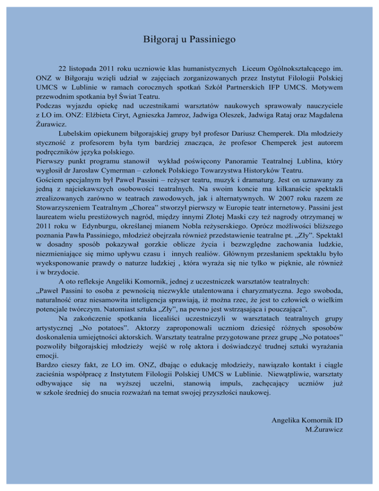 Biłgoraj u Passiniego 22 listopada 2011 roku uczniowie klas humanistycznych Liceum Ogólnokształcącego im. ONZ w Biłgoraju wzięli udział w zajęciach zorganizowanych przez Instytut Filologii Polskiej UMCS w Lublinie w ramach corocznych spotkań Szkół Partnerskich IFP UMCS. Motywem przewodnim spotkania był Świat Teatru. Podczas wyjazdu opiekę nad uczestnikami warsztatów naukowych sprawowały nauczyciele z LO im. ONZ: Elżbieta Ciryt, Agnieszka Jamroz, Jadwiga Oleszek, Jadwiga Rataj oraz Magdalena Żurawicz. Lubelskim opiekunem biłgorajskiej grupy był profesor Dariusz Chemperek. Dla młodzieży styczność z profesorem była tym bardziej znacząca, że profesor Chemperek jest autorem podręczników języka polskiego. Pierwszy punkt programu stanowił wykład poświęcony Panoramie Teatralnej Lublina, który wygłosił dr Jarosław Cymerman – członek Polskiego Towarzystwa Historyków Teatru. Gościem specjalnym był Paweł Passini – reżyser teatru, muzyk i dramaturg. Jest on uznawany za jedną z najciekawszych osobowości teatralnych. Na swoim koncie ma kilkanaście spektakli zrealizowanych zarówno w teatrach zawodowych, jak i alternatywnych. W 2007 roku razem ze Stowarzyszeniem Teatralnym „Chorea” stworzył pierwszy w Europie teatr internetowy. Passini jest laureatem wielu prestiżowych nagród, między innymi Złotej Maski czy też nagrody otrzymanej w 2011 roku w Edynburgu, określanej mianem Nobla reżyserskiego. Oprócz możliwości bliższego poznania Pawła Passiniego, młodzież obejrzała również przedstawienie teatralne pt. „Zły”. Spektakl w dosadny sposób pokazywał gorzkie oblicze życia i bezwzględne zachowania ludzkie, niezmieniające się mimo upływu czasu i innych realiów. Głównym przesłaniem spektaklu było wyeksponowanie prawdy o naturze ludzkiej , która wyraża się nie tylko w pięknie, ale również i w brzydocie. A oto refleksje Angeliki Komornik, jednej z uczestniczek warsztatów teatralnych: „Paweł Passini to osoba z pewnością niezwykle utalentowana i charyzmatyczna. Jego swoboda, naturalność oraz niesamowita inteligencja sprawiają, iż można rzec, że jest to człowiek o wielkim potencjale twórczym. Natomiast sztuka „Zły”, na pewno jest wstrząsająca i pouczająca”. Na zakończenie spotkania licealiści uczestniczyli w warsztatach teatralnych grupy artystycznej „No potatoes”. Aktorzy zaproponowali uczniom dziesięć różnych sposobów doskonalenia umiejętności aktorskich. Warsztaty teatralne przygotowane przez grupę „No potatoes” pozwoliły biłgorajskiej młodzieży wejść w rolę aktora i doświadczyć trudnej sztuki wyrażania emocji. Bardzo cieszy fakt, ze LO im. ONZ, dbając o edukację młodzieży, nawiązało kontakt i ciągle zacieśnia współpracę z Instytutem Filologii Polskiej UMCS w Lublinie. Niewątpliwie, warsztaty odbywające się na wyższej uczelni, stanowią impuls, zachęcający uczniów już w szkole średniej do snucia rozważań na temat swojej przyszłości naukowej. Angelika Komornik ID M.Żurawicz