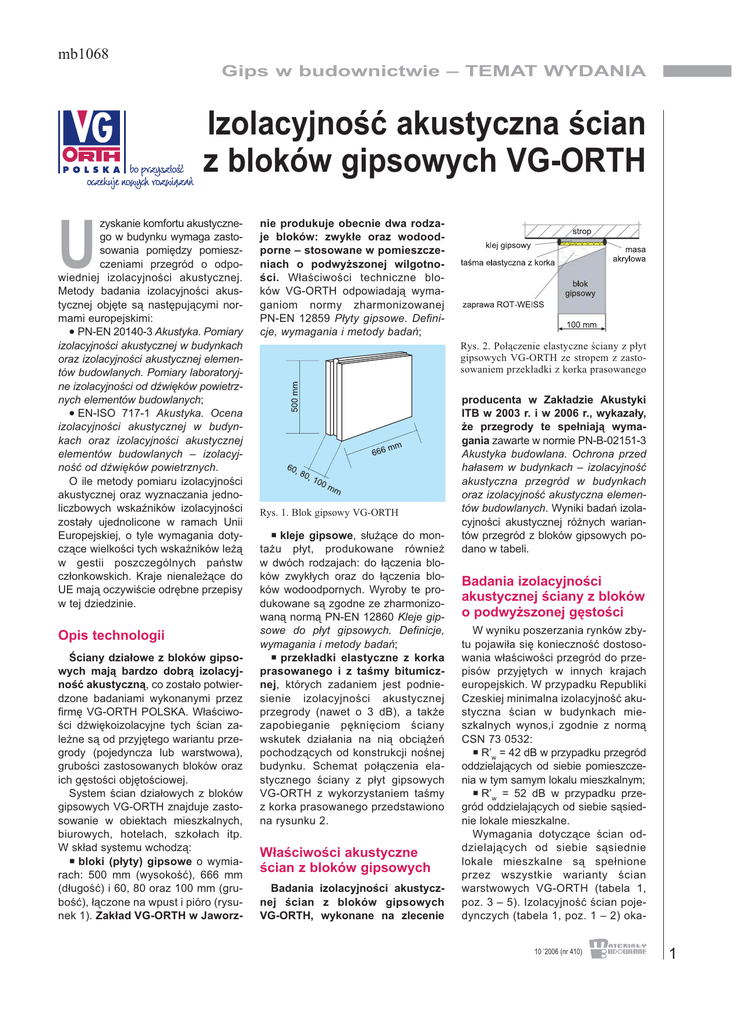 mb1068 Gips w budownictwie TEMAT WYDANIA Izolacyjnoæ akustyczna cian z bloków gipsowych VG-ORTH U zyskanie komfortu akustycznego w budynku wymaga zastosowania pomiêdzy pomieszczeniami przegród o odpowiedniej izolacyjnoci akustycznej. Metody badania izolacyjnoci akustycznej objête s¹ nastêpuj¹cymi normami europejskimi: • PN-EN 20140-3 Akustyka. Pomiary izolacyjnoci akustycznej w budynkach oraz izolacyjnoci akustycznej elementów budowlanych. Pomiary laboratoryjne izolacyjnoci od dwiêków powietrznych elementów budowlanych; • EN-ISO 717-1 Akustyka. Ocena izolacyjnoci akustycznej w budynkach oraz izolacyjnoci akustycznej elementów budowlanych izolacyjnoæ od dwiêków powietrznych. O ile metody pomiaru izolacyjnoci akustycznej oraz wyznaczania jednoliczbowych wskaników izolacyjnoci zosta³y ujednolicone w ramach Unii Europejskiej, o tyle wymagania dotycz¹ce wielkoci tych wskaników le¿¹ w gestii poszczególnych pañstw cz³onkowskich. Kraje nienale¿¹ce do UE maj¹ oczywicie odrêbne przepisy w tej dziedzinie. Opis technologii ciany dzia³owe z bloków gipsowych maj¹ bardzo dobr¹ izolacyjnoæ akustyczn¹, co zosta³o potwierdzone badaniami wykonanymi przez firmê VG-ORTH POLSKA. W³aciwoci dwiêkoizolacyjne tych cian zale¿ne s¹ od przyjêtego wariantu przegrody (pojedyncza lub warstwowa), gruboci zastosowanych bloków oraz ich gêstoci objêtociowej. System cian dzia³owych z bloków gipsowych VG-ORTH znajduje zastosowanie w obiektach mieszkalnych, biurowych, hotelach, szko³ach itp. W sk³ad systemu wchodz¹: ¡ bloki (p³yty) gipsowe o wymiarach: 500 mm (wysokoæ), 666 mm (d³ugoæ) i 60, 80 oraz 100 mm (gruboæ), ³¹czone na wpust i pióro (rysunek 1). Zak³ad VG-ORTH w Jaworz- nie produkuje obecnie dwa rodzaje bloków: zwyk³e oraz wodoodporne stosowane w pomieszczeniach o podwy¿szonej wilgotnoci. W³aciwoci techniczne bloków VG-ORTH odpowiadaj¹ wymaganiom normy zharmonizowanej PN-EN 12859 P³yty gipsowe. Definicje, wymagania i metody badañ; Rys. 2. Po³¹czenie elastyczne ciany z p³yt gipsowych VG-ORTH ze stropem z zastosowaniem przek³adki z korka prasowanego Rys. 1. Blok gipsowy VG-ORTH ¡ kleje gipsowe, s³u¿¹ce do monta¿u p³yt, produkowane równie¿ w dwóch rodzajach: do ³¹czenia bloków zwyk³ych oraz do ³¹czenia bloków wodoodpornych. Wyroby te produkowane s¹ zgodne ze zharmonizowan¹ norm¹ PN-EN 12860 Kleje gipsowe do p³yt gipsowych. Definicje, wymagania i metody badañ; ¡ przek³adki elastyczne z korka prasowanego i z tamy bitumicznej, których zadaniem jest podniesienie izolacyjnoci akustycznej przegrody (nawet o 3 dB), a tak¿e zapobieganie pêkniêciom ciany wskutek dzia³ania na ni¹ obci¹¿eñ pochodz¹cych od konstrukcji nonej budynku. Schemat po³¹czenia elastycznego ciany z p³yt gipsowych VG-ORTH z wykorzystaniem tamy z korka prasowanego przedstawiono na rysunku 2. W³aciwoci akustyczne cian z bloków gipsowych Badania izolacyjnoci akustycznej cian z bloków gipsowych VG-ORTH, wykonane na zlecenie producenta w Zak³adzie Akustyki ITB w 2003 r. i w 2006 r., wykaza³y, ¿e przegrody te spe³niaj¹ wymagania zawarte w normie PN-B-02151-3 Akustyka budowlana. Ochrona przed ha³asem w budynkach izolacyjnoæ akustyczna przegród w budynkach oraz izolacyjnoæ akustyczna elementów budowlanych. Wyniki badañ izolacyjnoci akustycznej ró¿nych wariantów przegród z bloków gipsowych podano w tabeli. Badania izolacyjnoci akustycznej ciany z bloków o podwy¿szonej gêstoci W wyniku poszerzania rynków zbytu pojawi³a siê koniecznoæ dostosowania w³aciwoci przegród do przepisów przyjêtych w innych krajach europejskich. W przypadku Republiki Czeskiej minimalna izolacyjnoæ akustyczna cian w budynkach mieszkalnych wynos,i zgodnie z norm¹ CSN 73 0532: ¡ Rw = 42 dB w przypadku przegród oddzielaj¹cych od siebie pomieszczenia w tym samym lokalu mieszkalnym; ¡ Rw = 52 dB w przypadku przegród oddzielaj¹cych od siebie s¹siednie lokale mieszkalne. Wymagania dotycz¹ce cian oddzielaj¹cych od siebie s¹siednie lokale mieszkalne s¹ spe³nione przez wszystkie warianty cian warstwowych VG-ORTH (tabela 1, poz. 3 5). Izolacyjnoæ cian pojedynczych (tabela 1, poz. 1 2) oka10 2006 (nr 410) 1 TEMAT WYDANIA Gips w budownictwie Wyniki badañ izolacyjnoci akustycznej cian dzia³owych VG-ORTH wg badañ wykonanych w Zak³adzie Akustyki ITB w 2003 r. i w 2006 r Schemat ciany Opis ciany Gruboæ Masa poJednoliczbowe wskaniki ciany wierzch- izolacyjnoci akustycznej [dB] [mm] niowa wskanik ciany widmowy izolacyj[kg/m2] wskanik noci akusadaptacyjny C tycznej (dla dwiêków w³aciwej bytowych) Rw CIANY POJEDYNCZE 1. ciana pojedyncza z bloków gipsowych VG-ORTH gruboci 80 mm i gêstoci objêtociowej 900 kg/m3 80 72 39 -1 2. ciana pojedyncza z ³yt gipsowych VG-ORTH gruboci 100 mm i gêstoci objêtociowej 900 kg/m3 100 90 41 -1 CIANY WARSTWOWE 3. ciana warstwowa: blok gipsowy VG-ORTH gruboci 80 mm i gêstoci objêtociowej 900 kg/m3 we³na mineralna gruboci 50 mm gêstoci objêtociowej 65 kg/m3 pustka powietrzna 10 mm blok gipsowy VG-ORTH gruboci 80 mm i gêstoci objêtociowej 900 kg/m3 220 150 54 -1 4. ciana warstwowa: blok gipsowy VG-ORTH gruboci 100 mm gêstoci objêtociowej 900 kg/m3 we³na mineralna gruboci 50 mm i gêstoci objêtociowej 65 kg/m3 pustka powietrzna 10 mm blok gipsowy VG-ORTH gruboci 80 mm i gêstoci objêtociowej 900 kg/m3 240 170 56 -1 5. ciana warstwowa: blok gipsowy VG-ORTH gruboci 100 mm gêstoci objêtociowej 900 kg/m3 we³na mineralna gruboci 50 mm i gêstoci objêtociowej 65 kg/m3 pustka powietrzna 10 mm blok gipsowy VG-ORTH gruboci 100 mm i gêstoci objêtociowej 900 kg/m3 260 za³a siê jednak niewystarczaj¹ca w Republice Czeskiej w przypadku cian oddzielaj¹cych od siebie pomieszczenia w tym samym lokalu mieszkalnym. W zwi¹zku z tym, ¿e zastosowanie cian warstwowych by³oby ekonomicznie nieuzasadnione, producent zdecydowa³ siê przeprowadziæ badania laboratoryjne izolacyjnoci akustycznej pojedynczej ciany z bloków gips