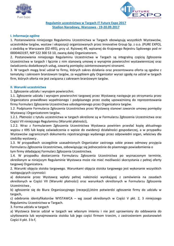 Regulamin uczestnictwa w Targach IT Future Expo 2017 Stadion Narodowy, Warszawa - 19-20.09.2017 I. Informacje ogólne 1. Postanowienia niniejszego Regulaminu Uczestnictwa w Targach obowiązują wszystkich Wystawców, uczestników targów, wystaw i ekspozycji organizowanych przez Innovative Group Sp. z o.o. (PURE EXPO), z siedzibą w Warszawie (02-495), przy ul. Ryżowej 49, wpisanej do Krajowego Rejestru Sądowego pod nr 0000463197, NIP 522 300 53 10, zwaną dalej Organizatorem. 2. Postanowienia niniejszego Regulaminu Uczestnictwa w Targach są integralną częścią Zgłoszenia Uczestnictwa w targach i łącznie z nim stanowią umowę o wynajmie powierzchni wystawienniczej oraz świadczeniu dodatkowych usług, zawartą pomiędzy zainteresowanymi stronami. 3. W targach mogą brać udział te firmy, których zakres działania oraz prezentowana oferta są zgodne z tematyką i zakresem branżowym targów, za wyjątkiem gdy Organizator wyrazi zgodę na udział w targach firm, których oferta nie jest związana z zakresem branżowym targów. II. Warunki uczestnictwa 1. Zgłoszenie udziału i wynajem powierzchni. 1.1. Zgłoszenie udziału i wynajem powierzchni targowej przez Wystawcę następuje po otrzymaniu przez Organizatora prawidłowo wypełnionego i podpisanego przez osobę upoważnioną do reprezentowania firmy Formularz Zgłoszenia Uczestnictwa udostępnionego przez Organizatora targów. 1.2. Podpisanie Formularza Zgłoszenia Uczestnictwa przez Wystawcę stanowi zawarcie umowy pomiędzy Wystawcą i Organizatorem targów. 1.2.1. Płatności z tytułu uczestnictwa w targach określone są w Formularzu Zgłoszenia Uczestnictwa oraz Części VII niniejszego Regulaminu (Warunki płatności), 1.2.2. Wraz z Formularzem Zgłoszenia Uczestnictwa Wystawca powinien przesłać kopię aktualnego wypisu z KRS lub kopię zaświadczenia o wpisie do ewidencji działalności gospodarczej, a w przypadku Wystawców zagranicznych dokumentu rejestracyjnego wydanego przez odpowiedni organ, właściwy dla siedziby wystawcy . 1.3. W przypadkach szczególnie uzasadnionych Organizator zastrzega sobie prawo odmowy przyjęcia Formularzu Zgłoszenia Uczestnictwa, zobowiązując się jednocześnie do pisemnego powiadomienia o tym firmy składającej Formularz Zgłoszenia Uczestnictwa. 1.4. W przypadku dostarczenia Formularzu Zgłoszenia Uczestnictwa po wyznaczonym terminie, określonym w niniejszym Regulaminie Wystawca może nie mieć możliwości skorzystania z pełnej oferty targowej Organizatora. 2. Warunki objęcia stoiska targowego. Warunkami objęcia stoiska targowego jest wykonanie wszystkich następujących czynności: a) dokonanie przez Wystawcę wpłaty pełnej należności wynikającej z zamówienia na zasadach określonych w Części VII (Warunki płatności) oraz warunkach określonych w Formularzu Zgłoszenia Uczestnictwa , b) zgłoszenie się do Biura Organizacyjnego (recepcji),które potwierdzi zgłoszenie firmy do udziału w targach, c) odebranie identyfikatorów WYSTAWCA – wg zasad określonych w Części V pkt. 2, 3 niniejszego Regulaminu Uczestnictwa w Targach. 3. Forma udziału w targach a) Wystawca bierze udział w targach we własnym imieniu i nie jest uprawniony do oddawania do użytkowania lub wynajmowania stoiska lub jego części firmom trzecim, z zastrzeżeniem postanowień Części II pkt. 3 b-f, b) Wystawca uprawniony jest do udostępnienia całości lub części powierzchni wystawienniczej innemu Wystawcy na zasadach Współwystawcy jedynie za pisemną zgodą Organizatora targów, c) w przypadku wspólnych ekspozycji kilku firm na jednym stoisku należy podać wykaz firm w Zgłoszeniu Uczestnictwa oraz dokonać wpisu Współwystawców w Informatorze Targowym, d) Wystawca jest zobowiązany do wniesienia w imieniu Współwystawcy wszelkich opłat i kosztów związanych z uczestnictwem Współwystawcy w targach; Wystawca ponosi pełną odpowiedzialność za działania Współwystawcy, jak za swoje własne, e) Wystawca oświadcza, że dokonuje zgłoszenia udziału Współwystawcy w targach za jego zgodą co potwierdza parafując ten fakt na Zgłoszeniu Uczestnictwa. f) Na jednym stoisku o powierzchni 6m2, możliwy jest udział maksymalnie dwóch Wystawców (Wystawca Główny + Współwystawca). Współwystawca winien być uprzednio zgłoszony do Organizatora Targów, przez Wystawcę Głównego. Na stoiskach o powierzchniach mniejszych niż 6m2, nie jest przewidziana możliwość udziału Współwystawcy. 4. Organizator przydziela Wystawcy powierzchnię wystawienniczą stosownie do kolejności wpływu Zgłoszeń Uczestnictwa, projektu zabudowy powierzchni wystawienniczej oraz warunków organizacyjno – technicznych targów. Organizator zastrzega sobie prawo do zmiany lokalizacji przydzielonej powierzchniwystawienniczej ze względów projektowo-technicznych i organizacyjnych. W takim przypadku Wystawcy nie przysługuje prawo do odszkodowania ze strony Organizatora. 5. Wraz z przesłaniem Zgłoszenia Uczestnictwa w targach Wystawca udziela zgody Organizatorowi na używanie logotypu i oznaczenia firmy dla celów związanych z realizacją targów. Jednocześnie Wystawca oświadcza, że logotyp oraz oznaczenie firmy, przekazane Organizatorowi stanowią własność Wystawcy i przekazując powyższe elementy Organizatorowi targów nie zostaną naruszone jakiekolwiek prawa osób trzecich. III. Zabudowa Stoiska 1. Wystawca, który zamówił powierzchnię niezabudowaną i zlecił wykonanie zabudowy wyspecjalizowanej firmie lub wykonuje ją we własnym zakresie ma obowiązek: a) zgłosić na piśmie do Organizatora następujące dane: nazwę firmy, dane teleadresowe oraz NIP firmy, która będzie wykonywała zabudowę stoiska na targach , b) uzgodnić z Organizatorem targów i przedstawić mu do zatwierdzenia najpóźniej na 30 dni przed rozpoczęciem targów projekty: wizualizacji zabudowy wynajętej powierzchni, instalacji elektrycznej, instalacji wodnokanalizacyjnej, i wszelkich innych wchodząc