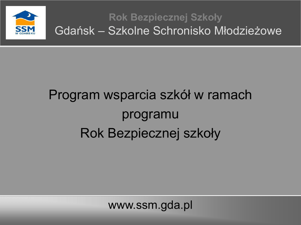 Rok Bezpiecznej Szkoły Gdańsk – Szkolne Schronisko Młodzieżowe Program wsparcia szkół w ramach programu Rok Bezpiecznej szkoły www.ssm.gda.pl Rok Bezpiecznej Szkoły Gdańsk – Szkolne Schronisko Młodzieżowe Program wsparcia szkół Szkolne Schronisko Młodzieżowe w Gdańsku jest placówką oświatowo-wychowawcza, której zadaniem jest zapewnie szerokim kręgom dzieci i młodzieży warunków do czynnego i systematycznego uczestnictwa w różnych formach krajoznawstwa i turystyki szkolnej. Ponadto realizuje zadania edukacyjne, wychowawcze, profilaktyczne, prozdrowotne i sportowo-rekreacyjne. www.ssm.gda.pl Rok Bezpiecznej Szkoły Gdańsk – Szkolne Schronisko Młodzieżowe Program wsparcia szkół Gmina Miasto Gdańsk wspiera rozwój działalności pozaszkolnej. Działalność pozaszkolna organizowana przez gdańskie placówki nie tylko wypełnia czas wolny uczniów, rozwija ich zainteresowania ale również pozwala oderwać się od codziennych obowiązków szkolnych. www.ssm.gda.pl Rok Bezpiecznej Szkoły Gdańsk – Szkolne Schronisko Młodzieżowe Program wsparcia szkół Schronisko otwarte jest na potrzeby uczniów, dostosowuje ofertę do ich potrzeb. Schronisko wspiera nauczycieli i opiekunów. Schronisko współpracuje ze szkołami, klubami sportowymi, organizacjami pozarządowymi w celu uatrakcyjnienia swojej oferty. Z uwagi na specyfikę naszej działalności, nasza oferta skierowana jest do dzieci i młodzieży z całego kraju. www.ssm.gda.pl Rok Bezpiecznej Szkoły Gdańsk – Szkolne Schronisko Młodzieżowe Program wsparcia szkół Z uwagi na specyfikę naszej działalności, nasza oferta skierowana jest do dzieci i młodzieży z całego kraju. Uczestnikami naszych zajęć są zarówno dzieci ze środowiska lokalnego jak również dzieci z wielu innych miejscowości, które korzystają z naszych noclegów. www.ssm.gda.pl Rok Bezpiecznej Szkoły Gdańsk – Szkolne Schronisko Młodzieżowe Program wsparcia szkół Nauczyciele Schroniska w swej codziennej pracy podejmują działania wychowawcze i profilaktyczne. Udział młodzieży w zajęciach pozalekcyjnych prowadzonych przez schronisko to nie tylko rozwijanie zainteresowań. Schronisko umożliwia spotykanie się na jednym gruncie młodzieży z różnych krajów, kultur, religii. Schronisko kładzie nacisk na integrację udostępniając szerokim kręgom dzieci i młodzieży swoje obiekty sportowe i rekreacyjne. www.ssm.gda.pl Rok Bezpiecznej Szkoły Gdańsk – Szkolne Schronisko Młodzieżowe Program wsparcia szkół Schronisko dba o utrzymywanie bezpiecznych i higienicznych warunków pobytu dzieci i młodzieży. Obiekty objęte są monitoringiem co w dużej mierze zwiększyło stan bezpieczeństwa na terenie placówek. Diagnozowanie problemów odbywa się za pośrednictwem ankiet, książki skarg i zażaleń oraz bezpośrednich rozmów. www.ssm.gda.pl Rok Bezpiecznej Szkoły Gdańsk – Szkolne Schronisko Młodzieżowe Program wsparcia szkół Schronisko otwarte jest na potrzeby środowiska lokalnego. Zachęcamy młodzież do udziału w konkurach, zawodach sportowych i wielu innych działaniach, które zmotywują dzieci i młodzież do wyjścia z domu i aktywnego spędzania wolnego czasu. Współpracujemy z instytucjami i organizacjami np. Sanepid, Policja , Straż Pożarna, PORD, PTTK, PTSM, GOT, PROT. www.ssm.gda.pl Rok Bezpiecznej Szkoły Gdańsk – Szkolne Schronisko Młodzieżowe ROK BEZPIECZNEJ SZKOŁY OBSZARY DZIAŁANIA www.ssm.gda.pl Rok Bezpiecznej Szkoły Gdańsk – Szkolne Schronisko Młodzieżowe Bezpieczny wypoczynek 1. Organizacja czasu wolnego dla dzieci i młodzieży szkół Miasta Gdańska: - Prezentacja pt. "Bezpieczna wycieczka” Mariusz Penar, Olga Penar, Gdańsk 2013. - Konkurs wiedzy pt. "Poznałem Gdańsk” Pracownia Turystyk, Rekreacji i Twórczego Rozwoju w SSM w Gdańsku, Maja Kuptel-Niska. - zajęcia stałe w PTiR, www.ssm.gda.pl Rok Bezpiecznej Szkoły Gdańsk – Szkolne Schronisko Młodzieżowe - - Bezpieczny wypoczynek Ramowy program wycieczki do Trójmiasta dla dzieci i młodzieży, Maja Kuptel-Niska, Pracownia Turystyk, Rekreacji i Twórczego Rozwoju w SSM w Gdańsku. Bezpieczeństwo na wycieczce - ramowy program szkolenia, Szkolne Schronisko Młodzieżowe w Gdańsku, Mariusz Penar www.ssm.gda.pl Rok Bezpiecznej Szkoły Gdańsk – Szkolne Schronisko Młodzieżowe Promujemy zdrowy styl życia 1. Organizacja zajęć sportowo rekreacyjnych na terenie SSM w Gdańsku. 2. Konkurs zapraszamy do Gdańska pt. "E-mail do przyjaciela, Pracownia Turystyk, Rekreacji i Twórczego Rozwoju w SSM w Gdańsku, Maja Kuptel-Niska. www.ssm.gda.pl Rok Bezpiecznej Szkoły Gdańsk – Szkolne Schronisko Młodzieżowe Promujemy zdrowy styl życia 3. Kurs Młodzieżowego Organizatora Turystyki organizowany we współpracy z PTTK. 4. Ogniska integracyjne na terenie SSM w Gdańsku. 6. Dostępność bazy sportowo-rekreacyjnej dla dzieci i młodzieży ze środowiska lokalnego. www.ssm.gda.pl Rok Bezpiecznej Szkoły Gdańsk – Szkolne Schronisko Młodzieżowe Pierwsza pomoc 1. Scenariusz zajęć z pierwszej pomocy dla dzieci i młodzieży, Dorota Kuffel-Wojciechowska, Pracownia Turystyk, Rekreacji i Twórczego Rozwoju w SSM w Gdańsku. 2. Konkurs Jestem Ratownikiem, Dorota KuffelWojciechowska, Pracownia Turystyk, Rekreacji i Twórczego Rozwoju w SSM w Gdańsku, Mariusz Penar. Zajęcia prowadzone przez nauczycieli PTiR. www.ssm.gda.pl Rok Bezpiecznej Szkoły Gdańsk – Szkolne Schronisko Młodzieżowe Pierwsza pomoc 3. Prelekcje dotyczące bezpieczeństwa w czasie ferii i wakacji, Mariusz Penar. www.ssm.gda.pl Rok Bezpiecznej Szkoły Gdańsk – Szkolne Schronisko Młodzieżowe Profilaktyka 1. Egzekwowanie regulaminów Schroniska. 2. Scenariusz zajęć plastycznych pt. "O uczuciach", Bogumiła Szczepańska, Pracownia Turystyk, Rekreacji i Twórczego Rozwoju w SSM w Gdańsku. 3. Scenariusz imprezy rekreacyjnej z noclegiem "Pierwsze koty za płoty", Janusz Kamelski, Pracownia Turystyk, Rekreacji i Twórcze