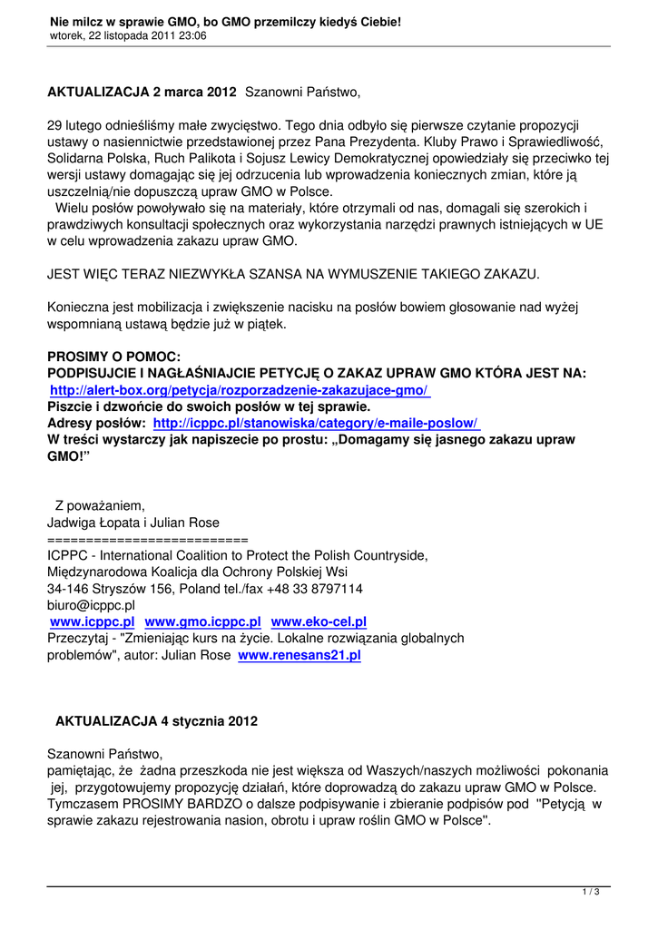 Nie milcz w sprawie GMO, bo GMO przemilczy kiedyś Ciebie! wtorek, 22 listopada 2011 23:06 AKTUALIZACJA 2 marca 2012 Szanowni Państwo, 29 lutego odnieśliśmy małe zwycięstwo. Tego dnia odbyło się pierwsze czytanie propozycji ustawy o nasiennictwie przedstawionej przez Pana Prezydenta. Kluby Prawo i Sprawiedliwość, Solidarna Polska, Ruch Palikota i Sojusz Lewicy Demokratycznej opowiedziały się przeciwko tej wersji ustawy domagając się jej odrzucenia lub wprowadzenia koniecznych zmian, które ją uszczelnią/nie dopuszczą upraw GMO w Polsce. Wielu posłów powoływało się na materiały, które otrzymali od nas, domagali się szerokich i prawdziwych konsultacji społecznych oraz wykorzystania narzędzi prawnych istniejących w UE w celu wprowadzenia zakazu upraw GMO. JEST WIĘC TERAZ NIEZWYKŁA SZANSA NA WYMUSZENIE TAKIEGO ZAKAZU. Konieczna jest mobilizacja i zwiększenie nacisku na posłów bowiem głosowanie nad wyżej wspomnianą ustawą będzie już w piątek. PROSIMY O POMOC: PODPISUJCIE I NAGŁAŚNIAJCIE PETYCJĘ O ZAKAZ UPRAW GMO KTÓRA JEST NA: http://alert-box.org/petycja/rozporzadzenie-zakazujace-gmo/ Piszcie i dzwońcie do swoich posłów w tej sprawie. Adresy posłów: http://icppc.pl/stanowiska/category/e-maile-poslow/ W treści wystarczy jak napiszecie po prostu: „Domagamy się jasnego zakazu upraw GMO!” Z poważaniem, Jadwiga Łopata i Julian Rose ========================== ICPPC - International Coalition to Protect the Polish Countryside, Międzynarodowa Koalicja dla Ochrony Polskiej Wsi 34-146 Stryszów 156, Poland tel./fax +48 33 8797114 [email protected] www.icppc.pl www.gmo.icppc.pl www.eko-cel.pl Przeczytaj - "Zmieniając kurs na życie. Lokalne rozwiązania globalnych problemów", autor: Julian Rose www.renesans21.pl AKTUALIZACJA 4 stycznia 2012 Szanowni Państwo, pamiętając, że żadna przeszkoda nie jest większa od Waszych/naszych możliwości pokonania jej, przygotowujemy propozycję działań, które doprowadzą do zakazu upraw GMO w Polsce. Tymczasem PROSIMY BARDZO o dalsze podpisywanie i zbieranie podpisów pod ''Petycją w sprawie zakazu rejestrowania nasion, obrotu i upraw roślin GMO w Polsce''. 1/3 Nie milcz w sprawie GMO, bo GMO przemilczy kiedyś Ciebie! wtorek, 22 listopada 2011 23:06 Petycję można podpisać tutaj: http://alert-box.org/petycja/rozporzadzenie-zakazujace-gmo/ Petycję można wydrukować tutaj: http://alert-box.org/wp-content/uploads/ulotkadopetycji.pdf Poniżej relacja z Festiwalu Kultura Natura Stop GMO Festiwal Kultura Natura STOP GMO - Jadwiga Łopata, Julian Rose Połączmy swe siły w walce o dobrą przyszłość. WSPIERAJ DZIAŁANIA NA RZECZ POLSKI WOLNEJ OD GMO http://www.icppc.pl/antygmo/pomoz-kampani/ Z poważaniem, Jadwiga Łopata i Julian Rose ========================== ICPPC - International Coalition to Protect the Polish Countryside, Międzynarodowa Koalicja dla Ochrony Polskiej Wsi 34-146 Stryszów 156, Poland tel./fax +48 33 8797114 [email protected] www.icppc.pl www.gmo.icppc.pl www.eko-cel.pl Przeczytaj - "Zmieniając kurs na życie. Lokalne rozwiązania globalnych problemów", autor: Julian Rose www.renesans21.pl Pierwszy post z dnia 23 listopada 2011 Alarm dla WSZYSTKICH, którym bliskie są hasła "KULTURA i NATURA. STOP GMO! OCALIĆ POLSKIE NASIONA" . Jeśłi nie chcesz być zmodyfikowany, działaj TERAZ! Kilka dni temu został podany do wiadomości ''nowy'', rządowy projekt ustawy o nasiennictwie, która otwiera Polskę na uprawy GMO. Brak w niej zapisów o zakazie obrotu nasion GMO i o zakazie wpisywania do katalogu krajowego odmian genetycznie zmodyfikowanych, co otworzy Polskę całkowicie na uprawy GMO... Ustawodawcy śpieszą się bardzo (nawet nie poczekali do stworzenia nowego rządu); musimy szybko i skutecznie działać, bo teraz to już ostateczna bitwa. W związku z powyższym organizujemy ogólnopolską akcję pt.: FESTIWAL "KULTURA i NATURA. STOP GMO! OCALIĆ POLSKIE NASIONA". ZAPRASZAMY WSZYSTKICH, którym bliskie są hasła festiwalu, do organizowania swojego wydarzenia w ramach tej ogólnopolskiej akcji pt.: FESTIWAL "KULTURA i NATURA. STOP GMO! OCALIĆ POLSKIE NASIONA". TERMIN: 9-10 GRUDNIA 2011 W tych dniach festiwale (duże i małe) odbędą się w dużych miastach i małych wioskach. Połączy je wspólne hasło i idea: "KULTURA i NATURA. STOP GMO! OCALIĆ POLSKIE NASIONA". 2/3 Nie milcz w sprawie GMO, bo GMO przemilczy kiedyś Ciebie! wtorek, 22 listopada 2011 23:06 Mamy nadzieję, że to będzie też Pospolite Ruszenie Artystów dla Polski Wolnej od GMO. Podczas festiwali będą: koncerty, spektakle, wystawy, spotkania z artystami, jarmarki zdrowej żywności i wiejskiej sztuki, filmy o zagrożeniach GMO, stoiska i warsztaty edukacyjne, wykłady naukowców i praktyków na temat zagrożeń GMO. Dołącz do nas (potrzebujemy pomocy w organizacji festiwali) lub ZORGANIZUJ swój festiwal. Organizatorzy: KOALICJA "Polska Wolna od GMO" Międzynarodowa Koalicja dla Ochrony Polskiej Wsi - ICPPC Stowarzyszenie "Polska Wolna od GMO" Współorganizatorzy: to miejsce czeka na Ciebie:) KONTAKT: ICPPC - International Coalition to Protect the Polish Countryside, Międzynarodowa Koalicja dla Ochrony Polskiej Wsi 34-146 Stryszów 156, Poland tel./fax +48 33 8797114 [email protected] www.icppc.pl www.gmo.icppc.pl www.eko-cel.pl Zajrzyj też na ciekawą stronę FESTIWAL GMO http://www.festiwalstopgmo.pl/ gdzie znajdziesz najbliższą Twojego miejsca zamieszkania festiwalową imprezę. 3/3