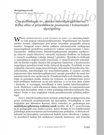 Czy politolo Maciej Karczewski Uniwersytet im. Adama Mickiewicza Czy politologia to „nauka interdyscyplinarna”? Kilka słów o przedmiocie poznania i tożsamości dyscypliny W śród przedstawicieli nauki polskiej od wielu lat zawrotną karierę robi pojęcie interdyscyplinarności. Współcześnie ten bardzo modny termin odmieniany jest przez wszystkie przypadki niczym mantra. Osiągnął wręcz status zaklęcia automatycznie nadającego poszczególnym projektom naukowym waloru nowoczesności i innowacyjności. Deklarowana interdyscyplinarność projektu naukowego stanowi często kluczowy warunek uzyskania środków na badania w ramach wszelkiego rodzaju dotacji i grantów. Zjawisko to dotknęło w największym stopniu nauki stosowane, w ramach których wykształciły się bardzo wąskie obszary lub programy badawcze, z konieczności angażujące przedstawicieli wielu różnych dyscyplin. Przykłady w tym względzie stanowić mogą neurobiologia, inżynieria biomedyczna, biocybernetyka, astrobiologia czy neuroinformatyka. Z czasem szeroko pojmowana idea interdyscyplinarności zaczęła przenikać do nauk humanistycznych oraz społecznych. Przedstawiciele tych dziedzin, podążając za panującą modą, starają się wykazać, że podejmowane przez nich problemy badawcze są na tyle złożone, a co za tym idzie ważne i doniosłe, iż wymagają weryfikacji w toku badań interdyscyplinarnych. Niektórzy z nich idą jeszcze dalej, twierdząc, że reprezentowane przez nich dyscypliny same w sobie posiadają interdyscyplinarny charakter. Prym w tym względzie wiodą przedstawiciele polskiej politologii. Teza o interdyscyplinarnym statusie politologii propagowana jest przez czołowych przedstawicieli tej dyscypliny. Przykładem w tym względzie jest Mirosław Karwat, który twierdzi, że „politologia jest multidyscyplinarną rodziną nauk [podkr. M. K.]” i przyrównuje ją do pedagogiki oraz nauki o pracy. Autor dodaje, że we współczesnej politologii przezwyciężono już formalistyczne podejście, w którym odrębność tej dyscypliny warunkować będzie jasno określony i wyłączny przedmiot badań lub unikatowe metody badawcze. Jak twierdzi nr 7, wiosna-lato 2013 [159] Maciej Karczewski M. Karwat „w istocie i przedmiot, i metody humanistyki/nauk społecznych są dorobkiem i narzędziem wspólnym”, a to, co różni poszczególne dyscypliny to „aspekt badania, wyrażony w stawianych pytaniach i stosowanych pojęciach”1. Podobnego zdania jest Barbara Krauz-Mozer, dla której „nauki polityczne stanowią syntezę wielu dyscyplin [podkr. M. K.] – często o odmiennych, zróżnicowanych metodologiach przedmiotowych – i zajmują się wszystkim, co ma znaczenie polityczne”. Autorka dodaje, że nadawanie politologii statusu jednolitej i odrębnej dyscypliny nauki stanowi cel nazbyt ambitny. Zamiast tego należy podkreślać wspólnotę problemów badawczych, które przenikać mogą wiele różnych dyscyplin2. Na koniec przytoczyć można opinię Tadeusza Klementewicza, według którego „przedmioty badań poszczególnych dyscyplin humanistycznych przenikają się, [podkr. M. K.] krzyżują tworząc sieci powiązań między dziedzinami”. Autor zaznacza, że wszelkie poszukiwania specyficznego przedmiotu poznania lub właściwych metod badawczych w politologii są z góry skazane na niepowodzenie3. Przytoczeni autorzy wprost twierdzą, że politologia, podobnie jak inne nauki społeczne/humanistyczne, posiada specyficzny multi- lub interdyscyplinarny charakter. Nie da się w jej ramach jasno i klarownie wyznaczyć właściwego tylko dla niej przedmiotu poznania ani też wyróżniających ją metod badawczych. To, co konstytuuje politologię, to wspólnota problemów i aspektów badawczych, a także stosowanych pojęć i kategorii. Radykalnie odmienne spojrzenie na ten problem prezentuje Ryszard Skarzyński. Twierdzi, że poszczególne dyscypliny nauki wyróżnia się przez pryzmat ich jasno zdefiniowanego przedmiotu poznania. Jego zdaniem politologia nie różni się pod tym względem od takich dyscyplin, jak biologia, fizyka czy historia. Według R. Skarzyńskiego negowanie istnienia przedmiotu poznania politologii oznacza również odmawianie jej statusu dyscypliny nauki. Badacz dodaje, że pojęcie interdyscyplinarności stosowane jest w stosunku do politologii w sposób nieuprawniony. Badania interdyscyplinarne w politologii są według niego mylone z celowym korzystaniem z dorobku nauk pomocniczych. Nie ma bowiem dyscypliny, poza naukami formalnymi, która nie korzystałaby z dorobku innych 1 M. Karwat, Polityczność i upolitycznienie. Metodologiczne ramy analizy, „Studia Politologiczne” 2010, vol. 17, s. 65–67 2 B. Krauz-Mozer, Teorie polityki. Założenia metodologiczne, Warszawa 2007, s. 15. 3 T. Klementewicz, Rozumienie polityki. Zarys metodologii nauki o polityce, Warszawa 2010, s. 30. [160] refleksje Czy politologia to „nauka interdyscyplinarna”? Kilka słów o przedmiocie... dyscyplin w postaci materiału pomocniczego. Nie zmienia to jednak faktu, że dla R. Skarzyńskiego podstawą istnienia politologii jako dyscypliny nauki jest jasno określony i wyjątkowy tylko dla niej przedmiot poznania. Dzięki niemu politologia odpowiada na pytania i problemy, na które odpowiedzi nie jest w stanie znaleźć żadna inna dyscyplina przez co wnosi ona swój istotny wkład do całego dorobku ludzkiej wiedzy4. W istocie R. Skarzyński w swoich poglądach powołuje się na ustalenia sformułowane przed laty przez Jana Woleńskiego. W 1975 r. wyodrębnił on dwie zasadniczo odmienne orientacje w trwającej ówcześnie dyskusji nad statusem politologii jako dyscypliny. Pierwsza, określana przez niego jako pluralistyczna, uznawała politykę (polityczność) za przedmiot rozważań wielu różnych dyscyplin, takich jak historia, prawo, socjologia czy ekonomia. W swojej skrajnej postaci pluralizm definiował politologię jako swoisty konglomerat wielu nurtów badaw