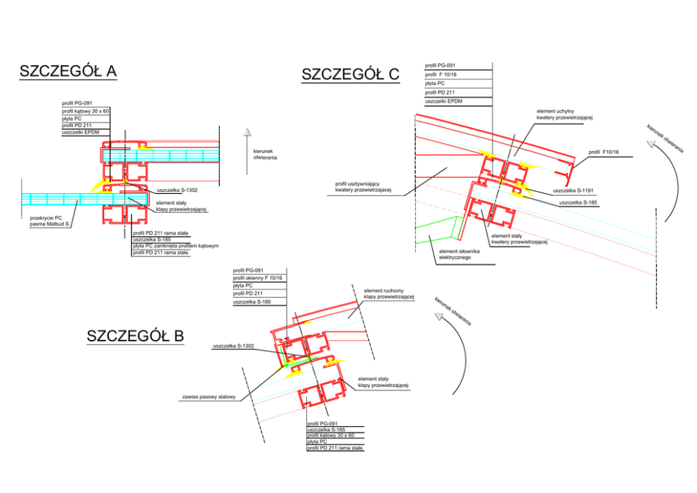 profil PG-091 SZCZEGÓŁ A SZCZEGÓŁ C profil F 10/16 płyta PC profil PD 211 uszczelki EPDM profil PG-091 element uchylny kwatery przewietrzającej profil kątowy 30 x 60 płyta PC profil PD 211 uszczelki EPDM kie ru ne k kierunek otwierania profil F10/16 profil usztywniający kwatery przewietrzajacej uszczelka S-1302 uszczelka S-1191 uszczelka S-185 element stały klapy przewietrzającej przekrycie PC pasma Matbud S profil PD 211 rama stała uszczelka S-185 płyta PC zamknięta profilem kątowym profil PD 211 rama stała element stały kwatery przewietrzającej element siłownika elektrycznego profil PG-091 profil okienny F 10/16 płyta PC element ruchomy klapy przewietrzającej profil PD 211 uszczelka S-185 SZCZEGÓŁ B uszczelka S-1302 element stały klapy przewietrzającej zawias pasowy stalowy profil PG-091 uszczelka S-185 profil kątowy 30 x 60 płyta PC profil PD 211 rama stała kie ru ne ko tw ier an ia ot wi er an ia