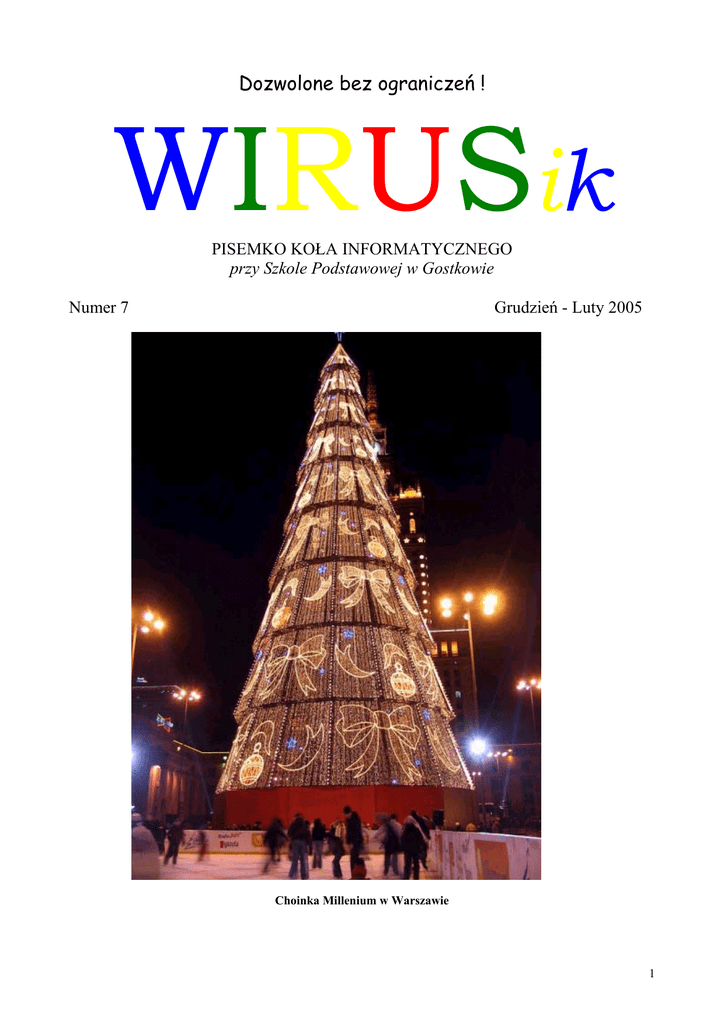 Dozwolone bez ograniczeń ! WIRUSik PISEMKO KOŁA INFORMATYCZNEGO przy Szkole Podstawowej w Gostkowie Numer 7 Grudzień - Luty 2005 Choinka Millenium w Warszawie 1 Koleżanki i koledzy! To już VI wydanie naszej gazetki! Kilka słów od redakcji... Wszystkim kochanym czytelnikom składamy życzenia wytrwałości w zdobywaniu nowych wiadomości i umiejętności w nowym roku szkolnym, a także widocznych efektów w postaci wysokich not w dzienniku. ( Ku szczerej radości nauczycieli i rodziców – przypis redakcji.) W skład redakcji gazetki w tym roku szkolnym należą w dalszym ciągu uczniowie klasy V (– byłej IV) oraz IV (– byłej III). REDAKCJA GAZETKI : członkowie koła informatycznego, pod czujnym pani Iwony Liszki Życzymy miłej lektury. Na okładce: Choinka Millenium była budowana od 31 października 2005, natomiast uroczyste otwarcie miało miejsce 6 grudnia - na Mikołajki. Choinka świąteczna ma wysokość 72m i waży 180 ton. Oświetla ją 2 mln lampek, 15 tys. bombek, 18 km świecącego łańcucha oraz 400 lamp stroboskopowych. Pod Choinką zorganizowano lodowisko - gdzie bawią się setki Warszawiaków. Całe wycieczki przyjeżdżają by ją obejrzeć. "Teraz wszystko całkiem inaczej, to, co stare, odeszło, minęło, zamiast złota niosą dolary, zamiast kadzidła – komputer, zamiast mirry – video." 2 Wesołych Świąt Bożego Narodzenia oraz Szczęśliwego 2006 Roku wszystkim swoim czytelnikom życzy Redakcja Wirusika. Gdyby przyszli do Ciebie wtedy w świętą noc, kiedy świeciła jedna czytelna gwiazda dzisiejsi chrześcijanie zwłaszcza ci co uważają że trzeba wszystko mieć żeby nie przestać być może chcieliby przykryć Cię wełnianą kołdrą porozwieszać Ci firanki w stajni sprawić świętemu Józefowi rękawiczki te najcieplejsze z jednym palcem obmyślać centralne ogrzewanie bardziej wpływowi pisaliby do Urzędu Kwaterunkowego o mieszkanie dla Ciebie z wygodami żebyś nie mieszkał kątem nieufni doszukiwaliby się w podskakującym ośle kucyka trojańskiego z podejrzanym sumieniem najodważniejsi zaczęliby protestować powołując się na Deklarację Praw Człowieka i Obywatela i wszystkie dekrety o wolności wyznań poeci ubraliby Betlejem w liryczne dekoracje malarze smarowaliby złotym pędzlem bo inaczej nie wypada w najlepszym wypadku modliliby się do Ciebie jak do dziecka milionera złożonego umyślnie na sianie a Ty tłumaczyłbyś otwartymi oczami ze zmarzniętą mamusią przy policzku że nie chcesz takiego Bożego Narodzenia że jesteś nagą tajemnicą że oddajesz wszystko wszystko możesz oddać że właśnie będąc tylko oddawaniem jesteś Bogiem ks. J. Twardowski 3 Kodeks postępowania w czasie zimy 1. 2. 3. 4. 5. 6. Zjeżdzaj na sankach w miejscach połżonych daleko od jezdni. Jazdę na łyżwach trenuj tylko na lodowisku. Do jazdy na nartach wybieraj stoki odpowiednie do twoich umiejętności. Nie wrzucaj kolegom kolegom śniegu za kołnierz. Nie rzucaj zbyt twardymi śnieżkami. Nie chodź w przemoczonym ubraniu. Niezbędnik turysty górskiego Wędrówka górskimi szlakami tak w lecie jak i w zimie, to jeden z najlepszych sposobów spędzenia wolnego czasu, ale tym wędrówkom mogą towarzyszyć zagrożenia czy wypadki. Aby unikać tych zagrożeń każdą wyprawę w góry należy starannie przygotować. Dostępne przewodniki i mapy turystyczne dostarczą nam wielu informacji, pomogą podjąć decyzję w jaki rejon gór się udać, dadzą orientację jakich trudności terenowych oczekiwać i ile nam to zajmie czasu. Podstawowe informacje jakie powinniśmy zebrać to: • przebieg szlaku turystycznego, którym będziemy się kierować - czy stokiem leśnym, grzbietami czy halami itp. • sieć schronisk turystycznych • czas marszu od planowanego punktu wyjścia do punktu docelowego • lokalizacja obiektów, które mogą stanowić awaryjne schronienie na szlaku w przypadku załamania się pogody - szałasy, schrony, koleby, leśniczówki itp. • drogi odwrotu jeżeli podejmiemy decyzję o skróceniu naszej wędrówki (deszcz, mgła, burza) • wysokości nad poziomem morza (n.p.m.) na jaką będziemy musieli podejść i wędrować oraz różnice wzniesień na podejściach i zejściach w czasie wędrówki. Planując wędrówkę górską wskazanym jest zabranie telefonu komórkowego - z dobrze naładowaną baterią zasilającą - przynajmniej jednego na grupę i wprowadzenie do pamięci telefonów alarmowych GOPR. Podstawą ekwipunku turysty górskiego jest odpowiednie i wygodne obuwie oraz plecak, w którym niezależnie od pory roku i pogody winny znajdować się m.in.: czapka i rękawiczki, zapasowe skarpety i koszula, ubranie przeciwdeszczowe, wiatrochronne, płachta, podręczna apteczka, latarka, zapałki. Wędrując górskim szlakiem turystycznym podziwiamy przyrodę, widoki, panoramę gór, ale też musimy cały czas orientować się w terenie i znać aktualne nasze miejsce pobytu, a więc: znać kierunki stron świata, w którym biegnie szlak turystyczny na całym odcinku pamiętać jakimi formacjami terenowymi prowadzi się szlak - grzbiet, po stoku, polana, hala, partie leśne itp. znać aktualny czas marszu od momentu wyjścia co pozwoli podjąć decyzję - zawrócić czy też kontynuować wędrówkę gdyż bliżej jest do punktu końcowego wędrówki. 4 Zimowy wypoczynek w czasie ferii w 2006 roku. Uczniowie Szkoły Podstawowej w Gostkowie, już po raz siódmy spędzili tydzień ferii w szkole. Na miejscu były zorganizowane zajęcia plastyczne, muzyczne i sportowe. Zastosowanie nowych technik – malowania na szkle, odlewania figur z gipsu. Wielką frajdę dzieciom, sprawiło origami. Środa to dzień robienia sałatek, który tradycyjnie wzbudził wiele emocji. Uczesticy prześcigali się w pomysłach. W tym roku największym powodzeniem cieszyła się sałatka owocowa. Odbyły się również dwa wyjazdy do Ciechanowa. Jeden na Krytą Pływalnię, a drugi do Zamku Książąt Mazowieckich, gdzie opróc