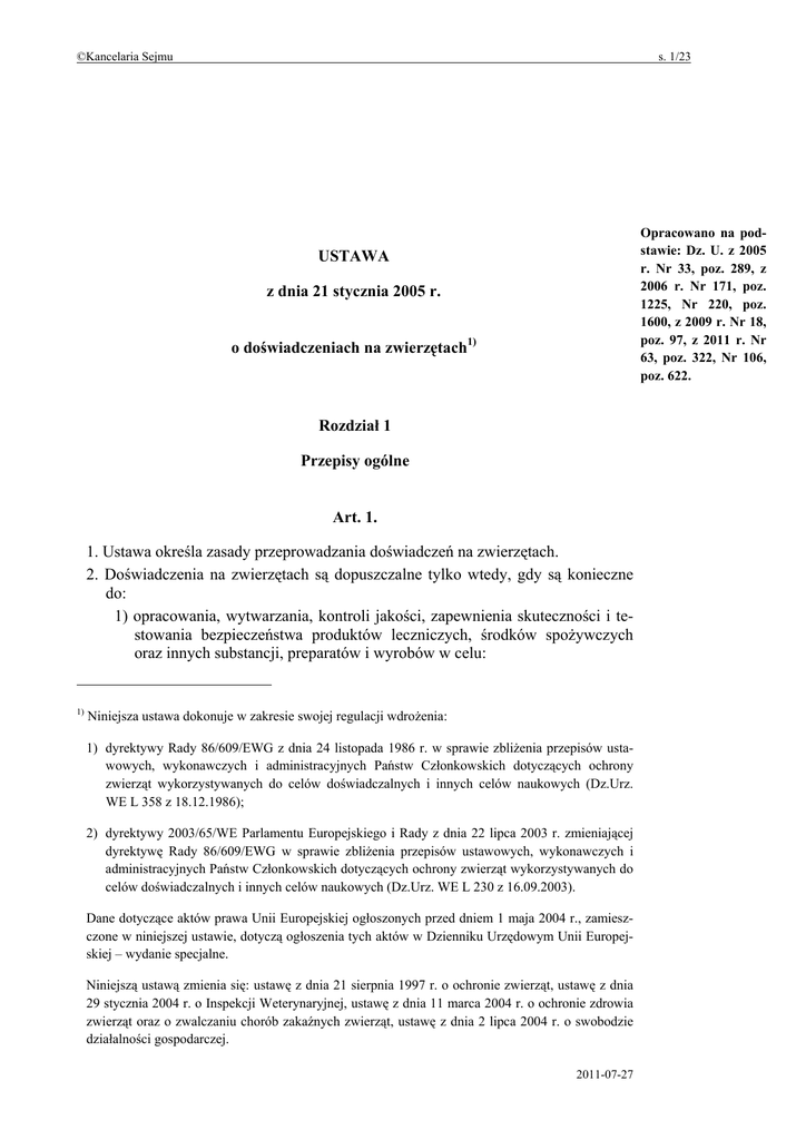 ©Kancelaria Sejmu s. 1/23 Opracowano na podstawie: Dz. U. z 2005 r. Nr 33, poz. 289, z 2006 r. Nr 171, poz. 1225, Nr 220, poz. 1600, z 2009 r. Nr 18, poz. 97, z 2011 r. Nr 63, poz. 322, Nr 106, poz. 622. USTAWA z dnia 21 stycznia 2005 r. o doświadczeniach na zwierzętach1) Rozdział 1 Przepisy ogólne Art. 1. 1. Ustawa określa zasady przeprowadzania doświadczeń na zwierzętach. 2. Doświadczenia na zwierzętach są dopuszczalne tylko wtedy, gdy są konieczne do: 1) opracowania, wytwarzania, kontroli jakości, zapewnienia skuteczności i testowania bezpieczeństwa produktów leczniczych, środków spożywczych oraz innych substancji, preparatów i wyrobów w celu: 1) Niniejsza ustawa dokonuje w zakresie swojej regulacji wdrożenia: 1) dyrektywy Rady 86/609/EWG z dnia 24 listopada 1986 r. w sprawie zbliżenia przepisów ustawowych, wykonawczych i administracyjnych Państw Członkowskich dotyczących ochrony zwierząt wykorzystywanych do celów doświadczalnych i innych celów naukowych (Dz.Urz. WE L 358 z 18.12.1986); 2) dyrektywy 2003/65/WE Parlamentu Europejskiego i Rady z dnia 22 lipca 2003 r. zmieniającej dyrektywę Rady 86/609/EWG w sprawie zbliżenia przepisów ustawowych, wykonawczych i administracyjnych Państw Członkowskich dotyczących ochrony zwierząt wykorzystywanych do celów doświadczalnych i innych celów naukowych (Dz.Urz. WE L 230 z 16.09.2003). Dane dotyczące aktów prawa Unii Europejskiej ogłoszonych przed dniem 1 maja 2004 r., zamieszczone w niniejszej ustawie, dotyczą ogłoszenia tych aktów w Dzienniku Urzędowym Unii Europejskiej – wydanie specjalne. Niniejszą ustawą zmienia się: ustawę z dnia 21 sierpnia 1997 r. o ochronie zwierząt, ustawę z dnia 29 stycznia 2004 r. o Inspekcji Weterynaryjnej, ustawę z dnia 11 marca 2004 r. o ochronie zdrowia zwierząt oraz o zwalczaniu chorób zakaźnych zwierząt, ustawę z dnia 2 lipca 2004 r. o swobodzie działalności gospodarczej. 2011-07-27 ©Kancelaria Sejmu s. 2/23 a) zapobiegania, rozpoznawania lub leczenia chorób, złego stanu zdrowia lub innego nieprawidłowego stanu, lub ustalenia szkodliwego wpływu tych produktów, środków oraz substancji, preparatów i wyrobów na człowieka, zwierzęta lub rośliny, b) oceny, wykrywania, regulacji lub zmiany stanu fizjologicznego człowieka, zwierząt lub roślin; 2) ochrony zdrowia człowieka lub zwierząt przed chorobami, 3) ochrony środowiska w celu ochrony gatunków, zdrowia człowieka lub dobrostanu zwierząt, 4) podstawowych badań naukowych, 5) dydaktyki w szkołach wyższych – jeżeli celów tych nie można osiągnąć bez użycia zwierząt. 3. Przepisów ustawy nie stosuje się do niedoświadczalnych czynności wykonywanych w chowie lub hodowli zwierząt oraz do zabiegów lekarskoweterynaryjnych, a także do chwytania zwierząt dzikich w celu wykonania pomiarów biometrycznych oraz określenia przynależności systematycznej. Art. 2. Użyte w ustawie określenia oznaczają: 1) zwierzęta – zwierzęta kręgowe, w tym także dzikie (wolno żyjące) lub zdolne do rozmnażania się formy larwalne, z wyłączeniem form płodowych i embrionalnych; 2) zwierzęta doświadczalne – zwierzęta przeznaczone do wykorzystania lub wykorzystywane do doświadczeń; 3) zwierzęta laboratoryjne – zwierzęta doświadczalne hodowane w obiektach jednostek hodowlanych lub doświadczalnych, w szczególności: myszy, szczury, świnki morskie, chomiki złote, króliki, psy, koty, przepiórki oraz zwierzęta naczelne; 4) zwierzęta dzikie (wolno żyjące) – zwierzęta nieudomowione, żyjące w warunkach niezależnych od człowieka; 5) zwierzęta bezdomne – zwierzęta domowe lub gospodarskie, które uciekły, zabłąkały się lub zostały porzucone przez człowieka, i co do których nie ma możliwości ustalenia ich właściciela lub innej osoby, pod której opieką trwale dotąd pozostawały; 6) doświadczenie – każdą formę wykorzystania zwierzęcia do badań naukowych, testów i celów dydaktycznych, mogącą wywołać u niego ból, cierpienie, strach lub trwałe uszkodzenie w jego organizmie, w tym działania mające na celu lub mogące spowodować urodzenie się zwierzęcia cierpiącego na którykolwiek z tych stanów, także wtedy gdy wyeliminowano ból, cierpienie, strach lub skutki trwałego uszkodzenia przez skuteczne użycie odpowiedniego znieczulenia lub innych środków, z wyłączeniem metod najmniej bolesnego znakowania zwierząt; doświadczeniem jest również uśmiercenie zwierzęcia do badań naukowych, testów i celów dydaktycznych; 2011-07-27 ©Kancelaria Sejmu s. 3/23 7) metody alternatywne – metody badawcze lub dydaktyczne, które umożliwiają wyeliminowanie użycia żywych zwierząt, zmniejszenie ich liczby lub złagodzenie doświadczenia; 8) obiekt – każde miejsce lub pomieszczenie, w którym utrzymywane są zwierzęta doświadczalne; 9) jednostka hodowlana – osobę fizyczną, osobę prawną lub jednostkę organizacyjną nieposiadającą osobowości prawnej, uprawnioną do hodowli zwierząt laboratoryjnych; 10) jednostka doświadczalna – osobę prawną lub jednostkę organizacyjną nieposiadającą osobowości prawnej, uprawnioną do przeprowadzania doświadczeń; 11) dostawca – osobę fizyczną, osobę prawną lub jednostkę organizacyjną nieposiadającą osobowości prawnej, uprawnioną do dostarczania zwierząt doświadczalnych, inną niż jednostka hodowlana; 12) uśmiercenie zwierzęcia w sposób humanitarny – zabicie zwierzęcia przy zadaniu mu jak najmniejszych cierpień fizycznych i psychicznych, uwzględniając specyfikę danego gatunku; 13) odpowiednie znieczulenie – znieczulenie miejscowe lub ogólne mające na celu pozbawienie zwierzęcia czucia technikami anestezjologicznymi, równie skutecznymi jak metody stosowane w dobrej praktyce weterynaryjnej. Rozdział 2 Zasady wykorzystywania zwierząt do doświadczeń Art. 3. 1. W celu wyeliminowania zbędnego powtarzania doświadczeń przed przeprowadzeniem doświ