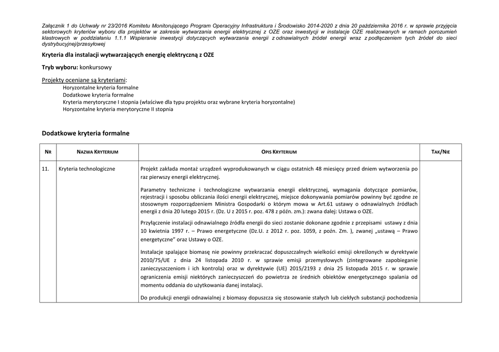 Załącznik 1 do Uchwały nr 23/2016 Komitetu Monitorującego Program Operacyjny Infrastruktura i Środowisko 2014-2020 z dnia 20 października 2016 r. w sprawie przyjęcia sektorowych kryteriów wyboru dla projektów w zakresie wytwarzania energii elektrycznej z OZE oraz inwestycji w instalacje OZE realizowanych w ramach porozumień klastrowych w poddziałaniu 1.1.1 Wspieranie inwestycji dotyczących wytwarzania energii z odnawialnych źródeł energii wraz z podłączeniem tych źródeł do sieci dystrybucyjnej/przesyłowej Kryteria dla instalacji wytwarzających energię elektryczną z OZE Tryb wyboru: konkursowy Projekty oceniane są kryteriami: Horyzontalne kryteria formalne Dodatkowe kryteria formalne Kryteria merytoryczne I stopnia (właściwe dla typu projektu oraz wybrane kryteria horyzontalne) Horyzontalne kryteria merytoryczne II stopnia Dodatkowe kryteria formalne NR 11. NAZWA KRYTERIUM Kryteria technologiczne OPIS KRYTERIUM Projekt zakłada montaż urządzeń wyprodukowanych w ciągu ostatnich 48 miesięcy przed dniem wytworzenia po raz pierwszy energii elektrycznej. Parametry techniczne i technologiczne wytwarzania energii elektrycznej, wymagania dotyczące pomiarów, rejestracji i sposobu obliczania ilości energii elektrycznej, miejsce dokonywania pomiarów powinny być zgodne ze stosownym rozporządzeniem Ministra Gospodarki o którym mowa w Art.61 ustawy o odnawialnych źródłach energii z dnia 20 lutego 2015 r. (Dz. U z 2015 r. poz. 478 z późn. zm.): zwana dalej: Ustawa o OZE. Przyłączenie instalacji odnawialnego źródła energii do sieci zostanie dokonane zgodnie z przepisami ustawy z dnia 10 kwietnia 1997 r. – Prawo energetyczne (Dz.U. z 2012 r. poz. 1059, z poźn. Zm. ), zwanej „ustawą – Prawo energetyczne” oraz Ustawy o OZE. Instalacje spalające biomasę nie powinny przekraczać dopuszczalnych wielkości emisji określonych w dyrektywie 2010/75/UE z dnia 24 listopada 2010 r. w sprawie emisji przemysłowych (zintegrowane zapobieganie zanieczyszczeniom i ich kontrola) oraz w dyrektywie (UE) 2015/2193 z dnia 25 listopada 2015 r. w sprawie ograniczenia emisji niektórych zanieczyszczeń do powietrza ze średnich obiektów energetycznego spalania od momentu oddania do użytkowania danej instalacji. Do produkcji energii odnawialnej z biomasy dopuszcza się stosowanie stałych lub ciekłych substancji pochodzenia TAK/NIE roślinnego, lub zwierzęcego, które ulegają biodegradacji, pochodzące z produktów, odpadów i pozostałości z produkcji rolnej i leśnej oraz przemysłu przetwarzającego ich produkty określonych w art. 7 rozporządzenia Komisji (WE) nr 1272/200916i ziarna zbóż, które nie podlegają zakupowi interwencyjnemu, a także ulegająca biodegradacji część odpadów przemysłowych i komunalnych, pochodzenia roślinnego lub zwierzęcego, w tym odpadów z instalacji do przetwarzania odpadów oraz odpadów z uzdatniania wody i oczyszczania ścieków, w szczególności osadów ściekowych, zgodnie z przepisami o odpadach w zakresie kwalifikowania części energii odzyskanej z termicznego przekształcania odpadów; do dofinansowania nie kwalifikują się instalacje spalania węgla, ani do współspalania biomasy z węglem zarówno w instalacjach wielopaliwowego spalania jak i dedykowanych instalacji spalania wielopaliwowego o łącznej mocy zainstalowanej elektrycznej większej niż 50 MW lub mocy osiąganej cieplnej większej niż 150 MWt. Projekty wykorzystujące OZE w zakresie wysokosprawnej kogeneracji w rozumieniu art. 52a ust. 1 pkt 1 Ustawy Prawo energetyczne wspierane są wyłącznie w ramach działania 1.6 POIiŚ. 12. Minimalny wymagany poziom przygotowania inwestycji tj. umożliwiający rankingowanie Wykonanie Studium wykonalności (SW) zgodnie z wymaganiami zawartymi w regulaminie. 13. Wymogi związane z ochrona środowiska W ramach kryterium ocenie podlega wpływ projektu na obszary Natura 2000 oraz szlaki migracyjne zwierząt. Kryterium ma zagwarantować, że realizowane będą przyjazne dla środowiska projekty, których realizacja nie wpływa negatywnie na obszary Natura 2000 i szlaki migracyjne zwierząt. Należy przedstawić odpowiednie zaświadczenie z RDOŚ. Źródła oparte o energię wody kwalifikują się do wsparcia, jeśli są usytuowane wyłącznie na fizycznie istniejących budowlach piętrzących lub wyposażonych w hydroelektrownie, przy jednoczesnym zapewnieniu pełnej drożności budowli dla przemieszczeń fauny wodnej. W odniesieniu do projektów wykorzystujących energię wody, współfinansowane będą mogły być tylko projekty wskazane w załącznikach do Master Planów dla obszarów dorzeczy Odry i Wisły, które nie wpływają negatywnie na osiągnięcie dobrego stanu wód lub nie pogarszają stanu wód. Współfinansowanie projektów, wskazanych w załącznikach do Master Planów, jako mogące spowodować nieosiągnięcie dobrego stanu wód lub pogorszenie stanu/potencjału jednolitych części wód, nie będzie dozwolone do czasu przedstawienia wystarczających dowodów na spełnienie warunków określonych w art. 4.7 Ramowej Dyrektywy Wodnej w aktualizacji Planów Gospodarowania Wodami na Obszarach Dorzeczy. Wypełnienie warunku będzie uzależnione od potwierdzenia przez Komisję Europejską zgodności przygotowanych aktualizacji Planów Gospodarowania Wodami w Dorzeczach z wymogami Ramowej Dyrektywy Wodnej. Projekty biomasowe powinny być zgodne z właściwym dla miejsca realizacji projektu programem ochrony powietrza, o ile istnieje taki program, na terenie którego realizowany jest projekt. Za zgodność z ww. programem uznaje się wskazanie danego rodzaju projektów w ramach rozwiązań mających na celu zmniejszenie zanieczyszczenia powietrza. NAZWA KRYTERIUM OPIS KRYTERIUM ZASADY OCENY KRYTERIUM WAGA Kryteria merytoryczne I stopnia Liczba punktów przyznawana za osiągnięte kolejne etapy przygotowania projektu (przyznane punkty w ramach kryterium sumują się – max. 6 pkt): 1 pkt – projekt 