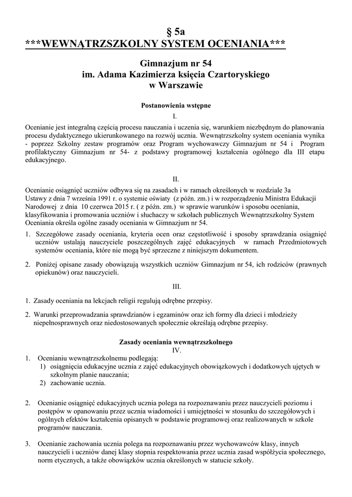 § 5a ***WEWNĄTRZSZKOLNY SYSTEM OCENIANIA*** Gimnazjum nr 54 im. Adama Kazimierza księcia Czartoryskiego w Warszawie Postanowienia wstępne I. Ocenianie jest integralną częścią procesu nauczania i uczenia się, warunkiem niezbędnym do planowania procesu dydaktycznego ukierunkowanego na rozwój ucznia. Wewnątrzszkolny system oceniania wynika - poprzez Szkolny zestaw programów oraz Program wychowawczy Gimnazjum nr 54 i Program profilaktyczny Gimnazjum nr 54- z podstawy programowej kształcenia ogólnego dla III etapu edukacyjnego. II. Ocenianie osiągnięć uczniów odbywa się na zasadach i w ramach określonych w rozdziale 3a Ustawy z dnia 7 września 1991 r. o systemie oświaty (z późn. zm.) i w rozporządzeniu Ministra Edukacji Narodowej z dnia 10 czerwca 2015 r. ( z późn. zm.) w sprawie warunków i sposobu oceniania, klasyfikowania i promowania uczniów i słuchaczy w szkołach publicznych Wewnątrzszkolny System Oceniania określa ogólne zasady oceniania w Gimnazjum nr 54. 1. Szczegółowe zasady oceniania, kryteria ocen oraz częstotliwość i sposoby sprawdzania osiągnięć uczniów ustalają nauczyciele poszczególnych zajęć edukacyjnych w ramach Przedmiotowych systemów oceniania, które nie mogą być sprzeczne z niniejszym dokumentem. 2. Poniżej opisane zasady obowiązują wszystkich uczniów Gimnazjum nr 54, ich rodziców (prawnych opiekunów) oraz nauczycieli. III. 1. Zasady oceniania na lekcjach religii regulują odrębne przepisy. 2. Warunki przeprowadzania sprawdzianów i egzaminów oraz ich formy dla dzieci i młodzieży niepełnosprawnych oraz niedostosowanych społecznie określają odrębne przepisy. 1. Zasady oceniania wewnątrzszkolnego IV. Ocenianiu wewnątrzszkolnemu podlegają: 1) osiągnięcia edukacyjne ucznia z zajęć edukacyjnych obowiązkowych i dodatkowych ujętych w szkolnym planie nauczania; 2) zachowanie ucznia. 2. Ocenianie osiągnięć edukacyjnych ucznia polega na rozpoznawaniu przez nauczycieli poziomu i postępów w opanowaniu przez ucznia wiadomości i umiejętności w stosunku do szczegółowych i ogólnych efektów kształcenia opisanych w podstawie programowej oraz realizowanych w szkole programów nauczania. 3. Ocenianie zachowania ucznia polega na rozpoznawaniu przez wychowawców klasy, innych nauczycieli i uczniów danej klasy stopnia respektowania przez ucznia zasad współżycia społecznego, norm etycznych, a także obowiązków ucznia określonych w statucie szkoły. V. Ocenianie wewnątrzszkolne ma na celu: informowanie ucznia o poziomie jego osiągnięć edukacyjnych i jego zachowaniu oraz o postępach w tym zakresie; 1a. udzielanie uczniowi pomocy w nauce poprzez przekazanie informacji o tym, co zrobił dobrze i jak powinien się dalej uczyć; 2. pomoc uczniowi w samodzielnym planowaniu swojego rozwoju poprzez udzielanie wskazówek; 3. motywowanie ucznia do dalszych postępów w nauce i zachowaniu; 4. dostarczanie rodzicom (prawnym opiekunom) i nauczycielom informacji o postępach; trudnościach w nauce, zachowaniu i specjalnych uzdolnieniach ucznia; 5. umożliwienie nauczycielom doskonalenia organizacji i metod pracy dydaktycznowychowawczej. 1. VI. Ocenianie wewnątrzszkolne obejmuje: 1) formułowanie przez nauczycieli wymagań edukacyjnych niezbędnych do uzyskania poszczególnych śródrocznych i rocznych ocen klasyfikacyjnych z obowiązkowych i dodatkowych zajęć edukacyjnych; 2) ustalanie kryteriów oceniania zachowania; 3) bieżące ocenianie i śródroczne klasyfikowanie z przedmiotów obowiązkowych i dodatkowych oraz ustalanie śródrocznej oceny zachowania, według skali i w formach przyjętych w niniejszym dokumencie; 4) przeprowadzanie egzaminów klasyfikacyjnych; 5) ustalanie ocen klasyfikacyjnych na koniec roku szkolnego z przedmiotów obowiązkowych i dodatkowych oraz ustalanie rocznej oceny klasyfikacyjnej zachowania, według skali i w formach przyjętych w niniejszym dokumencie; 6) ustalanie warunków i trybu uzyskania wyższych niż przewidywane rocznych ocen klasyfikacyjnych z przedmiotów obowiązkowych i dodatkowych oraz rocznej klasyfikacyjnej oceny zachowania; 7) ustalanie warunków i sposobu przekazywania rodzicom (prawnym opiekunom) informacji o postępach i trudnościach ucznia w nauce oraz o jego zachowaniu. Formułowanie wymagań edukacyjnych VII. 1. Na początku każdego roku szkolnego nauczyciele informują uczniów i rodziców (prawnych opiekunów) o wymaganiach edukacyjnych niezbędnych do uzyskania poszczególnych ocen klasyfikacyjnych z zajęć edukacyjnych, wynikających z realizowanego przez siebie programu nauczania obejmującego podstawę programową, sposobach sprawdzania osiągnięć uczniów oraz trybie i warunkach uzyskania wyższej niż przewidywana rocznej oceny klasyfikacyjnej. 2. Nauczyciel uczący danego przedmiotu przedstawia do wiadomości publicznej na stronie internetowej Gimnazjum nr 54 (www.gimnazjum54.waw.pl) przedmiotowy system oceniania. Zapisy przedmiotowego systemu oceniania nie mogą być sprzeczne z niniejszym dokumentem. 3. Wychowawcy klasy na początku każdego roku szkolnego informują uczniów oraz ich rodziców (prawnych opiekunów) o warunkach i sposobie oraz kryteriach oceniania zachowania, warunkach i trybie uzyskania wyższej niż przewidywana rocznej oceny klasyfikacyjnej z zachowania. 4. Wywiązanie się nauczyciela oraz wychowawcy z powyżej sformułowanych obowiązków udokumentowane jest poprzez zapis w dzienniku lekcyjnym. Dostosowanie wymagań do możliwości ucznia VIII. 1. Na podstawie opinii lub orzeczenia poradni psychologiczno – pedagogicznej lub poradni specjalistycznej, nauczyciel jest zobowiązany dostosować wymagania edukacyjne, o których mowa w § 7 ust.1, w stosunku do ucznia, u którego stwierdzono zaburzenia i odchylenia rozwojowe lub specyficzne trudności w uczeniu się uniemożliwiające sprostanie wymaganiom edukacyjnym wynikającym z programu nauczania. 2. Nauczyciel jest obowiązany indywidualizować pracę z uczniem na