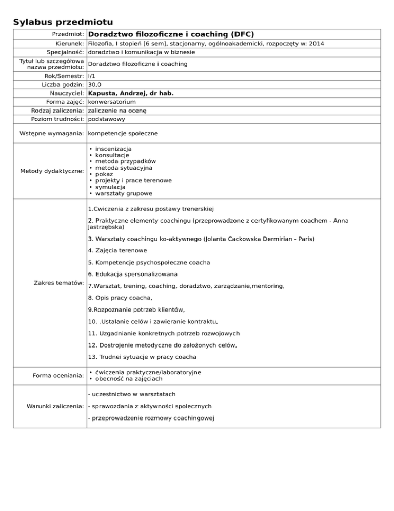Sylabus przedmiotu Przedmiot: Doradztwo filozoficzne i coaching (DFC) Kierunek: Filozofia, I stopień [6 sem], stacjonarny, ogólnoakademicki, rozpoczęty w: 2014 Specjalność: doradztwo i komunikacja w biznesie Tytuł lub szczegółowa Doradztwo filozoficzne i coaching nazwa przedmiotu: Rok/Semestr: I/1 Liczba godzin: 30,0 Nauczyciel: Kapusta, Andrzej, dr hab. Forma zajęć: konwersatorium Rodzaj zaliczenia: zaliczenie na ocenę Poziom trudności: podstawowy Wstępne wymagania: kompetencje społeczne • • • • Metody dydaktyczne: • • • • inscenizacja konsultacje metoda przypadków metoda sytuacyjna pokaz projekty i prace terenowe symulacja warsztaty grupowe 1.Cwiczenia z zakresu postawy trenerskiej 2. Praktyczne elementy coachingu (przeprowadzone z certyfikowanym coachem - Anna Jastrzębska) 3. Warsztaty coachingu ko-aktywnego (Jolanta Cackowska Dermirian - Paris) 4. Zajęcia terenowe 5. Kompetencje psychospołeczne coacha 6. Edukacja spersonalizowana Zakres tematów: 7.Warsztat, trening, coaching, doradztwo, zarządzanie,mentoring, 8. Opis pracy coacha, 9.Rozpoznanie potrzeb klientów, 10. .Ustalanie celów i zawieranie kontraktu, 11. Uzgadnianie konkretnych potrzeb rozwojowych 12. Dostrojenie metodyczne do założonych celów, 13. Trudnei sytuacje w pracy coacha Forma oceniania: • ćwiczenia praktyczne/laboratoryjne • obecność na zajęciach - uczestnictwo w warsztatach Warunki zaliczenia: - sprawozdania z aktywności spolecznych - przeprowadzenie rozmowy coachingowej Modułowe efekty kształcenia realizowane w ramach przedmiotu: 01 posiada wiedzę na temat podstawowych pojęć oraz nurtów i szkół doradztwa filozoficznego i coachingu 02 zna zasady rządzące praktyką doradczo-trenerską 03 posiada elementarną wiedzę dotyczącą procesów komunikowania interpersonalnego i społecznego, ich prawidłowości i zakłóceń 04 potrafi posługiwać się podstawowymi pojęciami doradztwa i coachingu 05 potrafi ocenić użyteczność rożnych podejść z zakresu doradztwa wobec określonych zjawisk i problemów 06 posiada umiejętność rozpoznawania społecznych i kulturowych uwarunkowań doradztwa i coachingu 07 ma świadomość etycznej i społecznej odpowiedzialności doradcy i trenera coachingu 08 ma świadomość konieczności ciągłego doskonalenia umiejętności i kompetencji trenerskich 09 jest otwarty na nową wiedzę dotyczącą koncepcji i teorii doradztwa i coachingu Literatura: 1. Peltier B. (2005) Psychologia coachingu kadry menedżerskiej. Teoria izastosowanie, Poznań, Rebis. 2. O’Neil M. B. (2005) Coaching dla kadry menedżerskiej. Siła i wrażliwość coacha w systemowym podejściu do problemów w zarządzaniu, Poznań, Rebis. Literatura: 3. Bennewicz M. (2008) Coaching czyli restauracja osobowości, Warszawa, GJ. 4. Thorpe S., Clifford J. (2004) Podręcznik coachingu, Poznań, Rebis. 5. Z. Nęcki, Komunikacja międzyludzka, Kraków, 2006. 6. J. Stewart, Mosty zamiast murów. Podręcznik komunikacji interpersonalnej, 7. T. Stoltzfus, Sztuka zadawania pytań w coachingu. Jak opanować najważniejszą umiejętność coacha? Tłum. B. Olechnowicz, Aetos, Wrocław 2012. PWN, Warszawa 2005 Dodatkowe informacje: Zajęcia prowadzone razem z dr Moniką Baczewską Informacje w sieci:https://www.facebook.com/SekcjaPraktykiFilozoficznej
