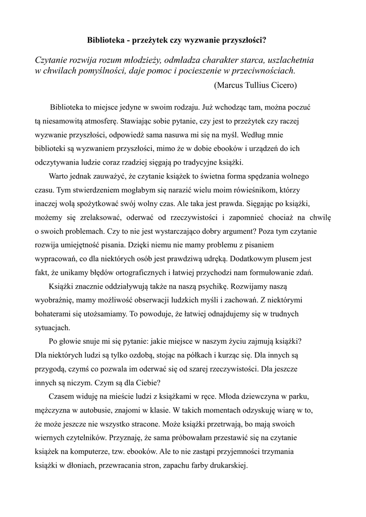 Biblioteka - przeżytek czy wyzwanie przyszłości? Czytanie rozwija rozum młodzieży, odmładza charakter starca, uszlachetnia w chwilach pomyślności, daje pomoc i pocieszenie w przeciwnościach. (Marcus Tullius Cicero) Biblioteka to miejsce jedyne w swoim rodzaju. Już wchodząc tam, można poczuć tą niesamowitą atmosferę. Stawiając sobie pytanie, czy jest to przeżytek czy raczej wyzwanie przyszłości, odpowiedź sama nasuwa mi się na myśl. Według mnie biblioteki są wyzwaniem przyszłości, mimo że w dobie ebooków i urządzeń do ich odczytywania ludzie coraz rzadziej sięgają po tradycyjne książki. Warto jednak zauważyć, że czytanie książek to świetna forma spędzania wolnego czasu. Tym stwierdzeniem mogłabym się narazić wielu moim rówieśnikom, którzy inaczej wolą spożytkować swój wolny czas. Ale taka jest prawda. Sięgając po książki, możemy się zrelaksować, oderwać od rzeczywistości i zapomnieć chociaż na chwilę o swoich problemach. Czy to nie jest wystarczająco dobry argument? Poza tym czytanie rozwija umiejętność pisania. Dzięki niemu nie mamy problemu z pisaniem wypracowań, co dla niektórych osób jest prawdziwą udręką. Dodatkowym plusem jest fakt, że unikamy błędów ortograficznych i łatwiej przychodzi nam formułowanie zdań. Książki znacznie oddziaływują także na naszą psychikę. Rozwijamy naszą wyobraźnię, mamy możliwość obserwacji ludzkich myśli i zachowań. Z niektórymi bohaterami się utożsamiamy. To powoduje, że łatwiej odnajdujemy się w trudnych sytuacjach. Po głowie snuje mi się pytanie: jakie miejsce w naszym życiu zajmują książki? Dla niektórych ludzi są tylko ozdobą, stojąc na półkach i kurząc się. Dla innych są przygodą, czymś co pozwala im oderwać się od szarej rzeczywistości. Dla jeszcze innych są niczym. Czym są dla Ciebie? Czasem widuję na mieście ludzi z książkami w ręce. Młoda dziewczyna w parku, mężczyzna w autobusie, znajomi w klasie. W takich momentach odzyskuję wiarę w to, że może jeszcze nie wszystko stracone. Może książki przetrwają, bo mają swoich wiernych czytelników. Przyznaję, że sama próbowałam przestawić się na czytanie książek na komputerze, tzw. ebooków. Ale to nie zastąpi przyjemności trzymania książki w dłoniach, przewracania stron, zapachu farby drukarskiej. Zastanawiam się, co by się stało, gdyby wszystkie biblioteki zamknięto. Fakt, są jeszcze księgarnie. Ale nie każdego stać na zakup każdej nowej książki, która pojawia się na rynku. Poza tym w księgarni nie znajdziemy unikatowych egzemplarzy sprzed kilku, a nawet kilkuset lat. Biblioteki są skarbnicami. Dla każdego: od kilkulatka, który dopiero uczy się czytać, przez studentów piszących prace magisterskie, po babcie i dziadków, którzy spędzają swój wolny czas czytając. Ja odziedziczyłam miłość do książek właśnie po mojej babci, która do tej pory, mając ponad 70 lat „pożera” książki, jak mawia moja mama. Jestem dumna z tego, że tak łatwo przychodzi mi czytanie. Jak już wspomniałam, biblioteki są wyzwaniem przyszłości, bo kto wie, jak długo będziemy mieć jeszcze możliwość korzystania z nich. Mam nadzieję, że mimo rozwoju technologii te wspaniałe miejsca pozostaną z nami jak najdłużej. Czytajmy. Bez względu na to jaki gatunek preferujemy, fantastykę, romanse, książki przygodowe, nieważne. Najważniejsze, abyśmy czerpali z tego przyjemność.