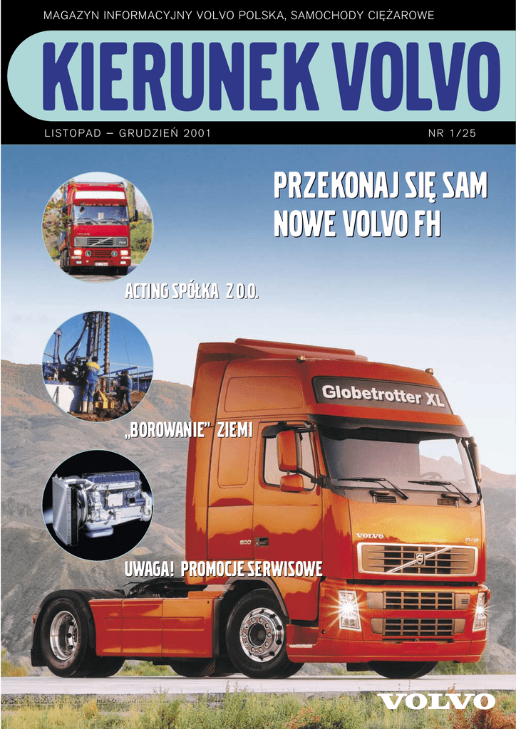 MAGAZYN INFORMACYJNY VOLVO POLSKA, SAMOCHODY CI¢˚AROWE KIERUNEK VOLVO LISTOPAD — GRUDZIE¡ 2001 NR 1/25 PRZEKONAJ SI¢ SAM NOWE VOLVO FH ACTING SPÓ¸KA Z O.O. „BOROWANIE” ZIEMI UWAGA! PROMOCJE SERWISOWE Szanowni Paƒstwo, Mam prawdziwà przyjemnoÊç zaprosiç Paƒstwa do lektury Magazynu „Kierunek Volvo”. Pragn´ poinformowaç, ˝e nasz Magazyn b´dzie si´ teraz ukazywa∏ co dwa miesiàce. Informacje w nim zawarte b´dà dotyczyç aktualnych wydarzeƒ w Volvo, nowych produktów i us∏ug, towarzyszàcych sprzeda˝y samochodów ci´˝arowych. B´dziemy prezentowaç Paƒstwu dealerów i serwisy Volvo Polska, Samochody Ci´˝arowe. To oni dzia∏ajà na Paƒstwa terenie i w razie potrzeby s∏u˝à pomocà i radà. W tym numerze Magazynu zaprezentujemy mi´dzy innymi nowy model ciàgnika siod∏owego Volvo FH12 z nowym, ekonomicznym silnikiem i inteligentnà skrzynià biegów! Zapoznamy Paƒstwa z wynikami sprzeda˝y samochodów ci´˝arowych w Polsce oraz Motolaboratorium Volvo. Tam w∏aÊnie bada si´, w jaki sposób ha∏as i wibracje wp∏ywajà na zachowania kierowcy i pojazdu. Grudzieƒ to miesiàc Âwiàt Bo˝ego Narodzenia oraz koniec roku. Mam nadziej´, ˝e nadchodzàcy rok b´dzie dla Paƒstwa udany oraz pe∏en radoÊci. ˚ycz´ Paƒstwu spokojnych i weso∏ych Âwiàt Bo˝ego Narodzenia oraz szerokiej drogi w Nowym 2002 Roku! Peter Andres Dyrektor Zarzàdzajàcy Volvo Polska Sp. z o.o. Samochody Ci´˝arowe KIERUNEK VOLVO MAGAZYN INFORMACYJNY VOLVO POLSKA, SAMOCHODY CI¢˚AROWE WYDAWCA: Volvo Polska, Samochody Ci´˝arowe S P I S T R E Piotr Wysocki redaktor naczelny; Maciej Trzebiatowski serwis; Bart∏omiej Górzyƒski marketing; Piotr ˚urawski sprzeda˝; Krzysztof Lipski redaktor; Beata Aniszewska Volvo Finance Poland. OPRACOWANIE GRAFICZNIE: Target Project ZDJ¢CIA: Studio 4na5 C I WST¢P AKTUALNOÂCI Z POLSKI I ZE ÂWIATA 2 4 NASI KLIENCI 8 PRZEKONAJ SI¢ SAM. NOWE VOLVO FH ACTING SPÓ¸KA Z O.O. REDAGUJE ZESPÓ¸:  NASZE SERWISY 12 CIEKAWE ZABUDOWY 14 MOTOLABORATORIUM 18 PROMOCJE SERWISOWE 20 VOLVO W MEDIACH 22 SAMOCHODY ÂREDNIE, DU˚E I ... „BOROWANIE” ZIEMI WIBRACJE I HA¸AS DOSTOSOWANIE SILNIKA D12A DO NORMY EURO 2 AKUMULATORY HDX II NOWEJ GENERACJI PREMIERA NOWEGO VOLVO FH12 4X2T CI¢˚KA WAGA ZE SZWECJI CI¢˚ARÓWKI JADÑ W DÓ¸ BIURO W KABINIE WYMARZONY PODNOÂNIK DOTAR¸ DO K¢PNA CI  O N L A U T IATA AK W  E Z I I Z POLSK PRZEKONAJ SI¢ SAM. NOWE VOLVO FH Nowe Volvo FH12 to samochód ci´˝arowy, który jako jedyny w historii plebiscytu zdoby∏ dwukrotnie europejskà nagrod´ „Truck of the Year” (w roku 1994 i 2000). Wraz z prezentacjà Volvo FH12, na rynek zostaje wprowadzony nowy silnik D12D, o mocy 500 KM z technologià turbo compound. Nowy, 12-litrowy silnik jest l˝ejszy od swoich poprzedników i charakteryzuje si´ jeszcze oszcz´dniejszym zu˝yciem paliwa. Silnik Volvo D12D 500TC jest przede wszystkim przeznaczony dla klientów realizujàcych ci´˝kie przewozy lub klientów ceniàcych wysokà pr´dkoÊç Êrednià. Inteligentna, automatyczna skrzynia biegów I-shift to nazwa nowej skrzyni Nowy silnik D12D 4 biegów, zaprojektowanej dla potrzeb dystrybucji i przewozów dalekobie˝nych przy masie zestawu do 44 ton. I-shift zwi´ksza komfort i bezpieczeƒstwo jazdy. Przyczynia si´ do zmniejszenia zu˝ycia paliwa cia paliwa. W modelu Volvo FH12 klient mo˝e dostosowaç uk∏ad podwozia do rodzaju przewozów. Ma on do dyspozycji kilka alternatywnych mo˝liwoÊci umieszczenia zbiornika paliwa i skrzyni akumulatorowej. No- Automatyczna skrzynia biegów I-shift Nowe podwozie FH12 i masy pojazdu, pozwala zmieniaç biegi szybko, mi´kko i p∏ynnie. Nowy ciàgnik siod∏owy Volvo FH12 zosta∏ wyposa˝ony w opatentowanà przez Volvo technologi´ hamulców tarczowych na wszystkich ko∏ach. Oprócz zwi´kszenia bezpieczeƒstwa jazdy, rozwiàzanie to – dzi´ki swojej ni˝szej masie – przyczynia si´ do zmniejszenia zu˝y- we zbiorniki paliwa w kszta∏cie litery D zapewniajà optymalnà iloÊç paliwa i optymalne wykorzystanie przestrzeni mi´dzy przednià i tylnà osià. Os∏ona przednia, zabezpieczajàca przed wjechaniem pod samochód ci´˝arowy (FUPS), stanowi wyposa˝enie standardowe i jest zintegrowana z konstrukcjà podwozia. Przy rosnàcych kosztach paliw, Volvo Trucks skoncentrowa∏o si´ na rozwoju tych elementów samochodu ci´˝arowego, które majà najwi´kszy wp∏yw na zu˝ycie paliwa – na uk∏adzie nap´do- 5 wym i na kabinie. Nowa seria samochodów FH12 oferuje kabin´ dostosowanà do potrzeb kierowcy. Jest to funkcjonalne miejsce pracy i odpoczynku. Klient mo˝e wybieraç mi´dzy wersjà z jednym lub z dwoma ∏ó˝kami. Nowym, atrakcyjnym rozwiàzaniem jest kabina o nazwie „Biuro-wypoczynek”. Nad ∏ó˝kiem i miejscem do pracy umieszczono jeszcze wi´kszà liczb´ praktycznych schowków. Kabina zyska∏a ca∏kowicie nowà tablic´ rozdzielczà, z umieszczonym poÊrodku wyÊwietlaczem kierowcy oraz kierownic´ ze zintegrowanymi regulatorami i wbudowanym telefonem. Elektroniczny uk∏ad stabilizacji (ESP) Volvo jest pierwszym w swoim rodzaju rozwiàzaniem, wprowadzonym na rynek samochodów ci´˝arowych. Uk∏ad ten pomaga kierowcy zachowaç kontrol´ nad pojazdem, na przyk∏ad w czasie jazdy po z∏ej na- Wn´trze kabiny FH12 WyÊwietlacz kierowcy wierzchni, przy przechyle bocznym lub podczas gwa∏townego hamowania. Przedzia∏ sypialny w nowym Volvo FH12 4x2 T zosta∏ wyposa˝ony w szersze i jeszcze wygodniejsze ∏ó˝ka, które kilkoma ruchami mo˝na z∏o˝yç na Êcianie kabiny. W nast´pnym numerze magazynu przedstawimy Paƒstwu pe∏nà gam´ naszych produktów Volvo FH/FM. Bli˝sze informacje — na stronie www. volvopolska. pl Piotr Wysocki Wn´trze kabiny „Biuro-wypoczynek” 6 ZNACZÑCE DATY 4 paêdziernika 2001 – Volvo Trucks otrzymuje z Iranu zamówienie na kolejne 600 samochodów ci´˝arowych FH12. Zamówienie pierwszej partii samochodów FH, Volvo Trucks otrzyma∏o w maju tego r