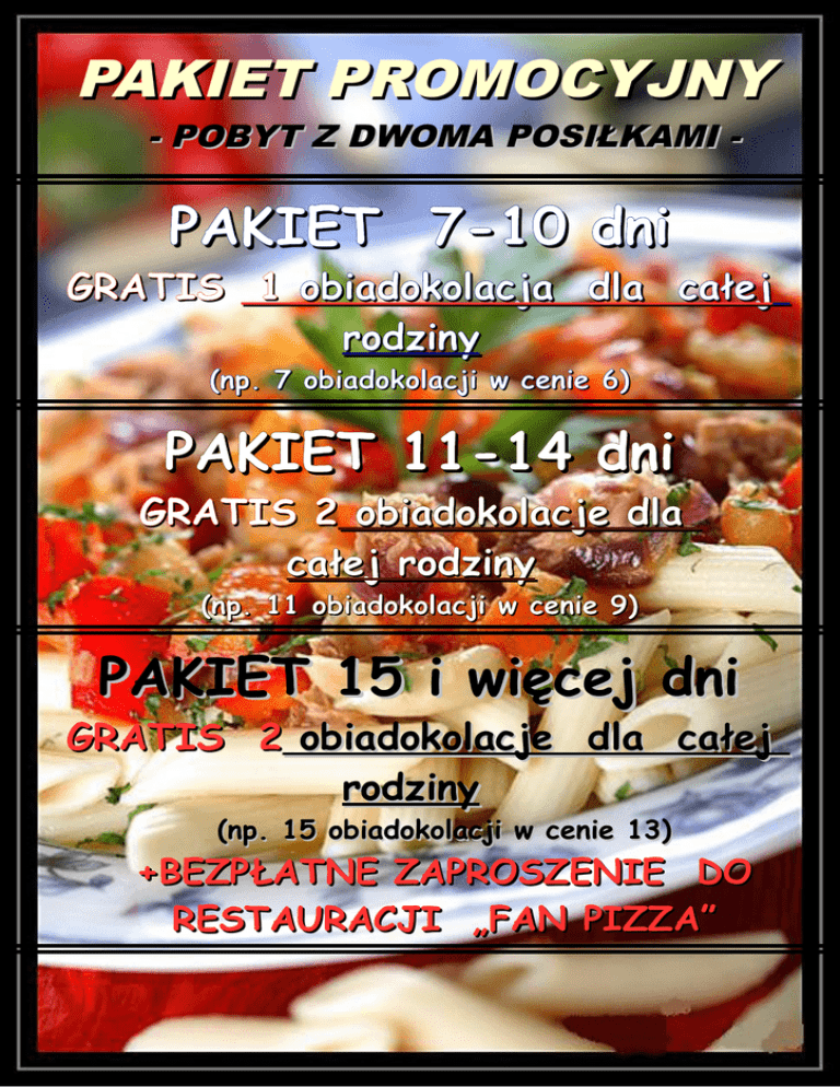PAKIET PROMOCYJNY - POBYT Z DWOMA POSIŁKAMI - PAKIET 7-10 dni GRATIS 1 obiadokolacja dla całej rodziny (np. 7 obiadokolacji w cenie 6) PAKIET 11-14 dni GRATIS 2 obiadokolacje dla całej rodziny (np. 11 obiadokolacji w cenie 9) PAKIET 15 i więcej dni GRATIS 2 obiadokolacje dla całej rodziny (np. 15 obiadokolacji w cenie 13) +BEZPŁATNE ZAPROSZENIE DO RESTAURACJI „FAN PIZZA”