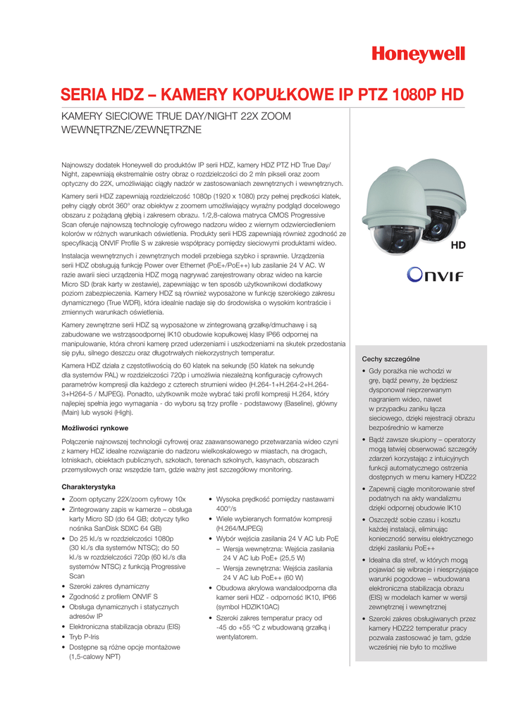 SERIA HDZ – KAMERY KOPUŁKOWE IP PTZ 1080P HD KAMERY SIECIOWE TRUE DAY/NIGHT 22X ZOOM WEWNĘTRZNE/ZEWNĘTRZNE Najnowszy dodatek Honeywell do produktów IP serii HDZ, kamery HDZ PTZ HD True Day/ Night, zapewniają ekstremalnie ostry obraz o rozdzielczości do 2 mln pikseli oraz zoom optyczny do 22X, umożliwiając ciągły nadzór w zastosowaniach zewnętrznych i wewnętrznych. Kamery serii HDZ zapewniają rozdzielczość 1080p (1920 x 1080) przy pełnej prędkości klatek, pełny ciągły obrót 360° oraz obiektyw z zoomem umożliwiający wyraźny podgląd docelowego obszaru z pożądaną głębią i zakresem obrazu. 1/2,8-calowa matryca CMOS Progressive Scan oferuje najnowszą technologię cyfrowego nadzoru wideo z wiernym odzwierciedleniem kolorów w różnych warunkach oświetlenia. Produkty serii HDS zapewniają również zgodność ze specyfikacją ONVIF Profile S w zakresie współpracy pomiędzy sieciowymi produktami wideo. Instalacja wewnętrznych i zewnętrznych modeli przebiega szybko i sprawnie. Urządzenia serii HDZ obsługują funkcję Power over Ethernet (PoE+/PoE++) lub zasilanie 24 V AC. W razie awarii sieci urządzenia HDZ mogą nagrywać zarejestrowany obraz wideo na karcie Micro SD (brak karty w zestawie), zapewniając w ten sposób użytkownikowi dodatkowy poziom zabezpieczenia. Kamery HDZ są również wyposażone w funkcję szerokiego zakresu dynamicznego (True WDR), która idealnie nadaje się do środowiska o wysokim kontraście i zmiennych warunkach oświetlenia. Kamery zewnętrzne serii HDZ są wyposażone w zintegrowaną grzałkę/dmuchawę i są zabudowane we wstrząsoodpornej IK10 obudowie kopułkowej klasy IP66 odpornej na manipulowanie, która chroni kamerę przed uderzeniami i uszkodzeniami na skutek przedostania się pyłu, silnego deszczu oraz długotrwałych niekorzystnych temperatur. Kamera HDZ działa z częstotliwością do 60 klatek na sekundę (50 klatek na sekundę dla systemów PAL) w rozdzielczości 720p i umożliwia niezależną konfigurację cyfrowych parametrów kompresji dla każdego z czterech strumieni wideo (H.264-1+H.264-2+H.2643+H264-5 / MJPEG). Ponadto, użytkownik może wybrać taki profil kompresji H.264, który najlepiej spełnia jego wymagania - do wyboru są trzy profile - podstawowy (Baseline), główny (Main) lub wysoki (High). Możliwości rynkowe Cechy szczególne • Gdy porażka nie wchodzi w grę, bądź pewny, że będziesz dysponował nieprzerwanym nagraniem wideo, nawet w przypadku zaniku łącza sieciowego, dzięki rejestracji obrazu bezpośrednio w kamerze Połączenie najnowszej technologii cyfrowej oraz zaawansowanego przetwarzania wideo czyni z kamery HDZ idealne rozwiązanie do nadzoru wielkoskalowego w miastach, na drogach, lotniskach, obiektach publicznych, szkołach, terenach szkolnych, kasynach, obszarach przemysłowych oraz wszędzie tam, gdzie ważny jest szczegółowy monitoring. • Bądź zawsze skupiony – operatorzy mogą łatwiej obserwować szczegóły zdarzeń korzystając z intuicyjnych funkcji automatycznego ostrzenia dostępnych w menu kamery HDZ22 Charakterystyka • Zapewnij ciągłe monitorowanie stref podatnych na akty wandalizmu dzięki odpornej obudowie IK10 •Zoom optyczny 22X/zoom cyfrowy 10x •Zintegrowany zapis w kamerze – obsługa karty Micro SD (do 64 GB; dotyczy tylko nośnika SanDisk SDXC 64 GB) •Do 25 kl./s w rozdzielczości 1080p (30 kl./s dla systemów NTSC); do 50 kl./s w rozdzielczości 720p (60 kl./s dla systemów NTSC) z funkcją Progressive Scan • Szeroki zakres dynamiczny • Zgodność z profilem ONVIF S • Obsługa dynamicznych i statycznych adresów IP • Elektroniczna stabilizacja obrazu (EIS) • Tryb P-Iris •Dostępne są różne opcje montażowe (1,5-calowy NPT) • Wysoka prędkość pomiędzy nastawami 400°/s •Wiele wybieranych formatów kompresji (H.264/MJPEG) •Wybór wejścia zasilania 24 V AC lub PoE – Wersja wewnętrzna: Wejścia zasilania 24 V AC lub PoE+ (25,5 W) – Wersja zewnętrzna: Wejścia zasilania 24 V AC lub PoE++ (60 W) • Obudowa akrylowa wandaloodporna dla kamer serii HDZ - odporność IK10, IP66 (symbol HDZIK10AC) • Szeroki zakres temperatur pracy od -45 do +55 oC z wbudowaną grzałką i wentylatorem. • Oszczędź sobie czasu i kosztu każdej instalacji, eliminując konieczność serwisu elektrycznego dzięki zasilaniu PoE++ • Idealna dla stref, w których mogą pojawiać się wibracje i niesprzyjające warunki pogodowe – wbudowana elektroniczna stabilizacja obrazu (EIS) w modelach kamer w wersji zewnętrznej i wewnętrznej • Szeroki zakres obsługiwanych przez kamery HDZ22 temperatur pracy pozwala zastosować je tam, gdzie wcześniej nie było to możliwe SERIA HDZ – KAMERY KOPUŁKOWE IP PTZ 1080P HD SCHEMAT I WYMIARY SYSTEMU Schemat systemu Monitor Hybrid DVR NETWORK Monitor NVR Monitor Keyboard HDZ Series 61,0 mm Wymiary 107,5 mm 25,3 mm 25,3 mm 192,0 mm 194,0 mm 192,0 mm Zewnętrzna podwieszana Wewnętrzna podwieszana 190,0 mm 123,0 mm 136,0 mm 155,9 mm 239,0 mm 254,0 mm W przypadku użycia wspornika sufitowego 235,0 mm 281,4 mm 276,2 mm 103,4 mm 110,1 mm 22,5 mm SERIA HDZ – KAMERY KOPUŁKOWE IP PTZ 1080P HD SPECYFIKACJE Wewnętrzna kamera HDZ Zewnętrzna kamera HDZ 24 V AC ± 10% i PoE+ (IEEE 802.3at-2009) 24 V AC ± 10% i PoE++ 25,5 W 59 W (z grzałką) Wymiary ø192 x 281,4 mm ø194 x 276,2 mm (z osłoną przeciwsłoneczną) Waga 2,2 kg ze wspornikiem sufitowym 3,1 kg 2,6 kg (z osłoną przeciwsłoneczną) od 0°C do 50°C od -45°C do 55°C** Kamera System skanowania NTSC/PAL Przetwornik obrazu 1/2,8-calowy Sony Progressive CMOS Zoom optyczny 22x Zoom cyfrowy 10x Liczba pikseli (poziomo x pionowo) 1920 x 1080 (1080p) Szeroki zakres dynamiczny migawki Stosunek sygnał/szum Minimalne oświetlenie Ogniskowa Tryb ogniskowej Balans bieli Sterowanie przesłoną Elektroniczna migawka AGC Kompensacja podświetlenia Wł./wył. (> 96 dB) > 50 dB (AGC wył.) 0,5 lx (kolor)/0,1 lx (czarno-biały) przy F1.6 od 4,3 