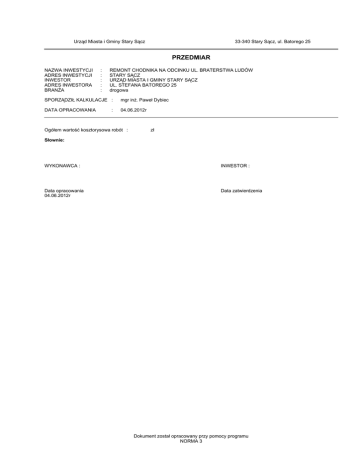 Urząd Miasta i Gminy Stary Sącz 33-340 Stary Sącz, ul. Batorego 25 PRZEDMIAR NAZWA INWESTYCJI ADRES INWESTYCJI INWESTOR ADRES INWESTORA BRANśA : : : : : REMONT CHODNIKA NA ODCINKU UL. BRATERSTWA LUDÓW STARY SĄCZ URZĄD MIASTA I GMINY STARY SĄCZ UL. STEFANA BATOREGO 25 drogowa SPORZĄDZIŁ KALKULACJE : mgr inŜ. Paweł Dybiec DATA OPRACOWANIA 04.06.2012r : Ogółem wartość kosztorysowa robót : zł Słownie: WYKONAWCA : INWESTOR : Data opracowania 04.06.2012r Data zatwierdzenia Dokument został opracowany przy pomocy programu NORMA 3 chodnik brat lud KSIĄśKA PRZEDMIARÓW Lp. Podst Opis i wyliczenia 1 ROBOTY ROZBIÓRKOWE I ZIEMNE 1 KNNR 6 Rozebranie krawęŜników betonowych na podsypce cementowo-piaskowej wraz d.1 0806-02 ze ściekiem przykrawęŜnikowym- z wywozem na odl. 1 km 156+105+28 2 KNNR 6 d.1 0805-06 3 KNNR 1 d.1 0202-06 4 KNNR 1 d.1 0208-02 j.m. m 7 KNR 2-31 d.2 0403-03 8 KNR 2-31 d.2 0608-07 3 CHODNIK 9 KNNR 6 d.3 0112-02 10 KNNR 6 d.3 0112-05 11 KNNR 6 d.3 0502-01 12 KNNR 6 d.3 0404-02 13 KNR 2-31 d.3 1406-02 14 KNR 2-31 d.3 1406-05 m3 Dodatek za kaŜdy rozp. 1 km transportu ziemi samochodami samowyładowczymi m3 po drogach o nawierzchni utwardzonej(kat.gr. I-IV) Krotność = 3 578*0.35 m3 Ława pod krawęŜniki betonowa z oporem - beton B25 m3 289*0.12 m3 KrawęŜniki betonowe wystające o wym. 15x30 cm na podsypce cem.piaskowej m 289 m Ścieki uliczne z kostki kamiennej rzędowej o wys. 16 cm na podsypce cem.pias- m kowej - 2 rzędy- analogia ściek przykrawęŜnikowy szer. 0,20 m z kostki betonowej gr 8 cm 289 m Warstwa dolna podbudowy z kruszyw naturalnych gr. 25 cm m2 289*2.0 m2 Warstwa górna podbudowy z kruszyw naturalnych gr. 10 cm m2 289*2.0 m2 Chodniki z kostki brukowej betonowej grubości 6 cm na podsypce piaskowej z wy-m2 pełnieniem spoin piaskiem - kostka typu Stare Miasto, Bulwar kolor beŜ lub równowaŜna 289*2.0 m2 ObrzeŜa betonowe o wymiarach 20x6 cm na podsypce piaskowej, spoiny wypeł- m nione piaskiem 10 m Regulacja pionowa studzienek dla kratek ściekowych ulicznych szt. 5 szt. Regulacja pionowa studzienek dla studzienek telefonicznych szt. 2 szt. 4 CHODNIK STRONA PRAWA 15 KNNR 6 Rozebranie krawęŜników betonowych na podsypce cementowo-piaskowej wraz d.4 0806-02 ze ściekiem przykrawęŜnikowym- z wywozem na odl. 1 km 266 16 KNNR 6 d.4 0803-04 17 KNNR 1 d.4 0202-06 -2- Norma 3.14 Licencja: 11395 dla Urząd Miasta i Gminy Stary Sącz 289.000 578.000 RAZEM 578.000 202.300 RAZEM 202.300 202.300 RAZEM 202.300 289.000 RAZEM 289.000 34.680 RAZEM 34.680 289.000 RAZEM 289.000 289.000 RAZEM 289.000 578.000 RAZEM 578.000 578.000 RAZEM 578.000 578.000 RAZEM 578.000 10.000 RAZEM 10.000 5.000 RAZEM 5.000 2.000 RAZEM 2.000 266.000 RAZEM 266.000 44.100 RAZEM 44.100 73.255 RAZEM 73.255 m m Mechaniczne rozebranie nawierzchni z kostki kamiennej regularnej na podsypce m2 cementowo-piaskowej- rozebranie nawierzchni z kostki na wjazdach 44.1 m2 Roboty ziemne wykonywane koparkami podsiębiernymi o poj.łyŜki 0.40 m3 w gr.kat. III-IV z transp.urobku na odl.do 1 km sam.samowyład. 209.3*0.35 289.000 RAZEM m3 2 KRAWĘśNIK 5 KNR 2-31 Rowki pod krawęŜniki i ławy krawęŜnikowe o wym. 30x40 cm w gruncie kat.III-IV m d.2 0401-06 289 m 6 KNR 2-31 d.2 0402-04 Razem m Rozebranie chodników z płyt betonowych o wymiarach 50x50x7 cm na podsypce m2 piaskowej - płyty ułoŜyć na paletach i przetransportować na od. 1km 289*2.0 m2 Roboty ziemne wykonywane koparkami podsiębiernymi o poj.łyŜki 0.40 m3 w gr.kat. III-IV z transp.urobku na odl.do 1 km sam.samowyład. 578*0.35 Poszcz m3 m3 chodnik brat lud Lp. Podst 18 KNNR 1 d.4 0208-02 19 KNR 2-31 d.4 0401-06 20 KNR 2-31 d.4 0402-04 21 KNR 2-31 d.4 0403-03 22 KNR 2-31 d.4 0608-07 23 KNNR 6 d.4 0112-02 24 KNNR 6 d.4 0112-05 25 KNNR 6 d.4 0502-01 26 KNNR 6 d.4 0404-02 27 KNR 2-31 d.4 1406-02 28 KNR 2-31 d.4 1406-05 KSIĄśKA PRZEDMIARÓW Opis i wyliczenia j.m. Dodatek za kaŜdy rozp. 1 km transportu ziemi samochodami samowyładowczymi m3 po drogach o nawierzchni utwardzonej(kat.gr. I-IV) Krotność = 3 209.3*0.35 m3 Poszcz Razem 73.255 RAZEM 73.255 266.000 RAZEM 266.000 31.920 RAZEM 31.920 266.000 RAZEM 266.000 266.000 RAZEM 266.000 209.300 RAZEM 209.300 209.300 RAZEM 209.300 209.300 RAZEM 209.300 6.000 RAZEM 6.000 6.000 RAZEM 6.000 1.000 RAZEM 1.000 Rowki pod krawęŜniki i ławy krawęŜnikowe o wym. 30x40 cm w gruncie kat.III-IV m 266 m Ława pod krawęŜniki betonowa z oporem - beton B25 m3 266*0.12 m3 KrawęŜniki betonowe wystające o wym. 15x30 cm na podsypce cem.piaskowej m 266 m Ścieki uliczne z kostki kamiennej rzędowej o wys. 16 cm na podsypce cem.pias- m kowej - 2 rzędy- analogia ściek przykrawęŜnikowy szer. 0,20 m z kostki betonowej gr 8 cm 266 m Warstwa dolna podbudowy z kruszyw naturalnych gr. 25 cm m2 77*1.0+189*0.7 m2 Warstwa górna podbudowy z kruszyw naturalnych gr. 10 cm m2 77*1.0+189*0.7 m2 Chodniki z kostki brukowej betonowej grubości 6 cm na podsypce piaskowej z wy-m2 pełnieniem spoin piaskiem - kostka typu Stare Miasto, Bulwar lub równowaŜna kolor beŜ 77*1.0+189*0.7 m2 ObrzeŜa betonowe o wymiarach 20x6 cm na podsypce piaskowej, spoiny wypeł- m nione piaskiem 6 m Regulacja pionowa studzienek dla kratek ściekowych ulicznych szt. 6 szt. Regulacja pionowa studzienek dla studzienek telefonicznych szt. 1 szt. -3- Norma 3.14 Licencja: 11395 dla Urząd Miasta i Gminy Stary Sącz