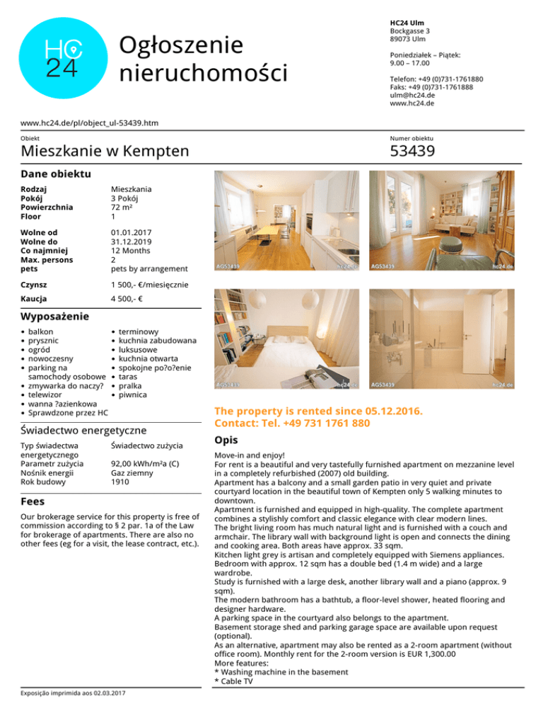 Ogłoszenie nieruchomości HC24 Ulm Bockgasse 3 89073 Ulm Poniedziałek – Piątek: 9.00 – 17.00 Telefon: +49 (0)731-1761880 Faks: +49 (0)731-1761888 [email protected] www.hc24.de www.hc24.de/pl/object_ul-53439.htm Obiekt Numer obiektu Mieszkanie w Kempten 53439 Dane obiektu Rodzaj Pokój Powierzchnia Floor Mieszkania 3 Pokój 72 m² 1 Wolne od Wolne do Co najmniej Max. persons pets 01.01.2017 31.12.2019 12 Months 2 pets by arrangement Czynsz 1 500,- €/miesięcznie Kaucja 4 500,- € Wyposażenie balkon prysznic ogród nowoczesny parking na samochody osobowe zmywarka do naczy? telewizor wanna ?azienkowa Sprawdzone przez HC terminowy kuchnia zabudowana luksusowe kuchnia otwarta spokojne po?o?enie taras pralka piwnica Świadectwo energetyczne Typ świadectwa energetycznego Parametr zużycia Nośnik energii Rok budowy Świadectwo zużycia 92,00 kWh/m²a (C) Gaz ziemny 1910 Fees Our brokerage service for this property is free of commission according to § 2 par. 1a of the Law for brokerage of apartments. There are also no other fees (eg for a visit, the lease contract, etc.). Exposição imprimida aos 02.03.2017 Powered by TCPDF (www.tcpdf.org) The property is rented since 05.12.2016. Contact: Tel. +49 731 1761 880 Opis Move-in and enjoy! For rent is a beautiful and very tastefully furnished apartment on mezzanine level in a completely refurbished (2007) old building. Apartment has a balcony and a small garden patio in very quiet and private courtyard location in the beautiful town of Kempten only 5 walking minutes to downtown. Apartment is furnished and equipped in high-quality. The complete apartment combines a stylishly comfort and classic elegance with clear modern lines. The bright living room has much natural light and is furnished with a couch and armchair. The library wall with background light is open and connects the dining and cooking area. Both areas have approx. 33 sqm. Kitchen light grey is artisan and completely equipped with Siemens appliances. Bedroom with approx. 12 sqm has a double bed (1.4 m wide) and a large wardrobe. Study is furnished with a large desk, another library wall and a piano (approx. 9 sqm). The modern bathroom has a bathtub, a floor-level shower, heated flooring and designer hardware. A parking space in the courtyard also belongs to the apartment. Basement storage shed and parking garage space are available upon request (optional). As an alternative, apartment may also be rented as a 2-room apartment (without office room). Monthly rent for the 2-room version is EUR 1,300.00 More features: * Washing machine in the basement * Cable TV