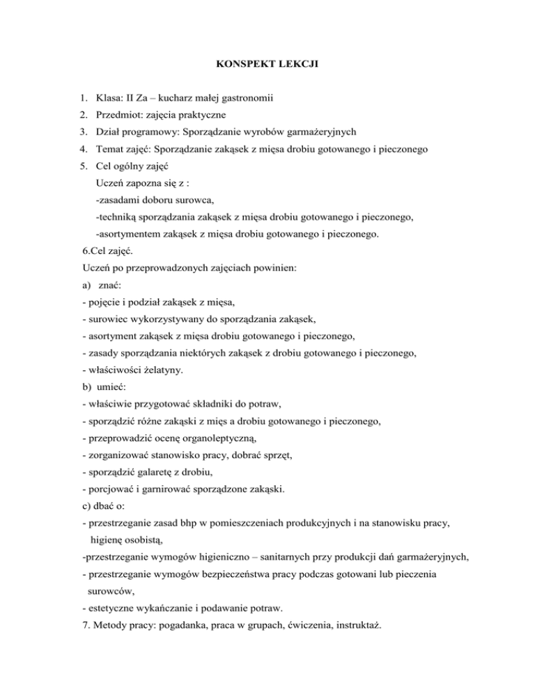 KONSPEKT LEKCJI 1. Klasa: II Za – kucharz małej gastronomii 2. Przedmiot: zajęcia praktyczne 3. Dział programowy: Sporządzanie wyrobów garmaŜeryjnych 4. Temat zajęć: Sporządzanie zakąsek z mięsa drobiu gotowanego i pieczonego 5. Cel ogólny zajęć Uczeń zapozna się z : -zasadami doboru surowca, -techniką sporządzania zakąsek z mięsa drobiu gotowanego i pieczonego, -asortymentem zakąsek z mięsa drobiu gotowanego i pieczonego. 6.Cel zajęć. Uczeń po przeprowadzonych zajęciach powinien: a) znać: - pojęcie i podział zakąsek z mięsa, - surowiec wykorzystywany do sporządzania zakąsek, - asortyment zakąsek z mięsa drobiu gotowanego i pieczonego, - zasady sporządzania niektórych zakąsek z drobiu gotowanego i pieczonego, - właściwości Ŝelatyny. b) umieć: - właściwie przygotować składniki do potraw, - sporządzić róŜne zakąski z mięs a drobiu gotowanego i pieczonego, - przeprowadzić ocenę organoleptyczną, - zorganizować stanowisko pracy, dobrać sprzęt, - sporządzić galaretę z drobiu, - porcjować i garnirować sporządzone zakąski. c) dbać o: - przestrzeganie zasad bhp w pomieszczeniach produkcyjnych i na stanowisku pracy, higienę osobistą, -przestrzeganie wymogów higieniczno – sanitarnych przy produkcji dań garmaŜeryjnych, - przestrzeganie wymogów bezpieczeństwa pracy podczas gotowani lub pieczenia surowców, - estetyczne wykańczanie i podawanie potraw. 7. Metody pracy: pogadanka, praca w grupach, ćwiczenia, instruktaŜ. 8. Środki dydaktyczne: narzędzia pracy, polecenie wykonania, dowód RW, receptury warsztatowe, surowce pobrane z magazynu, urządzania i sprzęt, zeszyt przedmiotowy uczniów. 9.Forma zajęć: indywidualna, grupowa. 10. Literatura: - M. Konarzewska – „Technologia gastronomiczna z towaroznawstwem” - E. Kotarska – „Przekąski na kaŜdą okazję” -Dr OEtker- Zimne dania i przekąski” - M. Michalik- „Mała encyklopedia sztuki kulinarnej” - czasopisma z recepturami STRUKTURA ZAJĘĆ I.Czynności organizacyjno- porządkowe - sprawdzenie obecności - sprawdzenie ubioru ochronnego II. Kontrola pracy domowej Chętni uczniowie odczytują pracę domową. III. Kontrola wiadomości z poprzednich lekcji. Nauczyciel zdaje pytania następującej treści: - Co to są zakąski? - Jak moŜna podzielić zakąski? - Jakie wymogi higieniczno sanitarne obowiązują przy sporządzaniu zakąsek? - Jaki jest asortyment zakąsek z mięsa pieczonego? - Jaki znasz asortyment zakąsek z mięsa pieczonego? IV. Wprowadzenie nowego materiału. - zapisanie tematu lekcji, - podanie celów zajęć. V. Praca nad nowym materiałem. - dobór surowca do zakąsek z drobiu gotowanego i pieczonego, - podział i asortyment zakąsek z drobiu gotowanego i pieczonego, - właściwości Ŝelatyny, - technika sporządzania zakąsek z drobiu gotowanego i pieczonego, - porcjowanie i dekorowanie zakąsek. VI. Część ćwiczeniowa. Nauczyciel obserwuje organizację stanowisk pracy, przebieg procesu technologicznego, przestrzeganie przepisów bhp, udziela instruktaŜu bieŜącego. Uczniowie wykonują ćwiczenia: - galaretki drobiowe, - galantyna z kurczaka, - udka nadziewane, - sałatka z gotowanym filetem z kurczaka, - kurczę pieczone z nadzieniem polskim. VII. Likwidacja stanowisk pracy – czynności porządkowe. VIII. Podsumowanie zajęć praktycznych. - przekazanie uwag i wniosków - uczniowie dokonują oceny jakości wykonanych potraw, - nauczyciel ocenia pracę uczniów. IX. Zadanie pracy domowej: Z dowolnej literatury podaj recepturę na ciekawą zakąskę z mięsa drobiu gotowanego lub pieczonego. K. TARKOWSKA