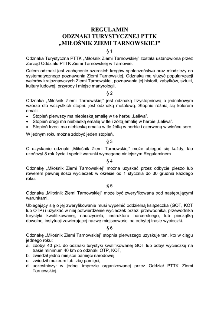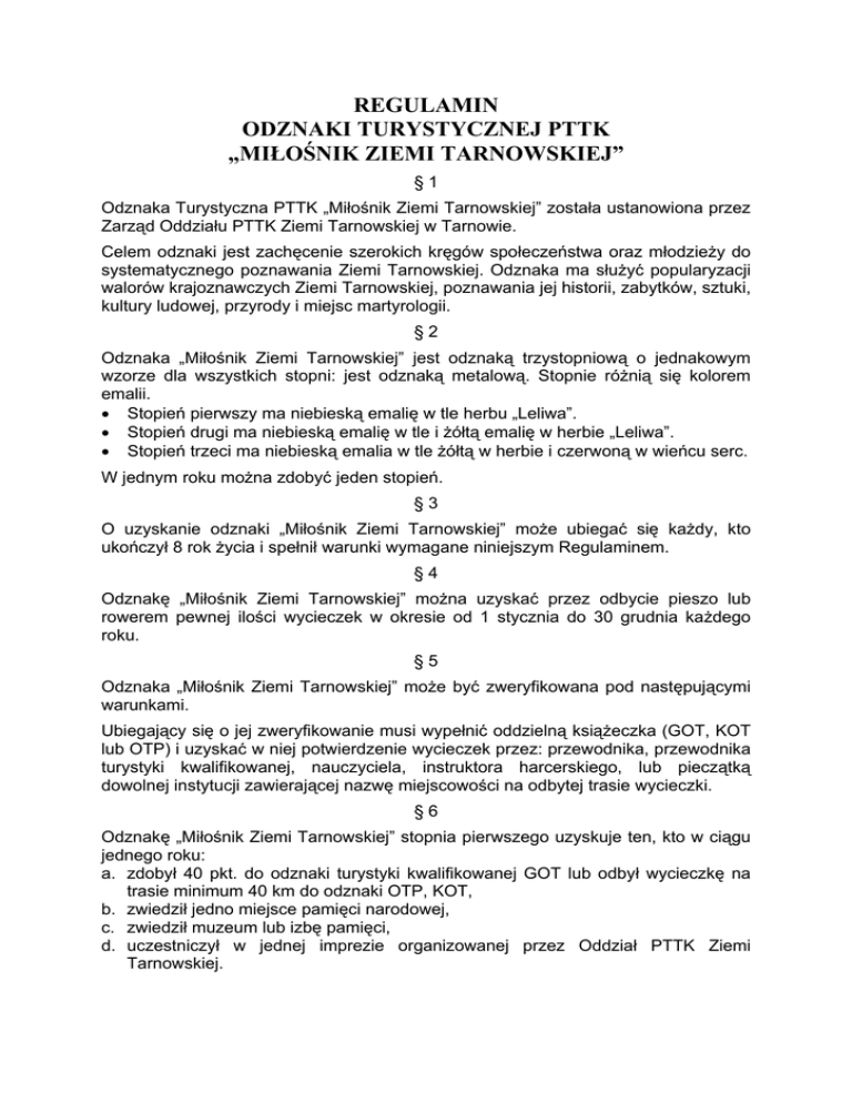 REGULAMIN ODZNAKI TURYSTYCZNEJ PTTK „MIŁOŚNIK ZIEMI TARNOWSKIEJ” §1 Odznaka Turystyczna PTTK „Miłośnik Ziemi Tarnowskiej” została ustanowiona przez Zarząd Oddziału PTTK Ziemi Tarnowskiej w Tarnowie. Celem odznaki jest zachęcenie szerokich kręgów społeczeństwa oraz młodzieży do systematycznego poznawania Ziemi Tarnowskiej. Odznaka ma służyć popularyzacji walorów krajoznawczych Ziemi Tarnowskiej, poznawania jej historii, zabytków, sztuki, kultury ludowej, przyrody i miejsc martyrologii. §2 Odznaka „Miłośnik Ziemi Tarnowskiej” jest odznaką trzystopniową o jednakowym wzorze dla wszystkich stopni: jest odznaką metalową. Stopnie różnią się kolorem emalii. • Stopień pierwszy ma niebieską emalię w tle herbu „Leliwa”. • Stopień drugi ma niebieską emalię w tle i żółtą emalię w herbie „Leliwa”. • Stopień trzeci ma niebieską emalia w tle żółtą w herbie i czerwoną w wieńcu serc. W jednym roku można zdobyć jeden stopień. §3 O uzyskanie odznaki „Miłośnik Ziemi Tarnowskiej” może ubiegać się każdy, kto ukończył 8 rok życia i spełnił warunki wymagane niniejszym Regulaminem. §4 Odznakę „Miłośnik Ziemi Tarnowskiej” można uzyskać przez odbycie pieszo lub rowerem pewnej ilości wycieczek w okresie od 1 stycznia do 30 grudnia każdego roku. §5 Odznaka „Miłośnik Ziemi Tarnowskiej” może być zweryfikowana pod następującymi warunkami. Ubiegający się o jej zweryfikowanie musi wypełnić oddzielną książeczka (GOT, KOT lub OTP) i uzyskać w niej potwierdzenie wycieczek przez: przewodnika, przewodnika turystyki kwalifikowanej, nauczyciela, instruktora harcerskiego, lub pieczątką dowolnej instytucji zawierającej nazwę miejscowości na odbytej trasie wycieczki. §6 Odznakę „Miłośnik Ziemi Tarnowskiej” stopnia pierwszego uzyskuje ten, kto w ciągu jednego roku: a. zdobył 40 pkt. do odznaki turystyki kwalifikowanej GOT lub odbył wycieczkę na trasie minimum 40 km do odznaki OTP, KOT, b. zwiedził jedno miejsce pamięci narodowej, c. zwiedził muzeum lub izbę pamięci, d. uczestniczył w jednej imprezie organizowanej przez Oddział PTTK Ziemi Tarnowskiej. Odznakę „Miłośnik Ziemi Tarnowskiej” stopnia drugiego uzyskuje ten, kto w ciągu jednego roku: a. zdobył 80 pkt. do odznaki turystyki kwalifikowanej GOT lub odbył wycieczkę na trasie minimum 80 km do odznaki OTP, KOT, b. zwiedził dwa miejsca pamięci narodowej, c. zwiedził dwa muzea lub dwie izby pamięci, d. zwiedził dwie miejscowości na terenie Ziemi Tarnowskiej, e. uczestniczył w dwóch imprezach organizowanych przez Oddział PTTK Ziemi Tarnowskiej. Odznaką „Miłośnik Ziemi Tarnowskiej” stopnia trzeciego uzyskuje ten, kto w ciągu jednego roku: a. zdobył 120 pkt do odznaki turystyki kwalifikowanej GOT lub odbył wycieczkę na trasie minimum 120 km do odznaki OTP, KOT, b. zwiedził pięć miejsc pamięci narodowej, c. zwiedził cztery miejscowości na terenie Ziemi Tarnowskiej, d. uczestniczył w trzech imprezach organizowanych przez Oddział PTTK Ziemi Tarnowskiej. §7 Zwiedzanie tych samych miejsc pamięci narodowej muzeów, izb pamięci, oraz miejscowości może być zaliczone tylko raz niezależnie od stopnia odznaki. §8 Odznakę „Miłośnik Ziemi Tarnowskiej” można zdobywać równocześnie z innymi odznakami turystyki kwalifikowanej. §9 Książeczki turystyki kwalifikowanej GOT, KOT lub OTP wypełnione weryfikują Komisje Oddziału PTTK Ziemi Tarnowskiej za pośrednictwem Referatu Weryfikacyjnego Turystyki Kwalifikowanej. W książeczkach tych należy zaznaczyć punkty na Odznakę „Miłośnik Ziemi Tarnowskiej”. § 10 Teren Ziemi Tarnowskiej, na którym zdobywać można odznakę to obszar: ze wschodu od Wisłoki, po Rabę na zachodzie, na północy od Wisły, po Beskid Wyspowy na południu. § 11 Interpretacja wymagań Regulaminu należy do ZO PTTK. Oznakę „Miłośników Ziemi Tarnowskiej” można nabyć tylko w biurze PTTK Oddziału Ziemi Tarnowskiej ul. Żydowska 20 na podstawie zweryfikowanej książeczki turystyki kwalifikowanej GOT, KOT lub OTP. 2