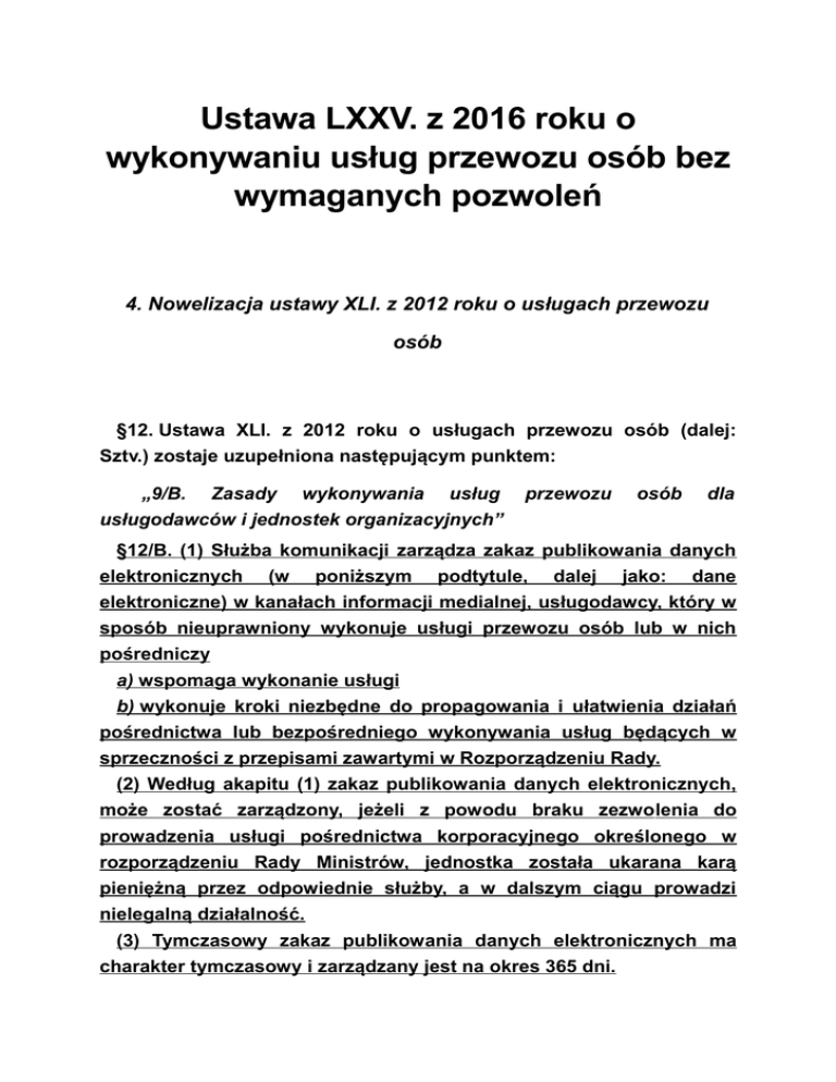 Ustawa LXXV. z 2016 roku o wykonywaniu usług przewozu osób bez wymaganych pozwoleń 4. Nowelizacja ustawy XLI. z 2012 roku o usługach przewozu osób §12. Ustawa XLI. z 2012 roku o usługach przewozu osób (dalej: Sztv.) zostaje uzupełniona następującym punktem: „9/B. Zasady wykonywania usług usługodawców i jednostek organizacyjnych” przewozu osób dla §12/B. (1) Służba komunikacji zarządza zakaz publikowania danych elektronicznych (w poniższym podtytule, dalej jako: dane elektroniczne) w kanałach informacji medialnej, usługodawcy, który w sposób nieuprawniony wykonuje usługi przewozu osób lub w nich pośredniczy a) wspomaga wykonanie usługi b) wykonuje kroki niezbędne do propagowania i ułatwienia działań pośrednictwa lub bezpośredniego wykonywania usług będących w sprzeczności z przepisami zawartymi w Rozporządzeniu Rady. (2) Według akapitu (1) zakaz publikowania danych elektronicznych, może zostać zarządzony, jeżeli z powodu braku zezwo lenia do prowadzenia usługi pośrednictwa korporacyjnego określonego w rozporządzeniu Rady Ministrów, jednostka została ukarana karą pieniężną przez odpowiednie służby, a w dalszym ciągu prowadzi nielegalną działalność. (3) Tymczasowy zakaz publikowania danych elektronicznych ma charakter tymczasowy i zarządzany jest na okres 365 dni. (4) Nałożenie zakazu publikowania danych elektronicznych, Służba Komunikacji ogłasza za pośrednictwem opublikowanego ogłoszenia. Ogłoszenie musi być publikowane internetowej Służby Komunikacji. przez 15 dni, na stronie tymczasowego zakazu (5) W związku z akapitem (4) ogłoszenie musi zawierać: a) przedmiot sprawy i krótki opis, b) dane niezbędne publikowania, do wprowadzenia c) informację o miejscu i czasie, w którym objęci zakazem mogą zapoznać się z dokumentami sprawy. §12/C. (1) Zobowiązane do przestrzegania nałożonych zakazów, zgodnie z §12/B. (1) są wszystkie jednostki mediów elektronicznych. (2) Wykonanie czasowego zakazu publikacji danych elektronicznych, nadzoruje Narodowy Medialny i Informacyjny Urząd (dalej: NMHH), zgodnie z przepisami o mediach elektronicznych. (3) Urząd komunikacji może nałożyć karę pieniężną w wysokości od 50000 forintów do 200000 forintów, na usługodawcę określonym w akapicie (1), który nie podporządkował się zawartym w §12/B. Kara może zostać nałożona ponownie w przypadku dalszego naruszania zakazu. §12/D. (1) Tymczasowy zakaz publikacji danych elektronicznych traci moc po upływie 365 dni liczonych od dnia zarządzenia. (2) Służba komunikacji, może skrócić czas zakazu, a) jeżeli powód wydania decyzji został usunięty, bądź b) w postępowaniu karnym prowadzone są równoległe działania przez sąd, odrębną służbę państwową, NMHH, działania wymagają środków zapobiegawczych lub został zarządzony całkowity zakaz publikowania danych elektronicznych lub prowadzone jest postępowanie wykonawcze. (3) W postanowieniu należy uwzględniać zapisy §12/B. akapit (4) i (5). §12/E. Służba komunikacji w celu przestrzegania przepisów prawa i informowania obywateli, upublicznia zarządzenia podjęte na podstawie §12/B. wraz z danymi strony internetowej, której sprawa dotyczy. §12/F. Pojazd, którym wykonywana była nielegalna usługa, musi zostać wycofany z ruchu na czas określony, na podstawie kodeksu postępowania komunikacyjnego, wydawania i odbierania uprawnień i dokumentów,