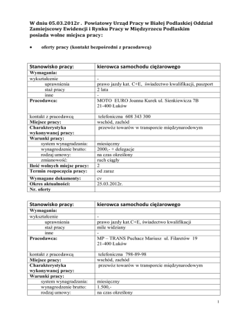 W dniu 05.03.2012r . Powiatowy Urząd Pracy w Białej Podlaskiej Oddział Zamiejscowy Ewidencji i Rynku Pracy w Międzyrzecu Podlaskim posiada wolne miejsca pracy: oferty pracy (kontakt bezpośredni z pracodawcą) Stanowisko pracy: Wymagania: wykształcenie uprawnienia staż pracy inne Pracodawca: kierowca samochodu ciężarowego prawo jazdy kat. C+E, świadectwo kwalifikacji, paszport 2 lata MOTO EURO Joanna Kurek ul. Sienkiewicza 7B 21-400 Łuków kontakt z pracodawcą Miejsce pracy: Charakterystyka wykonywanej pracy: Warunki pracy: system wynagradzania: wynagrodzenie brutto: rodzaj umowy: zmianowość: Ilość wolnych miejsc pracy: Termin rozpoczęcia pracy: telefoniczna 608 343 300 wschód, zachód przewóz towarów w transporcie międzynarodowym Wymagane dokumenty: Okres aktualności: Nr. oferty cv 25.03.2012r. Stanowisko pracy: kierowca samochodu ciężarowego Wymagania: wykształcenie uprawnienia staż pracy inne Pracodawca: kontakt z pracodawcą Miejsce pracy: Charakterystyka wykonywanej pracy: Warunki pracy: system wynagradzania: wynagrodzenie brutto: rodzaj umowy: miesięczny 2000,- + delegacje na czas określony ruch ciągły 2 od zaraz prawo jazdy kat.C+E, świadectwo kwalifikacji mile widziany MP – TRANS Puchacz Mariusz ul. Filaretów 19 21-400 Łuków telefoniczna 798-89-98 wschód, zachód przewóz towarów w transporcie międzynarodowym miesięczny 1.500,na czas określony 1 zmianowość: Ilość wolnych miejsc pracy: Termin rozpoczęcia pracy: ruch ciągły 2 01.03.2012r. Wymagane dokumenty: Okres aktualności: Nr. oferty cv 22.03.2012r. Stanowisko pracy: kierowca autobusu Wymagania: wykształcenie uprawnienia staż pracy inne Pracodawca: prawo jazdy kat. D , świadectwo kwalifikacji mile widziany osoba kontaktowa PHU WERSPOL Wąsiewicz Stanisław Gołaszyn 15A 21-400 Łuków kontakt z pracodawcą Miejsce pracy: Charakterystyka wykonywanej pracy: Warunki pracy: system wynagradzania: wynagrodzenie brutto: rodzaj umowy: zmianowość: Ilość wolnych miejsc pracy: Termin rozpoczęcia pracy: telefoniczna 697 088 360 kraj przewóz osób na terenie kraju Wymagane dokumenty: Okres aktualności: Nr. oferty cv 26.03.2012r. Stanowisko pracy: kierowca samochodu ciężarowego Wymagania: wykształcenie uprawnienia staż pracy inne Pracodawca: kontakt z pracodawcą Miejsce pracy: Charakterystyka wykonywanej pracy: Warunki pracy: system wynagradzania: wynagrodzenie brutto: miesięczny 1.500,na czas określony wg grafiku 3 01.03.2012r. zawodowe prawo jazdy kat. C + E, świadectwo kwalifikacji mile widziany Firma Transportowo-Handlowa LT-TRANS Leszek Turski Dębowica 67 21-404 Trzebieszów telefoniczna 25 7960793, 606 405 366 Dębowica 67 przewóz osób towarów w transporcie międzynarodowym po krajach UE miesięczny 1.600,2 rodzaj umowy: zmianowość: Ilość wolnych miejsc pracy: Termin rozpoczęcia pracy: na czas określony ruch ciągły 1 05.03.2012r. Wymagane dokumenty: Okres aktualności: Nr. oferty cv 31.03.2012r. Stanowisko pracy: elektromechanik pojazdów samochodowych Wymagania: wykształcenie uprawnienia staż pracy inne Pracodawca: zawodowe elektromechaniczne prawo jazdy kat.B mile widziany obsługa komputera, programów serwisowych PPH AGRO – TOP Kol. Gręzówka 34B 21-400 Łuków kontakt z pracodawcą Miejsce pracy: Charakterystyka wykonywanej pracy: Warunki pracy: system wynagradzania: wynagrodzenie brutto: rodzaj umowy: zmianowość: Ilość wolnych miejsc pracy: Termin rozpoczęcia pracy: osobista, telefoniczna 25 798 15 94 w.120 Kol. Gręzówka naprawa samochodów ciężarowych Wymagane dokumenty: Okres aktualności: Nr. oferty cv 27.03.2012r. Stanowisko pracy: kierowca samochodu ciężarowego Wymagania: wykształcenie uprawnienia staż pracy inne Pracodawca: kontakt z pracodawcą Miejsce pracy: Charakterystyka wykonywanej pracy: Warunki pracy: miesięczny 1500,- + premia na czas określony dwie zmiany 1 01.03.2012r. prawo jazdy kat. C+E, świadectwo kwalifikacji, psychotesty mile widziany SZAR-TRANS Łukasik Patryk ul. Kruczkowskiego 27 21-400 Łuków osobista, telefoniczna 600 043 390 wschód, zachód przewóz towarów w transporcie międzynarodowym 3 system wynagradzania: wynagrodzenie brutto: rodzaj umowy: zmianowość: Ilość wolnych miejsc pracy: Termin rozpoczęcia pracy: miesięczny i od przejechanych kilometrów ok.5000,na czas określony ruch ciągły 1 01.03.2012r. Wymagane dokumenty: Okres aktualności: Nr. oferty cv 27.03.2012r. Stanowisko pracy: elektryk Wymagania: wykształcenie uprawnienia staż pracy inne Pracodawca: kontakt z pracodawcą Miejsce pracy: Charakterystyka wykonywanej pracy: Warunki pracy: system wynagradzania: wynagrodzenie brutto: rodzaj umowy: zmianowość: Ilość wolnych miejsc pracy: Termin rozpoczęcia pracy: zawodowe mile widziany Zakład Mięsny „Wierzejki”J.M. Zdanowscy osobisty w godz. 7,00- 16,00 Płudy 21, 21-404 Trzebieszów naprawa maszyn i urządzeń znajdujących się w działach produkcyjnych miesięczny 1500,na okres określony dwie zmiany 2 01.03.2012r. Wymagane dokumenty: Okres aktualności: cv 15.03.2012r Stanowisko pracy: strażnik Wymagania: wykształcenie uprawnienia staż pracy inne Pracodawca: kontakt z pracodawcą Miejsce pracy: Charakterystyka wykonywanej pracy: mile widziany orzeczenie o stopniu niepełnosprawności Impel Security Polska Sp. z o.o Wrocław ul. Ślężna 118 telefoniczny 510012492 Wróbel Stanisław , e-mail – [email protected] Międzyrzec Podlaski kierowanie ruchem osobowym, pełnienie patroli 4 Warunki pracy: system wynagradzania: wynagrodzenie brutto: rodzaj umowy: zmianowość: Ilość wolnych miejsc pracy: Termin rozpoczęcia pracy: miesięczny 1500,na okres próbny dwie zmiany 1 01.03.2012r. Wymagane dokumenty: Okres aktualności: Nr. oferty CV 31.03.2012r. Ofpr/12/0072 Stanowisko pracy: sprzedawca Wymagania: wykształcenie uprawnienia staż pracy inne Pracodawca: kontakt z pracodawcą Miejsce pracy: Charakterystyka wykonywanej pracy: Warunki pracy: system wynagradzania: wynagr
