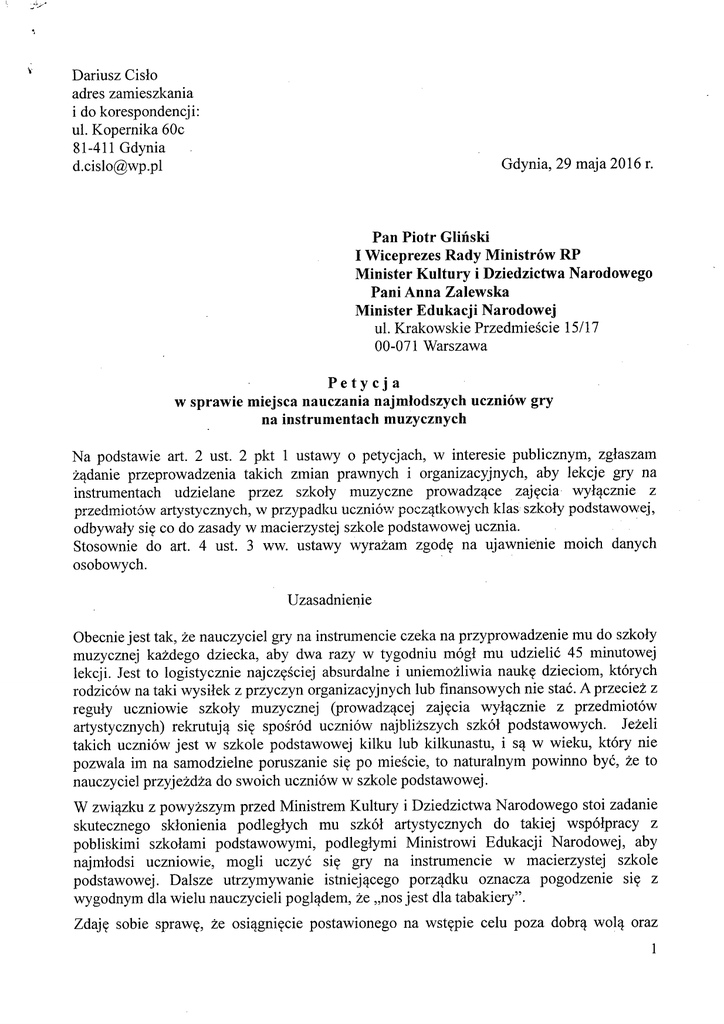 Dariusz Cisło adres zamieszkania i do korespondencji: ul. Kopernika 60c 81-411 Gdynia [email protected] Gdynia, 29 maja 2016 r. Pan Piotr Gliński I Wiceprezes Rady Ministrów RP Minister Kultury i Dziedzictwa Narodowego Pani Anna Zalewska Minister Edukacji Narodowej ul. Krakowskie Przedmieście 15/17 00-071 Warszawa Petycja w sprawie miejsca nauczania najmłodszych uczniów gry na instrumentach muzycznych Na podstawie art. 2 ust. 2 pkt 1 ustawy o petycjach, w interesie publicznym, zgłaszam żądanie przeprowadzenia takich zmian prawnych i organizacyjnych, aby lekcje gry na instrumentach udzielane przez szkoły muzyczne prowadzące zajęcia wyłącznie z przedmiotów artystycznych, w przypadku uczniów początkowych klas szkoły podstawowej, odbywały się co do zasady w macierzystej szkole podstawowej ucznia. Stosownie do art. 4 ust. 3 ww. ustawy wyrażam zgodę na ujawnienie moich danych osobowych. Uzasadnienie Obecnie jest tak, że nauczyciel gry na instrumencie czeka na przyprowadzenie mu do szkoły muzycznej każdego dziecka, aby dwa razy w tygodniu mógł mu udzielić 45 minutowej lekcji. Jest to logistycznie najczęściej absurdalne i uniemożliwia naukę dzieciom, których rodziców na taki wysiłek z przyczyn organizacyjnych lub finansowych nie stać. A przecież z reguły uczniowie szkoły muzycznej (prowadzącej zajęcia wyłącznie z przedmiotów artystycznych) rekrutują się spośród uczniów najbliższych szkół podstawowych. Jeżeli takich uczniów jest w szkole podstawowej kilku lub kilkunastu, i są w wieku, który nie pozwala im na samodzielne poruszanie się po mieście, to naturalnym powinno być, że to nauczyciel przyjeżdża do swoich uczniów w szkole podstawowej. W związku z powyższym przed Ministrem Kultury i Dziedzictwa Narodowego stoi zadanie skutecznego skłonienia podległych mu szkół artystycznych do takiej współpracy z pobliskimi szkołami podstawowymi, podległymi Ministrowi Edukacji Narodowej, aby najmłodsi uczniowie, mogli uczyć się gry na instrumencie w macierzystej szkole podstawowej. Dalsze utrzymywanie istniejącego porządku oznacza pogodzenie się z wygodnym dla wielu nauczycieli poglądem, że „nos jest dla tabakiery". Zdaję sobie sprawę, że osiągnięcie postawionego na wstępie celu poza dobrą wolą oraz 1 zdolnością zmiany przyzwyczajeń, wymaga także pewnego wysiłku organizacyjnego. W szczególności konieczne będzie przygotowanie w szkole podstawowej wyciszonego pokoju, w którym znajdzie się miejsce na nastrojone pianino oraz będą mogły być bezpiecznie przechowywane instrumenty przynoszone przez uczniów. Z kolei szkoła muzyczna powinna zapewnić swoim nauczycielom zwrot kosztów dojazdów oraz odpowiednio zmienić w zawartych z nimi umowach miejsce wykonywania obowiązków. Dyrekcje obu szkół powinny informować się z wyprzedzeniem o liczbie uczniów, którzy powinni być objęci nauczaniem gry na instrumencie w szkole podstawowej oraz uwzględniać możliwości drugiej szkoły przy układaniu planów lekcji. Zapoczątkowana w powyższych okolicznościach współpraca powinna z czasem okazać się w wielu aspektach korzystna dla każdej ze szkół. Zanim to jednak nastąpi, Ministrowie nadzorujący oba rodzaje szkolnictwa powinni — stwarzając uprzednio odpowiednie warunki — wymusić podjęcie współpracy. W szczególnoś ci powinni ustalić liczbę uczniów szkoły muzycznej, od której udzielanie lekcji gry na instrumencie w szkole podstawowej byłoby obowiązkowe oraz określić wiek uczniów objętych takim programem. Z natury rzeczy nakładanie pozaustawowych obowiązków powinno dotyczyć szkół publicznych lub finansowanych ze środków publicznych. Szkoły takie nie powinny być bowiem prowadzone dla wygody nauczycieli, a w szczególności nie powinny stawiać wymagań, którym mogą sprostać jedynie dzieci pochodzące z rodzin zamożnych. Przeciwnie, z podatków powinna być finansowana w pierwszej kolejności edukacja tych dzieci, których rodziców nie stać na opłacenie szkół prywatnych. Jednocześnie należałoby zachęcić szkoły prywatne (tak muzyczne, jak i podstawowe), aby poprzez nawiązanie współpracy organizacyjnej pomagały swoim najmłodszym uczniom w nauce gry na instrumentach. Gdy propozycja takiej współpracy wyjdzie ze strony szkoły prywatnej, to jej przyjęcie przez szkołę publiczną (na warunkach określonych przez Ministra) powinno być obligatoryjne. Szanowni Państwo podjęcie działań we wskazanym w petycji celu będzie jednocześnie sprawdzianem, czy kierowane przez Was Ministerstwa chcą objąć ochroną najsł abszych obywateli (w tym przypadku rozumianych dosłownie), czy raczej tradycyjnie swoje zadanie ograniczają do obrony i rozszerzania resortowych przywilejów. W związku z przedmiotem petycji, jej adresatami są przedstawiciele dwóch Ministerstw. iusz Cisło ;i<;2r7f; Do wiadomoś ci: Centrum Edukacji Artystycznej - e-mail: sekretariat@cea(dot)art.pl 2 •'. Dariusz Cisło adres zamieszkania i do korespondencji: ul. Kopernika 60c 81-411 Gdynia [email protected] Gdynia, 29 maja 2016 r. Pan Piotr Gliński I Wiceprezes Rady Ministrów RP Minister Kultury i Dziedzictwa Narodowego Pani Anna Zalewska Minister Edukacji Narodowej ul. Krakowskie Przedmieście 15/17 00-071 Warszawa Petycja w sprawie miejsca nauczania najmł odszych uczniów gry na instrumentach muzycznych Na podstawie art. 2 ust. 2 pkt 1 ustawy o petycjach, w interesie publicznym, zgłaszam żądanie przeprowadzenia takich zmian prawnych i organizacyjnych, aby lekcje gry na instrumentach udzielane przez szkoły muzyczne prowadzące zajęcia wyłącznie z przedmiotów artystycznych, w przypadku uczniów początkowych klas szkoły podstawowej, odbywały się co do zasady w macierzystej szkole podstawowej ucznia. Stosownie do art. 4 ust. 3 ww. ustawy wyrażam zgodę na ujawnienie moich danych osobowych. Uzasadnienie ły Obecnie jest tak, że nauczyciel gry na instrumencie czeka na przyprowad