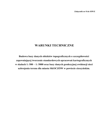 Załącznik nr 8 do SIWZ WARUNKI TECHNICZNE Budowa bazy danych obiektów topograficznych o szczegółowości zapewniającej tworzenie standardowych opracowań kartograficznych w skalach 1: 500 – 1: 5000 oraz bazy danych geodezyjnej ewidencji sieci uzbrojenia terenu dla miasta SKOCZÓW w powiecie cieszyńskim. I. PRZEDMIOT ZAMÓWIENIA Przedmiotem zamówienia jest realizacja usługi pn. ”Budowa baz danych obiektów topograficznych o szczegółowości zapewniającej tworzenie standardowych opracowań kartograficznych w skalach 1:500 – 1:5000 oraz bazy danych geodezyjnej ewidencji sieci uzbrojenia terenu dla miasta Skoczów w powiecie cieszyńskim”. Opracowanie polega na budowie oraz harmonizacji baz danych, obejmujących zbiory danych przestrzennych infrastruktury informacji przestrzennej dotyczące: 1. geodezyjnej ewidencji sieci uzbrojenia terenu, o której mowa w art. 4 ust. 1a pkt 3 ustawy z dnia 17 maja 1989 r. Prawo geodezyjne i kartograficzne, 2. bazy danych obiektów topograficznych o szczegółowości zapewniającej tworzenie standardowych opracowań kartograficznych w skalach 1:500 – 1:5000, o której mowa w art. 4 ust. 1b ww. ustawy, 3. bazy ewidencji gruntów i budynków, o której mowa w art. 4 ust. 1a pkt 1 ww. ustawy, w zakresie danych niezbędnych do generowania mapy zasadniczej. Zakres prac obejmuje obszar jednostki ewidencyjnej Skoczów miasto, która podzielona jest na 5 obrębów ewidencyjnych zawierających 5343 działek o łącznej powierzchnia 984 ha, z czego: 326 ha stanowią grunty rolne, 185 ha grunty leśne, 338 ha tereny zabudowane i zurbanizowane, 90 ha tereny komunikacyjne, 36 ha grunty pod wodami i 9 ha pozostałe. W ewidencji gruntów i budynków wykazanych jest ok. 3950 budynków. Ilość działek Ilość budynków 1 2 3 4 5 Powierzchnia ewidencyjna [ha] 105 370 90 210 209 1090 1945 189 966 1153 1042 1308 177 564 858 suma 984 5343 3949 Nr obrębu Tab. 1 – Charakterystyka bazy danych EGiB Materiały niezbędne do wykonania przedmiotu zamówienia będą wydane po podpisaniu umowy i złożeniu zgłoszenia pracy geodezyjnej. Wykonawca zobowiązany jest do osobistego odbioru materiałów, natomiast w przypadku danych numerycznych możliwe będzie udostępnienie danych z wykorzystaniem protokołu transferu plików – FTP Wykonawcy. Należy każdorazowo poświadczać odbiór przekazywanych materiałów. Wykonawca zobowiązany jest do wykorzystania przy tworzeniu baz danych GESUT oraz BDOT500 materiałów przekazanych przez Zamawiającego zgodnie z zasadami określonymi w § 6 rozporządzenia w sprawie standardów. Przedmiot zamówienia został podzielony na cztery etapy: budowę baz danych dla obrębu 4 – - Etap I obejmuje do 11 stycznia 2015r. termin wykonania - Etap II –– obejmuje budowę baz danych dla obrębu 1 i 5 – termin wykonania do 29 lutego 2016r. - Etap III obejmuje budowę baz danych dla obrębu 2 i 3 – termin wykonania do 18 kwietnia 2016r. - Etap IV – Uzgodnienie inicjalnej bazy danych GESUT z podmiotami władającymi sieciami uzbrojenia terenu – termin realizacji do 31 maja 2016r. str.2 Rys.1 Poglądowa mapa ewidencyjna II. OBOWIĄZUJĄCE PRZEPISY 1. Przedmiot zamówienia realizowany będzie zgodnie z obowiązującymi przepisami prawa, zawartymi w szczególności, w: 1) ustawie z dnia 17 maja 1989 r. – Prawo geodezyjne i kartograficzne (t.j. Dz. U. z 2015 r., poz. 520 z późn. zm.); 2) ustawie z dnia 5 czerwca 2014 r. o zmianie ustawy – Prawo geodezyjne i kartograficzne oraz ustawy o postępowaniu egzekucyjnym w administracji (Dz.U. 2014 poz. 897); 3) ustawie z dnia 17 lutego 2005r. o informatyzacji działalności podmiotów realizujących zadania str.3 publiczne (tj. Dz. U. z 2014r. poz. 1114); 4) ustawie z dnia 4 marca 2010 r. o infrastrukturze informacji przestrzennej (Dz.U. Nr 76 poz. 489 z późn. zm.); 5) rozporządzeniu Rady Ministrów z dnia 15 października 2012 r. w sprawie państwowego systemu odniesień przestrzennych (Dz. U., poz. 1247) ; 6) rozporządzeniu Ministra Administracji i Cyfryzacji z dnia 14 lutego 2012 r. w sprawie osnów geodezyjnych, grawimetrycznych i magnetycznych (Dz.U., poz. 352) ; 7) rozporządzeniu Ministra Administracji i Cyfryzacji z dnia 5 września 2013r. w sprawie organizacji i trybu prowadzenia państwowego zasobu geodezyjnego i kartograficznego (Dz.U. poz. 1183) ; 8) rozporządzeniu Ministra Spraw Wewnętrznych i Administracji z dnia 9 listopada 2011 r. w sprawie standardów technicznych wykonywania geodezyjnych pomiarów sytuacyjnych i wysokościowych oraz opracowywania i przekazywania wyników tych pomiarów do państwowego zasobu geodezyjnego i kartograficznego (Dz. U. Nr 263, poz. 1572), zwanym dalej rozporządzeniem w sprawie standardów; 9) rozporządzeniu Ministra Rozwoju Regionalnego i Budownictwa z dnia 29 marca 2001 r. w sprawie ewidencji gruntów i budynków (t.j. Dz. U. z 2015 r., poz. 542); 10) rozporządzeniu Ministra Administracji i Cyfryzacji z dnia 9 stycznia 2012 r. w sprawie ewidencji miejscowości, ulic i adresów (Dz.U. poz. 125); 11) rozporządzeniu Rady Ministrów z dnia 12 kwietnia 2012 r. w sprawie Krajowych Ram Interoperacyjności, minimalnych wymagań dla rejestrów publicznych i wymiany informacji w postaci elektronicznej oraz minimalnych wymagań dla systemów teleinformatycznych (Dz.U. poz. 526). Ponadto Wykonawca zobowiązany jest opracować przedmiot zamówienia zgodnie z zapisami określonymi w projektach rozporządzeń: 12) Ministra Administracji i Cyfryzacji w sprawie bazy danych obiektów topograficznych oraz mapy zasadniczej – dostępny na stronie http://mac.bip.gov.pl/projekty-aktow-prawnych/projekt-rozporzadzeniaministra-aic-w-sprawie-w-sprawie-bazy-danych-obiektow-topograficznych-oraz-mapy-zasadniczej.html 13) Ministra Administracji i Cyfryzacji w sprawie powiatowej bazy GESUT i krajowej bazy GESUT – dostępny na stronie http://mac.bip.gov.pl/projekty-aktow-prawnych/projekt-rozporzadzenia-ministraadministracji-i-cyfryzacji-w-sprawie-pow