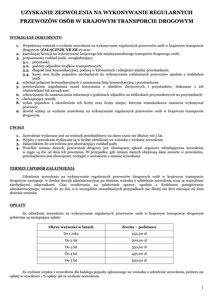 UZYSKANIE ZEZWOLENIA NA WYKONYWANIE REGULARNYCH PRZEWOZÓW OSÓB W KRAJOWYM TRANSPORCIE DROGOWYM WYMAGANE DOKUMENTY: 1. Wypełniony wniosek o wydanie zezwolenia na wykonywanie regularnych przewozów osób w krajowym transporcie drogowym (ZAŁĄCZNIK NR ZR-1) oraz: 2. kserokopię licencji na wykonywanie krajowego lub międzynarodowego transportu drogowego osób; 3. proponowany rozkład jazdy, uwzględniający: 3.1. przystanki; 3.2. godziny odjazdów środków transportowych; 3.3. długość linii komunikacyjnej, podaną w kilometrach i odległości między przystankami; 3.4. kursy oraz liczbę pojazdów niezbędnych do wykonywania codziennych przewozów zgodnie z rozkładem jazdy 4. schemat połączeń komunikacyjnych z zaznaczoną linią komunikacyjną i przystankami; 5. potwierdzenie uzgodnienia zasad korzystania z obiektów dworcowych i przystanków, dokonane z ich właścicielami lub zarządcami; 6. zobowiązanie do zamieszczenia informacji o godzinach odjazdów na tabliczkach przystankowych na przystankach; 7. obowiązujący cennik; 8. wykaz pojazdów z określeniem ich liczby oraz liczby miejsc, którymi wnioskodawca zamierza wykonywać przewozy; 9. dowód wpłaty za wydanie zezwolenia na wykonywanie regularnych przewozów osób w krajowym transporcie drogowym. UWAGI 1. 2. 3. 4. Zezwolenie wydawane jest na wniosek przedsiębiorcy na okres czasu nie dłuższy niż 5 lat. Wypisy z zezwolenia wydawane są w liczbie określonej we wniosku o wydanie zezwolenia. Załącznikiem do zezwolenia jest obowiązujący rozkład jazdy Wszelkie zmiany danych, przewoźnik drogowy jest obowiązany zgłosić organowi udzielającemu zezwolenia w ciągu 14 dni od dnia ich powstania. W przypadku, gdy zmiany danych obejmują dane zawarte w zezwoleniu, przedsiębiorca jest obowiązany wystąpić z wnioskiem o zmianę zezwolenia. TERMIN I SPOSÓB ZAŁATWIENIA Udzielenie zezwolenia na wykonywanie regularnych przewozów drogowych osób w krajowym transporcie drogowym następuje w drodze decyzji administracyjnej po złożeniu wniosku o udzielenie zezwolenia wraz ze wszystkimi niezbędnymi załącznikami. Czas oczekiwania na załatwienie sprawy, zgodnie z Kodeksem postępowania administracyjnego, wynosi do 30 dni, a w szczególnie uzasadnionych przypadkach nie dłużej niż dwa miesiące od dnia złożenia wniosku. OPŁATY Za udzielenie zezwolenia na wykonywanie regularnych przewozów osób w krajowym transporcie drogowym pobierane są następujące opłaty: Okres ważności w latach Kwota – podstawa Do 1 roku 250,00 zł Do 2 lat 300,00 zł Do 3 lat 350,00 zł Do 4 lat 450,00 zł Do 5 lat 550,00 zł Za wydanie wypisu z zezwolenia dla każdego pojazdu zgłoszonego we wniosku o udzielenie zezwolenia, pobiera się opłatę w wysokości 1 % opłaty jak za wydanie zezwolenia. 1 PODSTAWA PRAWNA 1. Ustawa z dnia 6 września 2001 r. o transporcie drogowym (Dz.U. z 2007 r. Nr 125 poz. 874 - tekst jedn. ze zmianami). 2. Rozporządzenie Ministra Infrastruktury z dnia 4 grudnia 2007 r. w sprawie wysokości opłat za czynności administracyjne związane z wykonywaniem transportu drogowego oraz za egzaminowanie i wydawanie certyfikatu kompetencji zawodowych (Dz.U. z 2007 r. Nr 235, poz.1726). 3. Rozporządzenie Ministra Infrastruktury z dnia 8 czerwca 2004 r. w sprawie wzorów zezwoleń na wykonywanie krajowych i międzynarodowych przewozów drogowych osób oraz wypisów z zezwoleń (Dz.U. z 2004 r. Nr 144, poz.1519). 4. Rozporządzenie Ministra Infrastruktury z dnia 23 grudnia 2003 r. w sprawie stawek opłat uiszczanych przez przewoźników drogowych za czynności związane z opracowaniem analizy sytuacji rynkowej w zakresie krajowego regularnego przewozu osób (Dz. U. z 2003 r. Nr 232, poz.2331). 2