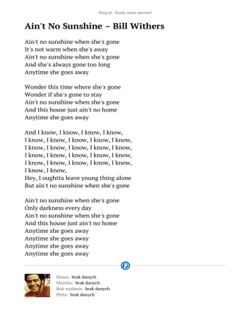 iSing.pl - Każdy może śpiewać! Ain't No Sunshine – Bill Withers Ain't no sunshine when she's gone It's not warm when she's away Ain't no sunshine when she's gone And she's always gone too long Anytime she goes away Wonder this time where she's gone Wonder if she's gone to stay Ain't no sunshine when she's gone And this house just ain't no home Anytime she goes away And I know, I know, I know, I know, I know, I know, I know, I know, I know, I know, I know, I know, I know, I know, I know, I know, I know, I know, I know, I know, I know, I know, I know, I know, I know, I know, Hey, I oughtta leave young thing alone But ain't no sunshine when she's gone Ain't no sunshine when she's gone Only darkness every day Ain't no sunshine when she's gone And this house just ain't no home Anytime she goes away Anytime she goes away Anytime she goes away Anytime she goes away Słowa: brak danych Muzyka: brak danych Rok wydania: brak danych Płyta: brak danych