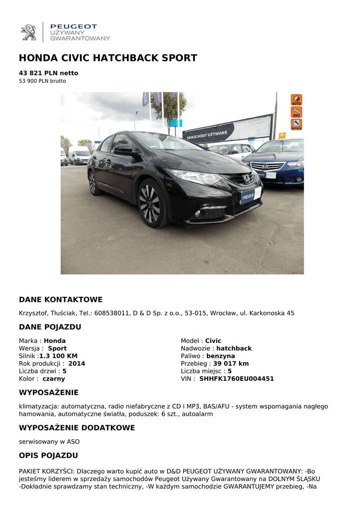 honda civic hatchback sport - Peugeot Używany Gwarantowany