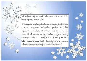 Pat wybiera się na sanki, ale przecież nikt nie lubi bawić się sam, prawda? ☺ Wykonaj dla niej kolegę lub koleżankę używając sztywnego papieru, skrawków materiału, guzików itd. Nie zapomnij o ciepłych ubraniach, przecież za oknem zima. Dodatkowo na małych kartkach wypisz nazwy zimowych ubrań (hat, scarf, mittens/gloves, jacket/coat, boots, trousers/jeans itd.). Elementy ubioru opiszesz ustnie podczas prezentacji w klasie. Powodzenia!!! I’ , ’ - L’ . T P, S’ . M , IT . T , I , I . M , C. W , I H , I' . SO, , D , N, GO MAKE A SNOWMAN, I ’ ,.