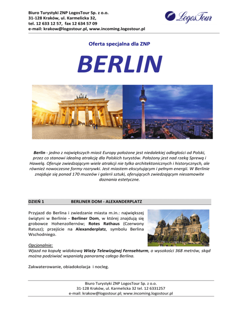 Biuro Turystyki ZNP LogosTour Sp. z o.o. 31-128 Kraków, ul. Karmelicka 32, tel. 12 633 12 57, fax 12 634 57 09 e-mail: [email protected], www.incoming.logostour.pl Oferta specjalna dla ZNP BERLIN Berlin - jedno z największych miast Europy położone jest niedalekiej odległości od Polski, przez co stanowi idealną atrakcję dla Polskich turystów. Położony jest nad rzeką Sprewą i Hawelą. Oferuje zwiedzającym wiele atrakcji nie tylko architektonicznych i historycznych, ale również nowoczesne formy rozrywki. Jest miastem ekscytującym i pełnym energii. W Berlinie znajduje się ponad 170 muzeów i galerii sztuki, oferujących zwiedzającym niesamowite doznania estetyczne. DZIEŃ 1 BERLINER DOM - ALEXANDERPLATZ Przyjazd do Berlina i zwiedzanie miasta m.in.: największej świątyni w Berlinie - Berliner Dom, w której znajdują się grobowce Hohenzollernów; Rotes Rathaus (Czerwony Ratusz); przejście na Alexanderplatz, symbolu Berlina Wschodniego. Opcjonalnie: Wjazd na kopułę widokową Wieży Telewizyjnej Fernsehturm, o wysokości 368 metrów, skąd można podziwiać wspaniałą panoramę całego Berlina. Zakwaterowanie, obiadokolacja i nocleg. Biuro Turystyki ZNP LogosTour Sp. z o.o. 31-128 Kraków, ul. Karmelicka 32 tel. 12 6331257 e-mail: [email protected]; www.incoming.logostour.pl DZIEŃ 2 BRAMA BRANDENBURSKA – REICHSTAG – UNTER DEN LINDEN Śniadanie. Dalsze zwiedzanie miasta, na trasie m.in.: Brama Brandenburska – wizytówka Berlina; Reichstag - obecnie gmach dostojnego XIX-wiecznego niemieckiego parlamentu Niemiec. Spacer aleją Unter den Linden najbardziej reprezentacyjną, ocienioną lipami ulicą Berlina na Wyspę Muzeów wpisaną na światową listę UNESCO – która stanowi dziś jeden z najważniejszych na świecie kompleksów muzealnych; Plac Poczdamski (główne centrum rozrywkowe Berlina). Opcjonalnie: • Zwiedzanie wnętrz jednego z berlińskich muzeów. Powrót do obiektu noclegowego. Obiadokolacja i nocleg. DZIEŃ 3 KOŚCIÓŁ PROTESTANCKI – CHARLOTTENBURG Śniadanie. Wykwaterowanie i wyjazd na dalsze zwiedzanie Berlina. W programie: pozostałości przypominającego o skutkach wojny protestanckiego kościoła Pamięci Cesarza Wilhelma. Charlottenburg - letnia rezydencja królów pruskich. Powrót do Polski w godzinach wieczornych. Cena od osoby: 425 zł Cena skalkulowana dla grupy 48 osób Termin: 2016 Cena zawiera: • 2 x nocleg w obiekcie klasy turystycznej • 2 x śniadanie • 2 x kolacja • Opiekę licencjonowanego pilota wycieczek podczas całego wyjazdu • Ubezpieczenie Signal Iduna KL, NNW, bagaż Biuro Turystyki ZNP LogosTour Sp. z o.o. 31-128 Kraków, ul. Karmelicka 32 tel. 12 6331257 e-mail: [email protected]; www.incoming.logostour.pl