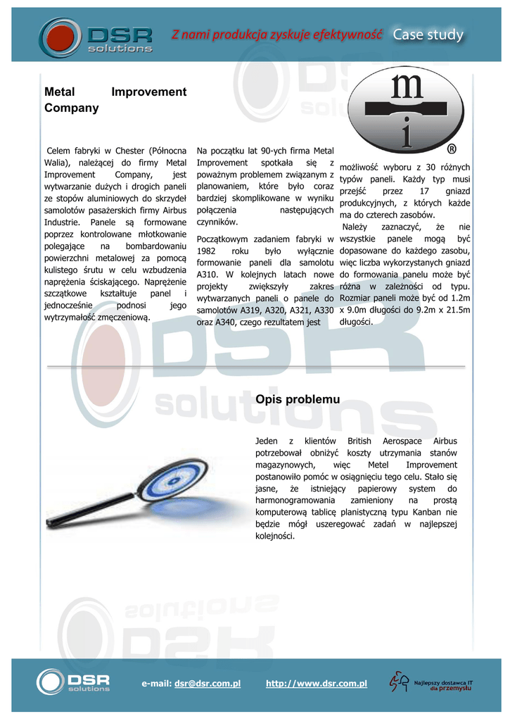 Z nami produkcja zyskuje efektywność Metal Company Improvement Celem fabryki w Chester (Północna Walia), należącej do firmy Metal Improvement Company, jest wytwarzanie dużych i drogich paneli ze stopów aluminiowych do skrzydeł samolotów pasażerskich firmy Airbus Industrie. Panele są formowane poprzez kontrolowane młotkowanie polegające na bombardowaniu powierzchni metalowej za pomocą kulistego śrutu w celu wzbudzenia naprężenia ściskającego. Naprężenie szczątkowe kształtuje panel i jednocześnie podnosi jego wytrzymałość zmęczeniową. Na początku lat 90-ych firma Metal Improvement spotkała się z poważnym problemem związanym z planowaniem, które było coraz bardziej skomplikowane w wyniku połączenia następujących czynników. Początkowym zadaniem fabryki w 1982 roku było wyłącznie formowanie paneli dla samolotu A310. W kolejnych latach nowe projekty zwiększyły zakres wytwarzanych paneli o panele do samolotów A319, A320, A321, A330 oraz A340, czego rezultatem jest możliwość wyboru z 30 różnych typów paneli. Każdy typ musi przejść przez 17 gniazd produkcyjnych, z których każde ma do czterech zasobów. Należy zaznaczyć, że nie wszystkie panele mogą być dopasowane do każdego zasobu, więc liczba wykorzystanych gniazd do formowania panelu może być różna w zależności od typu. Rozmiar paneli może być od 1.2m x 9.0m długości do 9.2m x 21.5m długości. Opis problemu Jeden z klientów British Aerospace Airbus potrzebował obniżyć koszty utrzymania stanów magazynowych, więc Metel Improvement postanowiło pomóc w osiągnięciu tego celu. Stało się jasne, że istniejący papierowy system do harmonogramowania zamieniony na prostą komputerową tablicę planistyczną typu Kanban nie będzie mógł uszeregować zadań w najlepszej kolejności. e-mail: [email protected] http://www.dsr.com.pl biuro: [email protected] www.dsr.com.pl Z nami produkcja zyskuje efektywność Rozwiązanie problemu Rozpoczęto poszukiwania komputerowego systemu do harmonogramowania operacji w zakładzie formującym panele dla Airbusa. Zostało przetestowanych wiele systemów, ale bez sukcesu, gdyż albo były zbyt kosztowne albo oferowały zbyt małe możliwości. Mimo tego skonstruowano krótką listę złożoną z trzech systemów i przystąpiono do wielomiesięcznych dyskusji nad kontraktem. Głównym powodem problemów było oferowanie przez te systemy "wszystkich opcji na raz", co znacznie podnosiło cenę poza ustalony budżet. Dwóch dostawców było gotowych zaoferować limitowane wersje, ale koszty nadal pozostawały wysokie. Na wiosnę roku 1994 Preactor International zaprezentował system Preactor 200 FCS, którego cena była tylko ułamkiem cen poprzednio oglądanych systemów. Dawał on firmie Metal Improvement możliwość harmonogramowania przejścia paneli przez fabrykę bez potrzeby zakupu niechcianych opcji oferowanych przez inne systemy. Decyzja o wyborze Preactor zapadła w lipcu 1994, a instalacja została zakończona w połowie sierpnia. Pod koniec września Preactor 200 FCS działał równocześnie ze starym systemem, a pod koniec października już sam harmonogramował wszystkie panele jako samodzielny system. Pomimo tego, że nie wszystkie komponenty są produkowane w krótszym czasie niż w dniach przedpreactorowych, (były momenty, że zasoby były w pełni wykorzystywane), to należy zaznaczyć, że możliwe jest teraz bardziej dokładne określenie dat wykonania prac, co przekłada się na zmniejszenie stanów magazynowych drogich materiałów. Obliczono, że poziom stanów magazynowych obniżył się o 25%. Preactor jest przyjazny dla użytkownika i to było podstawowym czynnikiem jego szybkiego uruchomienia w Metal Improvment. System był skonfigurowany przez dyrektora ds. produkcji (który przyznał się do słabej znajomości komputerów) z pomocą konsultantów Preactor International. Chęć dostosowania programu przez Preactor International do potrzeb MIC było czynnikiem zapewniającym przychylność personelu warsztatu produkcyjnego do nowego rozwiązania. e-mail: [email protected] http://www.dsr.com.pl biuro: [email protected] www.dsr.com.pl