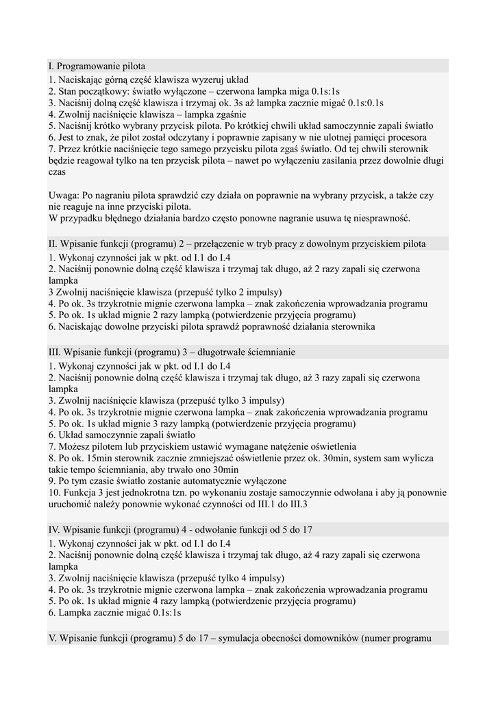 I. Programowanie pilota 1. Naciskając górną część klawisza wyzeruj układ 2. Stan początkowy: światło wyłączone – czerwona lampka miga 0.1s:1s 3. Naciśnij dolną część klawisza i trzymaj ok. 3s aż lampka zacznie migać 0.1s:0.1s 4. Zwolnij naciśnięcie klawisza – lampka zgaśnie 5. Naciśnij krótko wybrany przycisk pilota. Po krótkiej chwili układ samoczynnie zapali światło 6. Jest to znak, że pilot został odczytany i poprawnie zapisany w nie ulotnej pamięci procesora 7. Przez krótkie naciśnięcie tego samego przycisku pilota zgaś światło. Od tej chwili sterownik będzie reagował tylko na ten przycisk pilota – nawet po wyłączeniu zasilania przez dowolnie długi czas Uwaga: Po nagraniu pilota sprawdzić czy działa on poprawnie na wybrany przycisk, a także czy nie reaguje na inne przyciski pilota. W przypadku błędnego działania bardzo często ponowne nagranie usuwa tę niesprawność. II. Wpisanie funkcji (programu) 2 – przełączenie w tryb pracy z dowolnym przyciskiem pilota 1. Wykonaj czynności jak w pkt. od I.1 do I.4 2. Naciśnij ponownie dolną część klawisza i trzymaj tak długo, aż 2 razy zapali się czerwona lampka 3 Zwolnij naciśnięcie klawisza (przepuść tylko 2 impulsy) 4. Po ok. 3s trzykrotnie mignie czerwona lampka – znak zakończenia wprowadzania programu 5. Po ok. 1s układ mignie 2 razy lampką (potwierdzenie przyjęcia programu) 6. Naciskając dowolne przyciski pilota sprawdź poprawność działania sterownika III. Wpisanie funkcji (programu) 3 – długotrwałe ściemnianie 1. Wykonaj czynności jak w pkt. od I.1 do I.4 2. Naciśnij ponownie dolną część klawisza i trzymaj tak długo, aż 3 razy zapali się czerwona lampka 3. Zwolnij naciśnięcie klawisza (przepuść tylko 3 impulsy) 4. Po ok. 3s trzykrotnie mignie czerwona lampka – znak zakończenia wprowadzania programu 5. Po ok. 1s układ mignie 3 razy lampką (potwierdzenie przyjęcia programu) 6. Układ samoczynnie zapali światło 7. Możesz pilotem lub przyciskiem ustawić wymagane natężenie oświetlenia 8. Po ok. 15min sterownik zacznie zmniejszać oświetlenie przez ok. 30min, system sam wylicza takie tempo ściemniania, aby trwało ono 30min 9. Po tym czasie światło zostanie automatycznie wyłączone 10. Funkcja 3 jest jednokrotna tzn. po wykonaniu zostaje samoczynnie odwołana i aby ją ponownie uruchomić należy ponownie wykonać czynności od III.1 do III.3 IV. Wpisanie funkcji (programu) 4 - odwołanie funkcji od 5 do 17 1. Wykonaj czynności jak w pkt. od I.1 do I.4 2. Naciśnij ponownie dolną część klawisza i trzymaj tak długo, aż 4 razy zapali się czerwona lampka 3. Zwolnij naciśnięcie klawisza (przepuść tylko 4 impulsy) 4. Po ok. 3s trzykrotnie mignie czerwona lampka – znak zakończenia wprowadzania programu 5. Po ok. 1s układ mignie 4 razy lampką (potwierdzenie przyjęcia programu) 6. Lampka zacznie migać 0.1s:1s V. Wpisanie funkcji (programu) 5 do 17 – symulacja obecności domowników (numer programu jest liczbą godzin między kolejnymi zapaleniami światła po zmierzchu – dla funkcji nr 5 zapalenie światła następuje tylko raz w ciągu doby (po zapadnięciu zmierzchu) 1. Wykonaj czynności jak w pkt. od I.1 do I.4 2. Naciśnij ponownie dolną część klawisza i trzymaj tak długo, aż tyle razy zapali się czerwona lampka jaki numer programu chcesz wpisać 3. Zwolnij naciśnięcie klawisza (przepuść tylko ilość impulsów równą numerowi programu) 4. Po ok. 3s trzykrotnie mignie czerwona lampka – znak zakończenia wprowadzania programu 5. Po ok. 1s układ mignie tyle razy lampką jaki numer programu został wpisany (potwierdzenie przyjęcia programu) 6. Po zapadnięciu zmroku (na podstawie informacji z fotorezystora) układ włączy samoczynnie na ok. 100min. oświetlenie na poziomie 75% mocy, jednocześnie od tego momentu nastąpi odliczanie czasu równego (nr programu) x 60min. 7. Po odliczeniu czasu nastąpi znowu włączenie oświetlenia na 100min. 8. Po 30 minutach od świtu układ jest gotowy do powtórzenia cyklu w następnej dobie 9. Funkcja nr 5 włącza światło tylko raz w ciągu doby (po zapadnięciu zmierzchu na ok. 100min) Uwagi: 1. Funkcje od 5 do 17 są zapamiętywane w nie ulotnej pamięci systemu i pozostają aktywne także po dowolnie długiej przerwie zasilania - także nie odwołuje ich zerowanie systemu. 2. Funkcje te odwołać można tylko przez wpisanie funkcji nr 4 UWAGI Programowania można dokonać tylko przy wyłączonym świetle