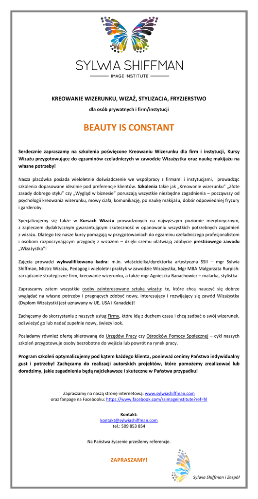 KREOWANIE WIZERUNKU, WIZAŻ, STYLIZACJA, FRYZJERSTWO dla osób prywatnych i firm/instytucji BEAUTY IS CONSTANT Serdecznie zapraszamy na szkolenia poświęcone Kreowaniu Wizerunku dla firm i instytucji, Kursy Wizażu przygotowujące do egzaminów czeladniczych w zawodzie Wizażystka oraz naukę makijażu na własne potrzeby! Nasza placówka posiada wieloletnie doświadczenie we współpracy z firmami i instytucjami, prowadząc szkolenia dopasowane idealnie pod preferencje klientów. Szkolenia takie jak „Kreowanie wizerunku” „Złote zasady dobrego stylu” czy „Wygląd w biznesie” poruszają wszystkie niezbędne zagadnienia – począwszy od psychologii kreowania wizerunku, mowy ciała, komunikację, po naukę makijażu, dobór odpowiedniej fryzury i garderoby. Specjalizujemy się także w Kursach Wizażu prowadzonych na najwyższym poziomie merytorycznym, z zapleczem dydaktycznym gwarantującym skuteczność w opanowaniu wszystkich potrzebnych zagadnień z wizażu. Dlatego też nasze kursy pomagają w przygotowaniach do egzaminu czeladniczego profesjonalistom i osobom rozpoczynającym przygodę z wizażem – dzięki czemu ułatwiają zdobycie prestiżowego zawodu „Wizażystka”! Zajęcia prowadzi wykwalifikowana kadra: m.in. właścicielka/dyrektorka artystyczna SSII – mgr Sylwia Shiffman, Mistrz Wizażu, Pedagog i wieloletni praktyk w zawodzie Wizażystka, Mgr MBA Małgorzata Rurpich: zarządzanie strategiczne firm, kreowanie wizerunku, a także mgr Agnieszka Banachowicz – malarka, stylistka. Zapraszamy zatem wszystkie osoby zainteresowane sztuką wizażu: te, które chcą nauczyć się dobrze wyglądać na własne potrzeby i pragnących zdobyć nowy, interesujący i rozwijający się zawód Wizażystka (Dyplom Wizażystki jest uznawany w UE, USA i Kanadzie)! Zachęcamy do skorzystania z naszych usług Firmy, które idą z duchem czasu i chcą zadbać o swój wizerunek, odświeżyć go lub nadać zupełnie nowy, świeży look. Posiadamy również ofertę skierowaną do Urzędów Pracy czy Ośrodków Pomocy Społecznej – cykl naszych szkoleń przygotowuje osoby bezrobotne do wejścia lub powrót na rynek pracy. Program szkoleń optymalizujemy pod kątem każdego klienta, ponieważ cenimy Państwa indywidualny gust i potrzeby! Zachęcamy do realizacji autorskich projektów, które pomożemy zrealizować lub doradzimy, jakie zagadnienia będą najciekawsze i skuteczne w Państwa przypadku! Zapraszamy na naszą stronę internetową: www.sylwiashiffman.com oraz fanpage na Facebooku: https://www.facebook.com/ssimageinstitute?ref=hl Kontakt: [email protected] tel.: 509 853 854 Na Państwa życzenie prześlemy referencje. ZAPRASZAMY! Sylwia Shiffman i Zespół