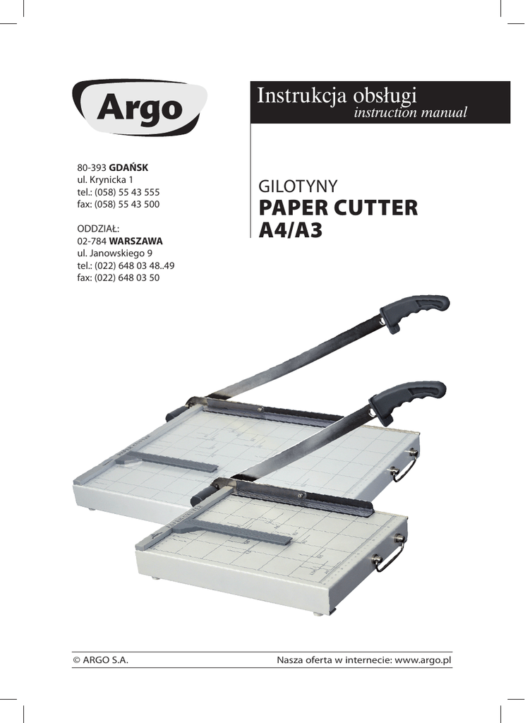 Instrukcja obsługi 80-393 GDAŃSK ul. Krynicka 1 tel.: (058) 55 43 555 fax: (058) 55 43 500 ODDZIAŁ: 02-784 WARSZAWA ul. Janowskiego 9 tel.: (022) 648 03 48..49 fax: (022) 648 03 50 © ARGO S.A. instruction manual Gilotyny Paper Cutter A4/A3 Nasza oferta w internecie: www.argo.pl Gilotyny Paper Cutter A4/A3 Model Paper Cutter A4 Paper Cutter A3 310 420 12 12 310x250 460x380 Długość cięcia (mm) Max. Ilość ciętych kartek (70g/m ) 2 Wymiary blatu (mm) ISTOTNE WSKAZÓWKI • Przed użyciem przeczytaj instrukcję. • Urządzenie nie jest przeznaczone do użytkowania przez dzieci. Przechowuj gilotynę w • • • miejscu niedostępnym dla dzieci. Urządzenie przeznaczone do cięcia papieru. Nie używaj urządzenia niezgodnie z jego przeznaczeniem. Trzymaj ręce z daleka od ostrza, aby uniknąć skaleczenia. Trzymaj biżuterię, krawaty, luźne przedmioty etc. z daleka od ostrza, tak by uniknąć uszkodzenia urządzenia. W celu uniknięcia zniszczenia urządzenia: • • • • Zawsze usuwaj z dokumentu spinacze i zszywki. Nigdy nie zwilżaj ostrza. Nie narażaj urządzenia na działanie wody. Nie używaj wody, ani innych płynnych substancji do czyszczenia urządzenia. W celu uniknięcia skaleczenia: • • • • • Nie przenoś urządzenia trzymając za ostrze. Sprawdź czy ostrze jest zabezpieczone, w czasie gdy urządzenie nie jest używane. Zawsze stawiaj urządzenie na płaskiej, stabilnej powierzchni. Nie wieszaj urządzenia. Urządzenie przeznaczone do użytku wewnętrznego. Nie stosować na zewnątrz. Zachowaj instrukcję, by móc odnieść się do niej w przyszłości. UWAGA! Jeżeli gilotyna nie jest używana, jej ostrze powinno znajdować się na dole, tj. w pozycji poziomej. UŻYTKOWANIE W przypadku cięcia jednorazowo ilości kartek zbliżonych do ilości maksymalnych zaleca się cięcie również małych ilości kartek, co pozwoli na samoostrzenie się noża poprzez kontakt ostrza z przeciwostrzem. We wszystkich gilotynach z nożem łukowatym występuje zasada, że im większa ilość kartek ciętych jednorazowo, tym jakość cięcia jest mniejsza. © ARGO S.A. Nasza oferta w internecie: www.argo.pl Polski OBSŁUGA Ustaw gilotynę poziomo na stabilnym blacie. Podnieś ostrze do góry do oporu. Umieść papier w gilotynie, układając go wzdłuż poziomej prowadnicy. Dostosuj papier do wybranego formatu przy pomocy magnetycznego ogranicznika papieru. Ujednolicone formaty papieru narysowane są na blacie. 5. Przytrzymaj papier lewą ręką, a prawą opuść ostrze. 6. Po zakończeniu używania gilotyny zabezpiecz ostrze zamkiem zabezpieczającym 1. 2. 3. 4. KONSERWACJA Gilotynę można czyścić suchą szmatką i pokrywać woskiem samochodowym. Nie używaj w żadnym wypadku rozpuszczalników i wody. Od czasu do czasu posmaruj ostrze olejem silikonowym lub płynną wazeliną, używając szmatki. To zapewni gładką pracę noży i ochroni stal przed rdzewieniem. USTERKI W przypadku wystąpienia usterki, urządzenie wraz z kartą gwarancyjną i opisem uszkodzenia należy przekazać sprzedawcy, lub do najbliższego autoryzowanego serwisu. Urządzenie może być przekazane do naprawy dalej, dlatego też użytkownik powinien zachować oryginalne i kompletne opakowanie. W przypadku przekazania urządzenia do naprawy w nieoryginalnym lub niekompletnym opakowaniu ryzyko uszkodzenia urządzenia podczas transportu ponosi nabywca. Dlatego też w przypadku braku oryginalnego opakowania w interesie nabywcy leży wykonanie jak najlepszego opakowania zastępczego. © ARGO S.A. Nasza oferta w internecie: www.argo.pl 3 © ARGO S.A. Nasza oferta w internecie: www.argo.pl