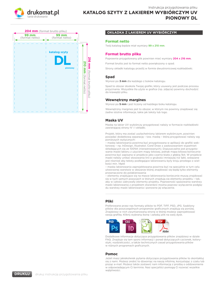 Instrukcja przygotowania pliku drukomat.pl tanie drukowanie KATALOG SZYTY Z LAKIEREM WYBIÓRCZYM UV PIONOWY DL 204 mm (format brutto pliku) 99 mm 99 mm (format netto) OKŁADKA Z LAKIEREM UV WYBIÓRCZYM (format netto) Format netto Twój katalog będzie miał wymiary 99 x 210 mm. drukomat.pl tanie drukowanie katalog szyty pionowy 216 mm (format brutto pliku) 210 mm (format netto) DL Format brutto pliku Poprawnie przygotowany plik powinien mieć wymiary 204 x 216 mm. Format brutto jest to format netto powiększony o spad. Strony okładki katalogu prześlij w formie dwustronicowej rozkładówki. Spad Wynosi po 3 mm dla każdego z boków katalogu. Spad to obszar dookoła Twojej grafiki, który usuwany jest podczas procesu przycinania. Wszystkie tła użyte w grafice (np. zdjęcia) powinny dochodzić do krawędzi pliku. Wewnętrzny margines Wynosi po 5 mm i jest liczony od każdego boku katalogu. Wewnętrzny margines jest to obszar, w którym nie powinny znajdować się żadne istotne informacje, takie jak teksty lub logo. Maska UV Maskę na lakier UV wybiórczy przygotować należy w formacie rozkładówki zawierającej strony IV i I okładki. Projekt, który ma zostać uszlachetniony lakierem wybiórczym, powinien posiadać dodatkową separację – tzw. maskę – którą przygotować należy wg poniższych wytycznych: – maska lakierowania powinna być przygotowana w aplikacji do grafiki wektorowej – np. InDesign, Illustrator, Corel Draw z zastosowaniem wypełnień składających się ze 100%K (nierastrowanych). Dopuszczalne jest przygotowanie maski lakieru z użyciem mapy bitowej, jednak mapa bitowa koniecznie powinna być zapisana w projekcie jako czarno-biała z głębią 1bit. W projekcie maski należy unikać stosowania linii o grubości mniejszej niż 1pkt, wskazane jest również aby teksty podlegające lakierowaniu były kroju prostego o wielkości min. 14pkt – maska lakierowania zaprojektowana powinna być na specjalnie w tym celu utworzonej warstwie w obszarze której znajdować się będą tylko elementy przeznaczone do polakierowania – elementy znajdujące się na masce lakierowania koniecznie muszą znajdować się w tych samych pozycjach w których znajdują się elementy projektu – tak, aby w całości zakrywały elementy projektu. Poprawność spasowania warstwy maski lakierowania z projektem stwierdzić można poprzez wyłączenie podglądu warstwy maski lakierowania i ponowne jej włączenie. Pliki Preferowane przez nas formaty plików to PDF, TIFF, PSD, JPG. Szablony plików dla poszczególnych programów graficznych znajdują się poniżej. Znajdziesz w nich zwymiarowaną stronę w której możesz zaprojektować swoją grafikę. Kliknij wybraną ikonę i załaduj plik na swój dysk. Dodatkowe informacje dotyczące przygotowania plików znajdziesz w dziale FAQ. Znajduje się tam sporo informacji i porad dotyczących czcionek, kolorystyki, rozdzielczości, a także technicznych zasad przygotowania plików w różnych programach graficznych. Pomoc DRUKUJ Jeżeli masz jakiekolwiek pytania dotyczące przygotowania plików to skontaktuj się z nami. Możesz zrobić to dzwoniąc na naszą infolinię, korzystając z czatu lub pisząc e-mail. Możesz także zostawić nam informację z prośbą o oddzwonienie w odpowiadającym Ci terminie. Nasi specjaliści pomogą Ci rozwiać wszelkie wątpliwości. drukuj instrukcję przygotowania pliku Instrukcja przygotowania pliku drukomat.pl tanie drukowanie KATALOG SZYTY Z LAKIEREM WYBIÓRCZYM UV PIONOWY DL STRONY ad WEWNĘTRZNE Exero od te feu feugiamet do odiamconsent augaitFormat la feugiam 99 mm (format netto) netto commod eu facilissedTwójtin etbędzie lumkatalog miał wymiary 99 x 210 mm. drukomat.pl tanie drukowanie san henibh eum at dolut venit noFormat brutto pliku katalog szyty strud tat nulput prat, Poprawnie quamet lore plik powinien mieć wymiary 105 x 216 mm. przygotowany Format brutto jest to format netto powiększony o spad. te doloreet, vel dolesto dolenis Strony wewnętrzne katalogu prześlij w pliku wielostronicowym dit praessequate (ilość stron pliku = ilość stron wnętrza). 105 mm (format brutto pliku) pionowy Exero od te feu feugiamet ad do odiamconsent augait la feugiam commod eu facilissed tin et lumsan henibh eum at dolut venit nostrud tat nulput prat, quamet lore te doloreet, vel dolesto dolenis dit praessequate 216 mm (format brutto pliku) 210 mm (format netto) DL Spad Wynosi po 3 mm dla każdego z boków katalogu. Spad to obszar dookoła Twojej grafiki, który usuwany jest podczas procesu przycinania. Wszystkie tła użyte w grafice (np. zdjęcia) powinny dochodzić do krawędzi pliku. Wewnętrzny margines Exero od te feu lorem ipsum te fu feugiamet admen Exero od feugiamet 3 mm (spad) 5 mm (wewnętrzny margines) Wynosi po 5 mm i jest liczony od każdego boku katalogu. Uwaga - przy pracach w gramaturze wnętrza 130g i 170g i objętości powyżej 32 stron wymagany jest margines 8 mm. Wewnętrzny margines jest to obszar, w którym nie powinny znajdować się żadne istotne informacje, takie jak teksty lub logo. Pliki Preferowane przez nas formaty plików to PDF, TIFF, PSD, JPG. Szablony plików dla poszczególnych programów graficznych znajdują się poniżej. Znajdziesz w nich zwymiarowaną stronę w której możesz zaprojektować swoją grafikę. Kliknij wybraną ikonę i załaduj plik na swój dysk. Dodatkowe informacje dotyczące przygotowania plików znajdziesz w dziale FAQ. Znajduje się tam sporo informacji i porad dotyczących czcionek, kolorystyki, rozdzielczości, a także technicznych zasad przygotowania plików w różnych programach graficznych. Pomoc DRUKUJ drukuj instrukcję przygotowania pliku Jeżeli masz jakiekolwiek pytania dotyczące przygotowania plików to skontaktuj się z nami. Możesz zrobić to dzwoniąc na naszą infolinię, korzystając z czatu lub pisząc e-mail. Możesz także zostawić nam informację z prośbą o oddzwonienie w odpowiadającym Ci terminie. Nasi specja