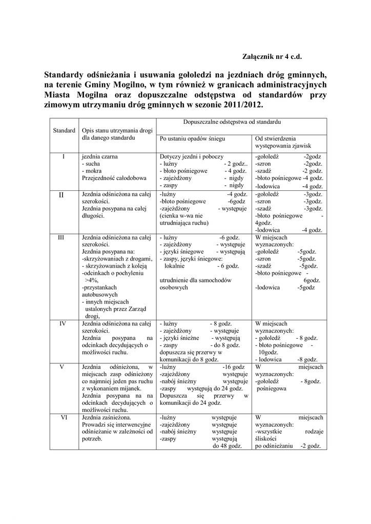Załącznik nr 4 c.d. Standardy odśnieżania i usuwania gołoledzi na jezdniach dróg gminnych, na terenie Gminy Mogilno, w tym również w granicach administracyjnych Miasta Mogilna oraz dopuszczalne odstępstwa od standardów przy zimowym utrzymaniu dróg gminnych w sezonie 2011/2012. Dopuszczalne odstępstwa od standardu Standard I Opis stanu utrzymania drogi dla danego standardu jezdnia czarna - sucha - mokra Przejezdność całodobowa II Jezdnia odśnieżona na całej szerokości. Jezdnia posypana na całej długości. III Jezdnia odśnieżona na całej szerokości. Jezdnia posypana na: -skrzyżowaniach z drogami, - skrzyżowaniach z koleją -odcinkach o pochyleniu >4%, -przystankach autobusowych - innych miejscach ustalonych przez Zarząd drogi, Jezdnia odśnieżona na całej szerokości. Jezdnia posypana na odcinkach decydujących o możliwości ruchu. IV V VI Jezdnia odśnieżona, w miejscach zasp odśnieżony co najmniej jeden pas ruchu z wykonaniem mijanek. Jezdnia posypana na na odcinkach decydujących o możliwości ruchu. Jezdnia zaśnieżona. Prowadzi się interwencyjne odśnieżanie w zależności od potrzeb. Po ustaniu opadów śniegu Od stwierdzenia występowania zjawisk Dotyczy jezdni i poboczy - luźny - 2 godz.. - błoto pośniegowe - 4 godz. - zajeżdżony - nigdy - zaspy - nigdy -luźny -4 godz. -błoto pośniegowe -6godz -zajeżdżony - występuje (cienka w-wa nie utrudniająca ruchu) -gołoledź -2godz -szron -2godz. -szadź -2 godz. -błoto pośniegowe -4 godz. -lodowica -4 godz. -gołoledź -3godz. -szron -3godz. -szadź -3godz. -błoto pośniegowe 4godz. -lodowica -4 godz. W miejscach wyznaczonych: -gołoledź -5godz. -szron -5godz. -szadź -5godz. -błoto pośniegowe 6godz. -lodowica -5godz - luźny -6 godz. - zajeżdżony - występuje - języki śniegowe - występują - zaspy, języki śniegowe: lokalnie - 6 godz. utrudnienie dla samochodów osobowych - luźny - 8 godz. - zajeżdżony - występuje - języki śnieżne - występują - zaspy - do 8 godz. dopuszcza się przerwy w komunikacji do 8 godz. -luźny -16 godz -zajeżdżony występuje -nabój śnieżny występuje -zaspy występują do 24 godz. Dopuszcza się przerwy w komunikacji do 24 godz. W miejscach wyznaczonych: - gołoledź - 8 godz. - błoto pośniegowe 10godz. - lodowica -8 godz. W miejscach wyznaczonych: -gołoledź - 8godz. pośniegowa -luźny -zajeżdżony -nabój śnieżny -zaspy W miejscach wyznaczonych: -wszystkie rodzaje śliskości po odśnieżaniu -2 godz. występuje występuje występuje występują do 48 godz. Załącznik nr 4 ZIMOWE UTRZYMANIE JEZDNI DRÓG GMINNYCH NA TERENIE GMINY MOGILNO 1) Drogi gminne na terenie Gminy Mogilno, łącznie z drogami w granicach administracyjnych miasta Mogilna utrzymywane są w sezonie zimowym w oparciu o standardy wymienione w zamieszczonym poniżej dokumencie pn.„Standardy odśnieżania i usuwania gołoledzi na jezdniach dróg gminnych, na terenie Gminy Mogilno, w tym również w granicach administracyjnych Miasta Mogilna oraz dopuszczalne odstępstwa od standardów przy zimowym utrzymaniu dróg gminnych w sezonie 2011/2012.” 2) Zimowe utrzymanie dróg obejmuje prace mające na celu zmniejszenie lub ograniczenie zakłóceń ruchu drogowego wywołanych takimi czynnikami atmosferycznymi, jak śliskość zimowa, opady śniegu, gołoledź, szron, szadź, błoto pośniegowe, lodowica. 3) Ustala się, że w zakresie zimowego utrzymania dróg obowiązuje 6 standardów. Poszczególnym standardom przypisane są minimalne poziomy utrzymania powierzchni jezdni oraz dopuszczalne odstępstwa od standardu w warunkach występowania opadów śniegu lub śliskości zimowej, jak również dopuszczalny maksymalny czas występowania tych odstępstw. Przypadki kiedy osiągnięcie utrzymania standardu docelowego może być niewykonalne, mogą dotyczyć wyłącznie sytuacji występowania skrajnie niekorzystnych i nieustabilizowanych warunków pogodowych (zawieje, zamiecie śnieżne, długotrwałe burze śnieżne niweczące efekty odśnieżania dróg).