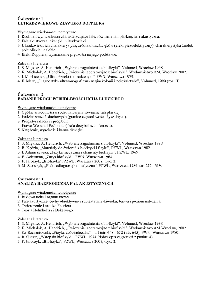 Ćwiczenie nr 1 ULTRADŹWIĘKOWE ZJAWISKO DOPPLERA Wymagane wiadomości teoretyczne 1. Ruch falowy, wielkości charakteryzujące fale, równanie fali płaskiej, fala akustyczna. 2. Fale akustyczne: dźwięki i ultradźwięki. 3. Ultradźwięki, ich charakterystyka, źródła ultradźwięków (efekt piezoelektryczny), charakterystyka źródeł: pole bliskie i dalekie. 4. Efekt Dopplera, wyznaczanie prędkości na jego podstawie. Zalecana literatura 1. S. Miękisz, A. Hendrich, „Wybrane zagadnienia z biofizyki”, Volumed, Wrocław 1998. 2. K. Michalak, A. Hendrich, „Ćwiczenia laboratoryjne z biofizyki”, Wydawnictwo AM, Wrocław 2002. 3. I. Markiewicz, „Ultradźwięki i infradźwięki”, PWN, Warszawa 1979. 4. E. Merz, „Diagnostyka ultrasonograficzna w ginekologii i położnictwie”, Volumed, 1999 (roz. II). Ćwiczenie nr 2 BADANIE PROGU POBUDLIWOŚCI UCHA LUDZKIEGO Wymagane wiadomości teoretyczne 1. Ogólne wiadomości o ruchu falowym, równanie fali płaskiej. 2. Podział wrażeń słuchowych (granice częstotliwości słyszalnych). 3. Próg słyszalności i próg bólu. 4. Prawo Webera i Fechnera (skala decybelowa i fonowa). 5. Natężenie, wysokość i barwa dźwięku. Zalecana literatura 1. S. Miękisz, A. Hendrich, „Wybrane zagadnienia z biofizyki”, Volumed, Wrocław 1998. 2. B. Kędzia, „Materiały do ćwiczeń z biofizyki i fizyki”, PZWL, Warszawa 1982. 3. I. Adamczewski, „Fizyka medyczna i elementy biofizyki”, PZWL, 1969. 4. E. Ackerman, „Zarys biofizyki”, PWN, Warszawa 1968. 5. F. Jaroszyk, „Biofizyka”, PZWL, Warszawa 2008, wyd. 2. 6. M. Stopczyk, „Elektrodiagnostyka medyczna”, PZWL, Warszawa 1984, str. 272 - 319. Ćwiczenie nr 3 ANALIZA HARMONICZNA FAL AKUSTYCZNYCH Wymagane wiadomości teoretyczne 1. Budowa ucha i organu mowy. 2. Fale akustyczne, cechy obiektywne i subiektywne dźwięku; barwa i poziom natężenia. 3. Twierdzenie i analiza Fouriera. 4. Teoria Helmholtza i Bekesyego. Zalecana literatura 1. S. Miękisz, A. Hendrich, „Wybrane zagadnienia z biofizyki”, Volumed, Wrocław 1998. 2. K. Michalak, A. Hendrich, „Ćwiczenia laboratoryjne z biofizyki”, Wydawnictwo AM Wrocław, 2002 3. Sz. Szczeniowski, „Fizyka doświadczalna” - t. I (str. 648 - 652 i str. 645), PWN, Warszawa 1980. 4. R. Glaser, „Wstęp do biofizyki”, PZWL, 1974 (dobry opis zagadnień z punktu 4). 5. F. Jaroszyk, „Biofizyka”, PZWL, Warszawa 2008, wyd. 2. Ćwiczenie nr 5 WYZNACZANIE CIĘŻARU CZĄSTECZKOWEGO MAKROCZĄSTECZEK Z POMIARU LEPKOŚCI ROZTWORU KOLOIDALNEGO Wymagane wiadomości teoretyczne 1. Lepkość cieczy - prawo Newtona - współczynnik lepkości, jednostki lepkości. 2. Prawo Poisseuille’a, metoda Ostwalda pomiaru lepkości. 3. Dlaczego lepkość roztworów polimerów zależy od stężenia? 4. Czynniki wpływające na wielkość lepkości granicznej. 5. Rodzaje oddziaływań międzycząsteczkowych. 6. Co to jest solwatacja i jaki jest jej wpływ na lepkość? Zalecana literatura 1. G. M. Barrow, „Chemia fizyczna”, 1978. 2. M. Bryszewska, W. Leyko, „Biofizyka dla biologów”, PWN,1997. 3. T. Dryński, „Ćwiczenia laboratoryjne z fizyki”, PWN, 1978. 4. L. Sobczyk, A. Kisza, „Chemia fizyczna dla przyrodników”, PWN, 1975. 5. B. Kędzia, „Materiały do ćwiczeń z biofizyki i fizyki”, PZWL, Warszawa 1982. Ćwiczenie nr 6 BADANIE WŁASNOŚCI FAL ELEKTOMAGNETYCZNYCH Wymagane wiadomości teoretyczne 1. Natura światła. 2. Teoria promieniowania laserowego i jego właściwości (pojęcia: inwersja obsadzeń, pompowanie optyczne; charakterystyka pracy lasera). 3. Polaryzacja światła. 4. Prawo Malusa. 5. Zastosowanie promieniowania laserowego w medycynie i stomatologii. 6. Główne metody pomiaru prędkości światła. 7. Zjawisko całkowitego wewnętrznego odbicia. 8. Zasada działania światłowodu. 9. Zastosowanie światłowodów w medycynie (endoskopia). 10. Podstawowe wielkości i jednostki świetlne. 11. Prawo Lamberta. Zalecana literatura: 1. M.A. Herman, A. Kalestyński, L. Widomski, „Podstawy fizyki dla kandydatów na wyższe uczelnie i studentów”, PWN, Warszawa 1995. 2. F. Jaroszyk, „Biofizyka”, PZWL, Warszawa 2008, wyd. 2. 3. „Encyklopedia fizyki współczesnej”, PWN, Warszawa 1983. 4. „Fizyczne metody diagnostyki medycznej i terapii”, pod redakcją A. Z. Hryniewicz i E. Rokity, PWN, Warszawa 2000. 5. „Fotodynamiczna metoda rozpoznawania i leczenia nowotworów”, pod redakcją A. Graczyk, Dom Wydawniczy Bellona, Warszawa 1999. 6. T. Dryński , „Ćwiczenia laboratoryjne z fizyki”, PWN, Warszawa 1980. Ćwiczenie nr 8 SONDA ULTRADŹWIĘKOWA Wymagane wiadomości teoretyczne 1. Ultradźwięk jako fala mechaniczna. Długość, częstotliwość i prędkość rozchodzenia się fali ultradźwiękowej. 2. Echolokacja impulsowa jako metoda umożliwiająca lokalizację przestrzenną elementów anatomicznych w obrazowaniu ultrasonograficznym. Osiowa zdolność rozdzielcza i jej zależność od częstotliwości ultradźwięku. 3. Ultrasonograficzne prezentacje A i B. 4. Artefakty obrazu USG. Zalecana literatura 1. S. Miękisz i A. Hendrich, „Zastosowanie ultradźwięków w medycynie, w: Wybrane zagadnienia z biofizyki”, Volumed, 1998. 2. E. Merz , „Diagnostyka ultrasonograficzna w ginekologii i położnictwie”, Urban&Partner, 1999, (roz. 2). Ćwiczenie nr 9 SYMULACJA POMIARÓW MIKROKALORYMETRYCZNYCH PRZEMIAN FAZOWYCH LIPIDÓW Wymagane wiadomości teoretyczne 1. Budowa błon biologicznych 2. Przemiany fazowe lipidów i ich znaczenie w układach biologicznych. 3. Kalorymetria. Zasada działania mikrokalorymetru różnicowego. 4. Znajomość następujących pojęć i zasad fizyki: entalpia, energia swobodna, I i II zasada termodynamiki. Zalecana literatura 1. M. Bryszewska, W. Leyko, „Biofizyka dla biologów”, PWN, Warszawa 1997. 2. S. Miękisz, A. Hendrich, „Wybrane zagadnienia z biofizyki”, Volumed, Wrocław 1998. Ćwiczenie nr 10 KOMPUTEROWA SYMULACJA POTENCJAŁU CZYNNOŚCIOWEGO AKSONU Wym